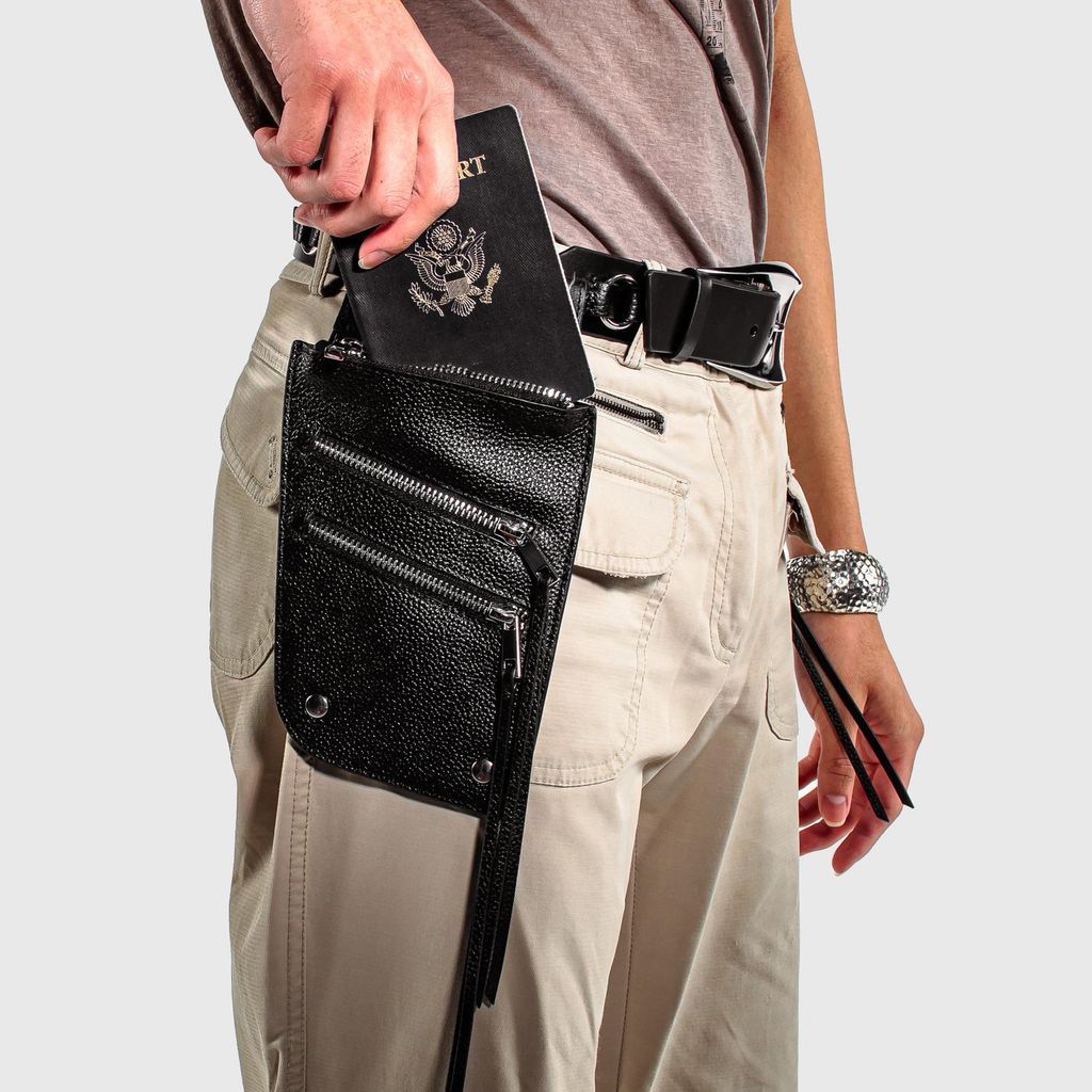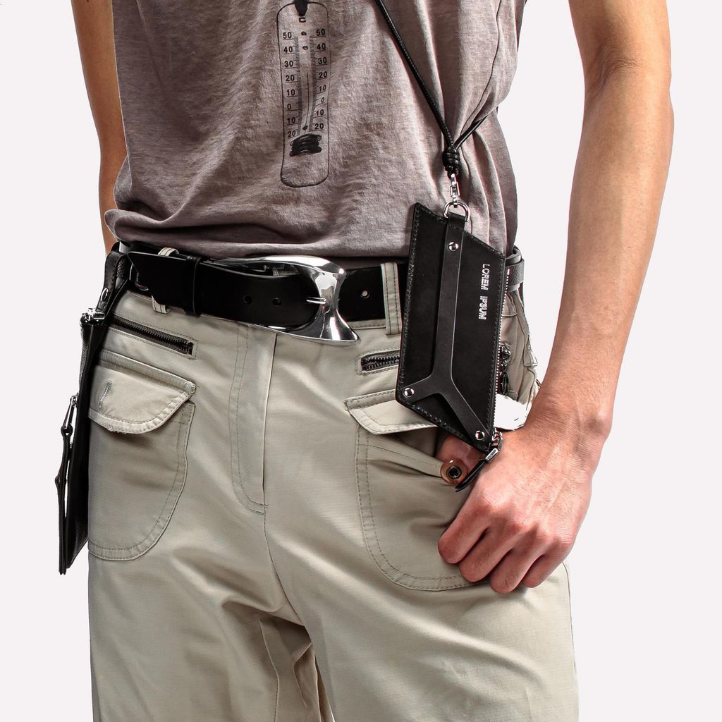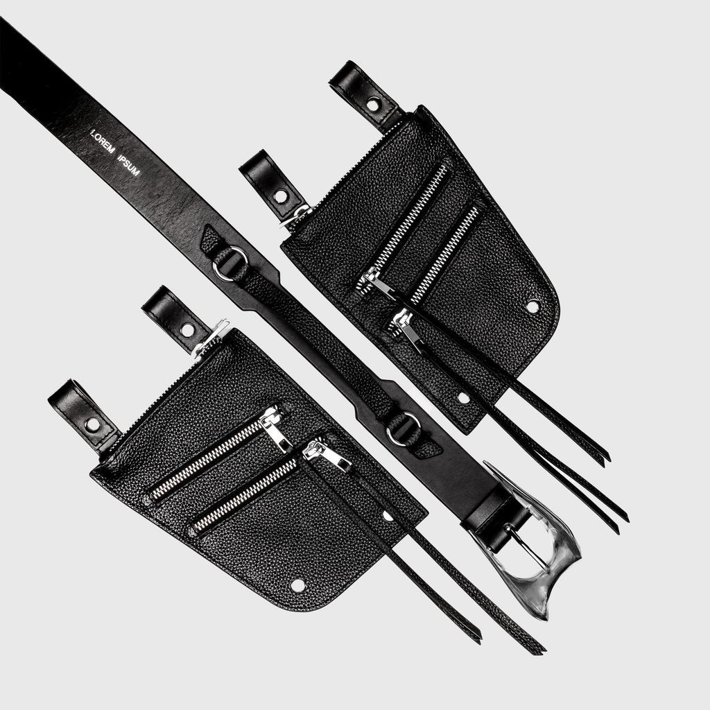 Please DM us on IG to specify sizing (XS-XL) A futuristic interpretation of the western belt. Featuring two detachable side pockets, the Scorpion Belt provides the wearer with practical compartments fit for everyday use. - Smooth & grained calfskin leather - Two detachable pockets with zipper compartment and two exterior slip pockets, fit for a phone or wallet- Custom molded buckle and harness detailing