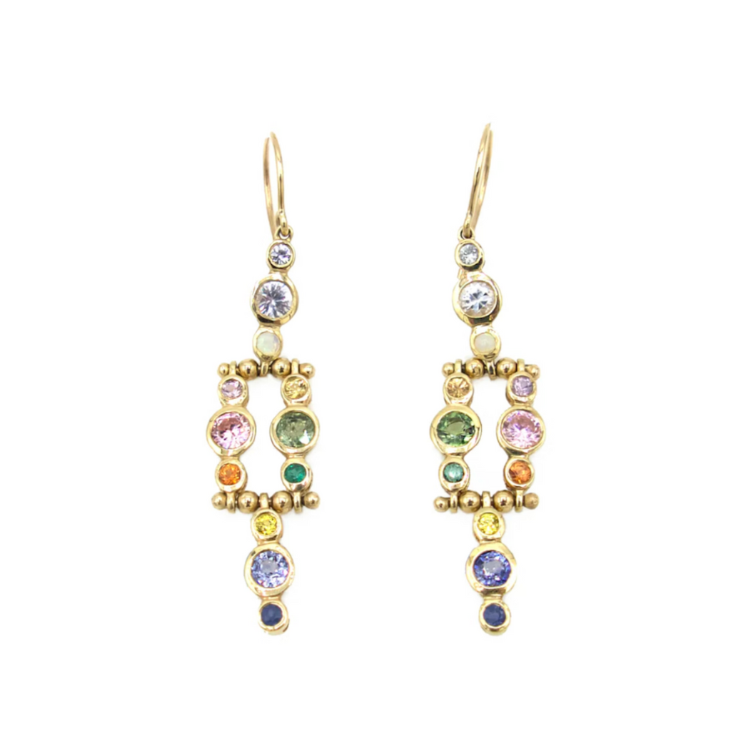 Vintage 14K Yellow Gold Chandelier Mixed Sapphire Drop Earrings. Beautiful array of Sapphires , Diamonds and Opals are bezel set in an intricate design , and dangle from a french wire earring hook. 2" drop , weighs 2.9gm per earring , period: 2000's. Sold as a pair.