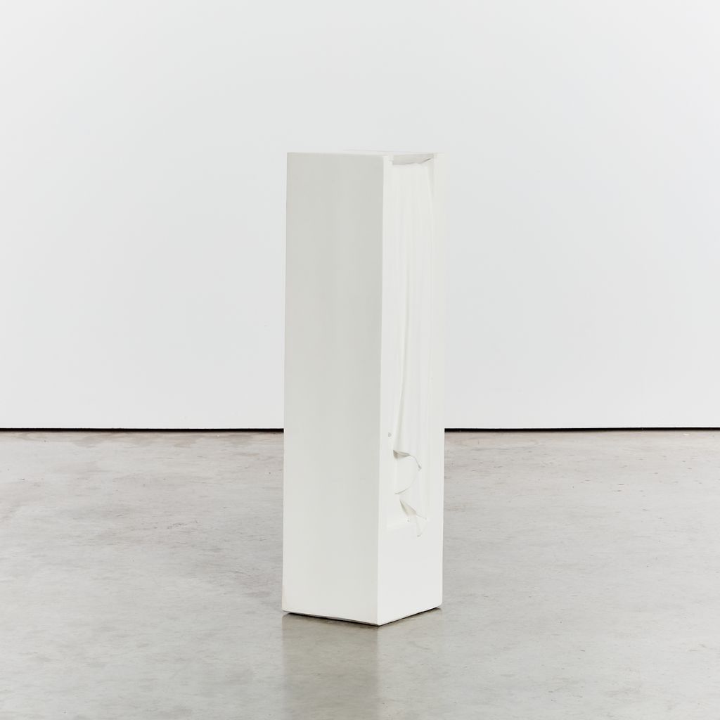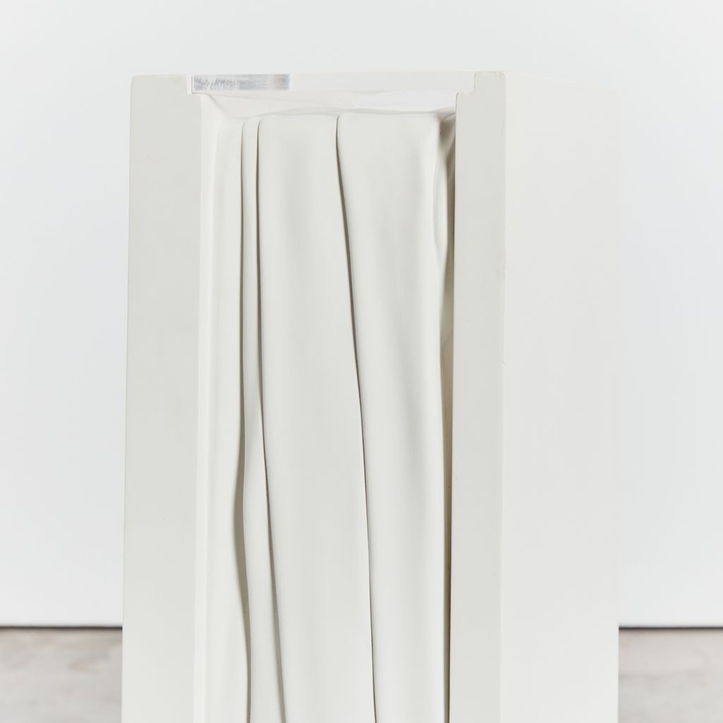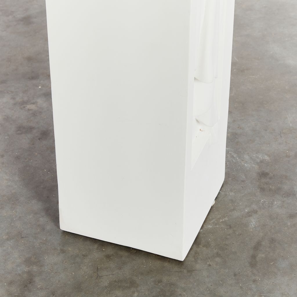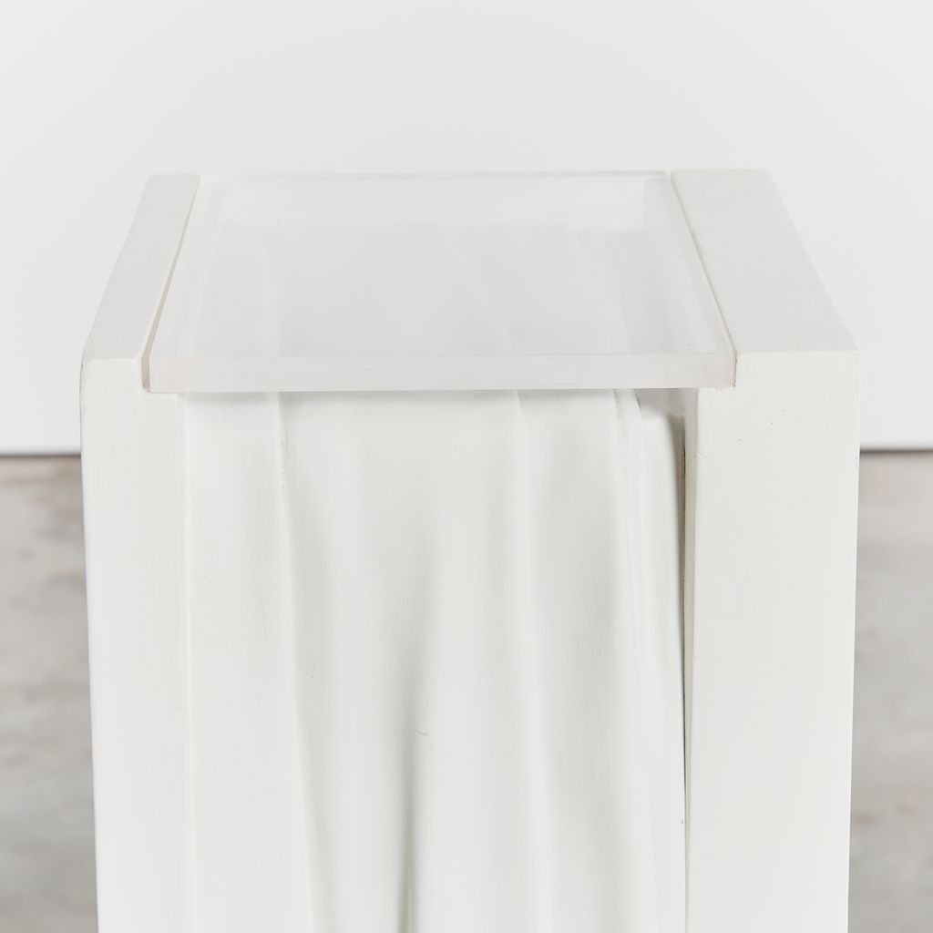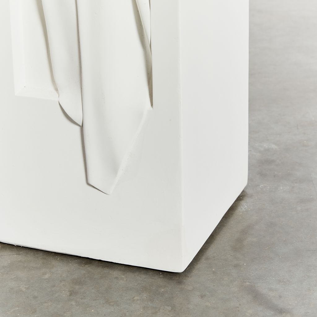 A rare plaster plinth with textile motif, designed in the eighties by Loïc Beuchet for Atelier Sedap. The collection included a sconce model, lamp, plinth, floor lamp and a fireplace. The top of the plinth includes a piece of acrylic to enable a level substrate for use as a plinth.