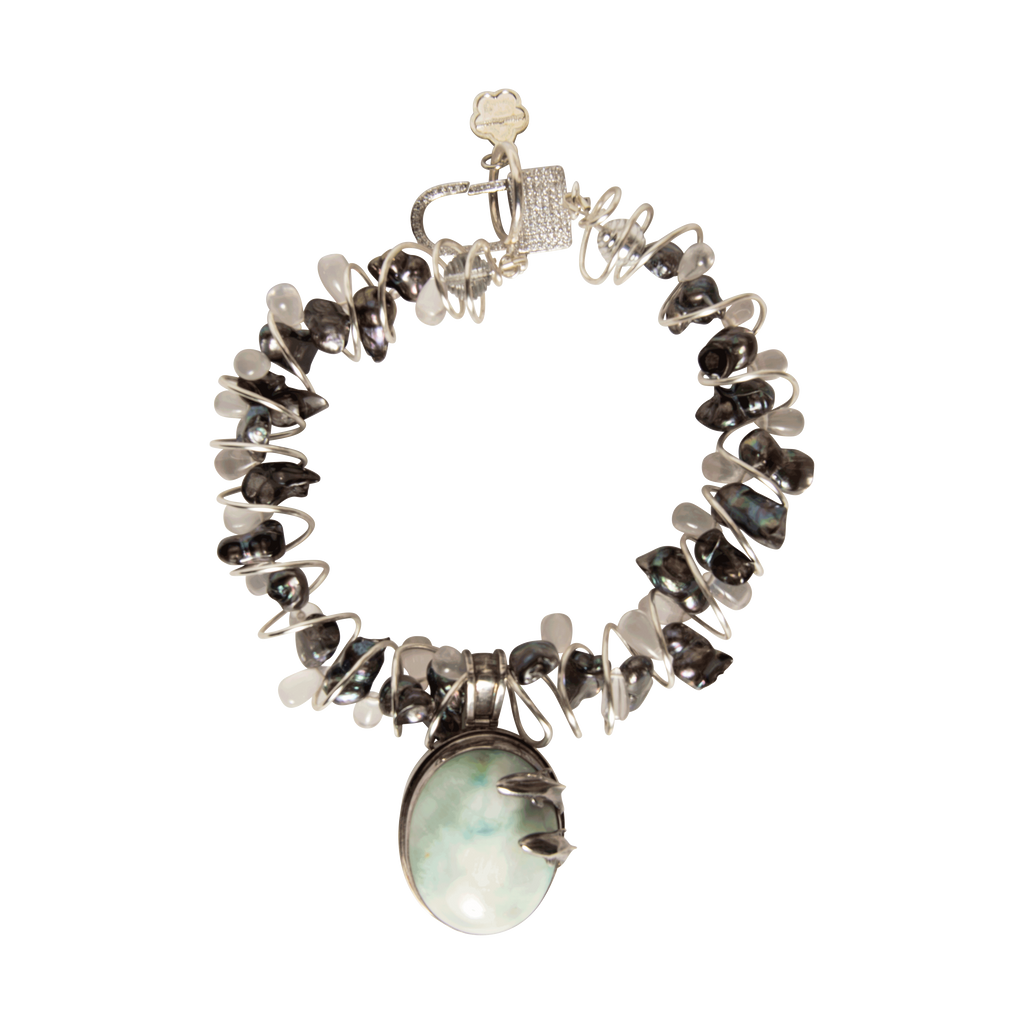 Sea Urchin features fresh water pearls, sterling silver, stainless steel, and glass and is a handmade one of a kind necklace.