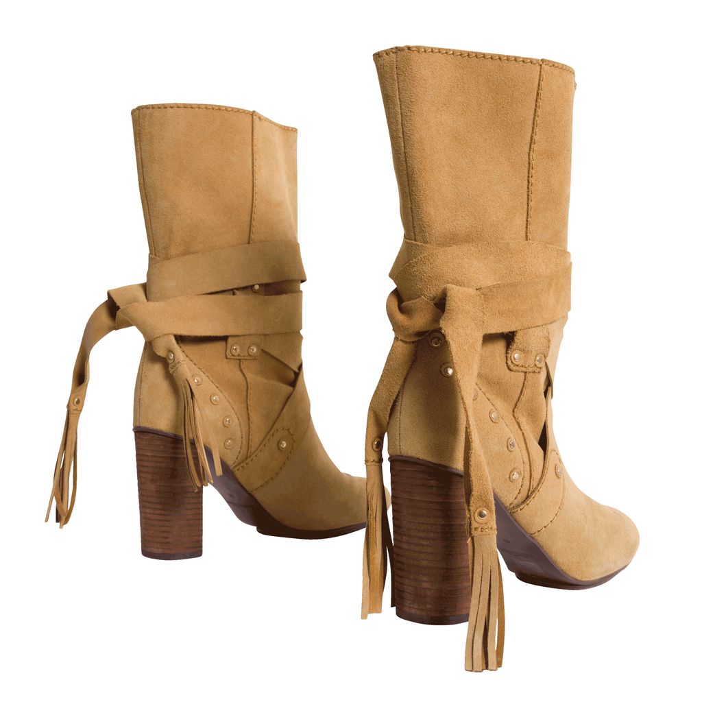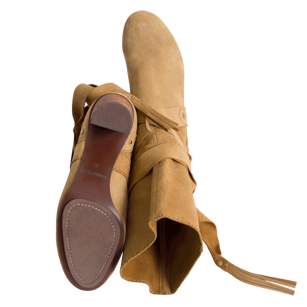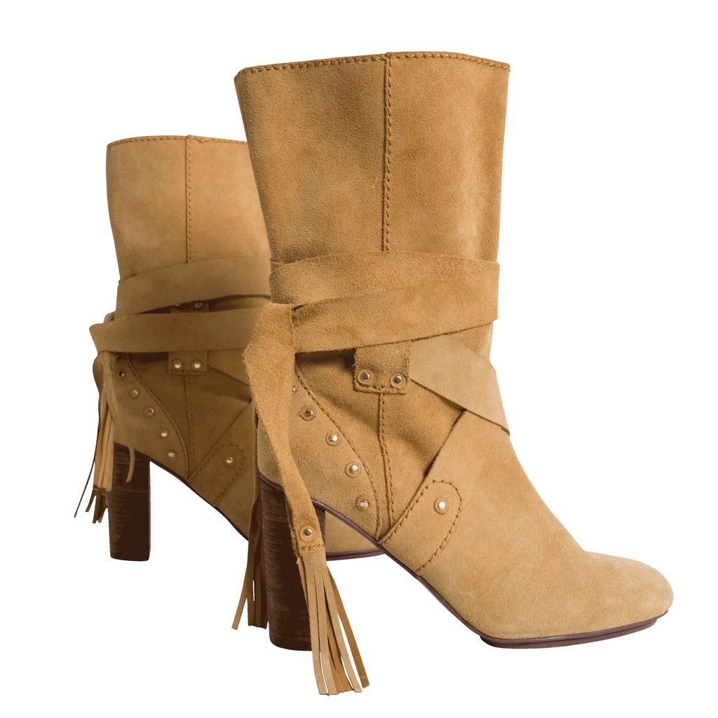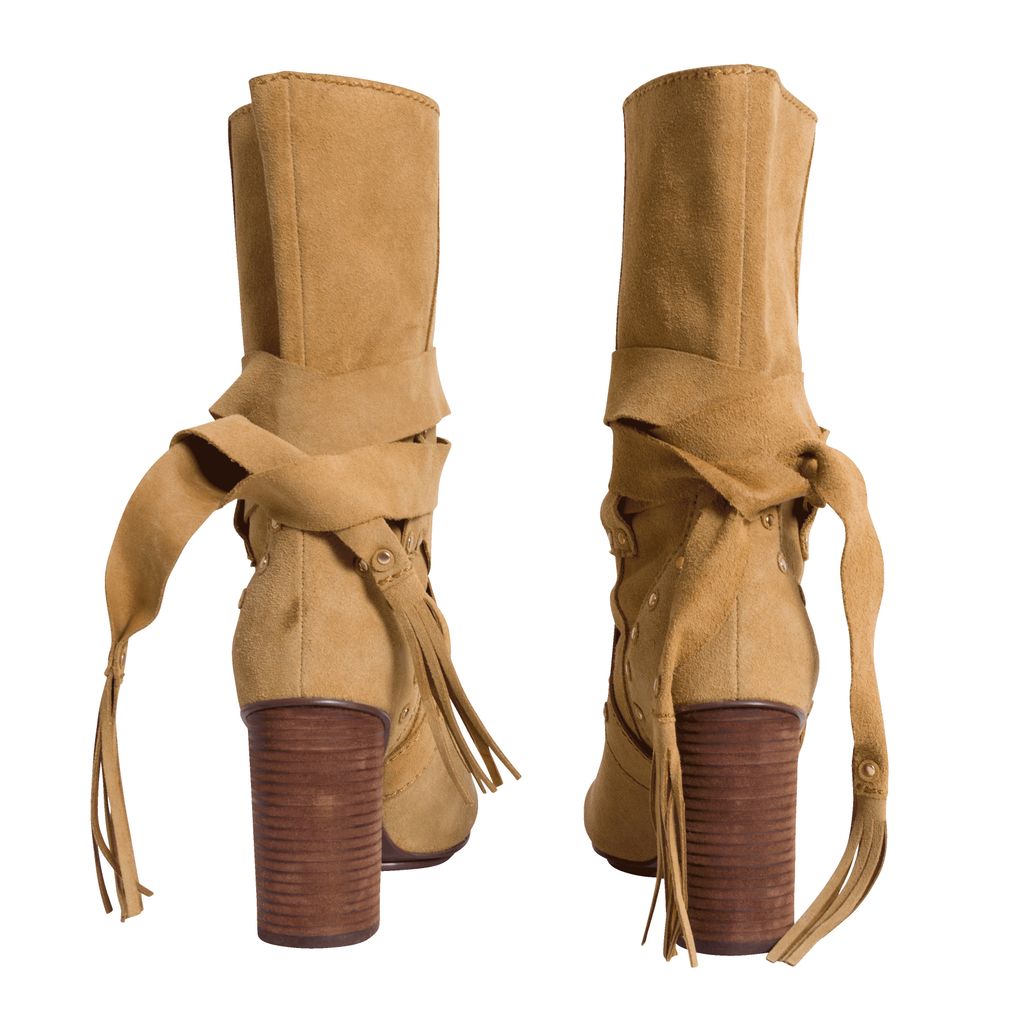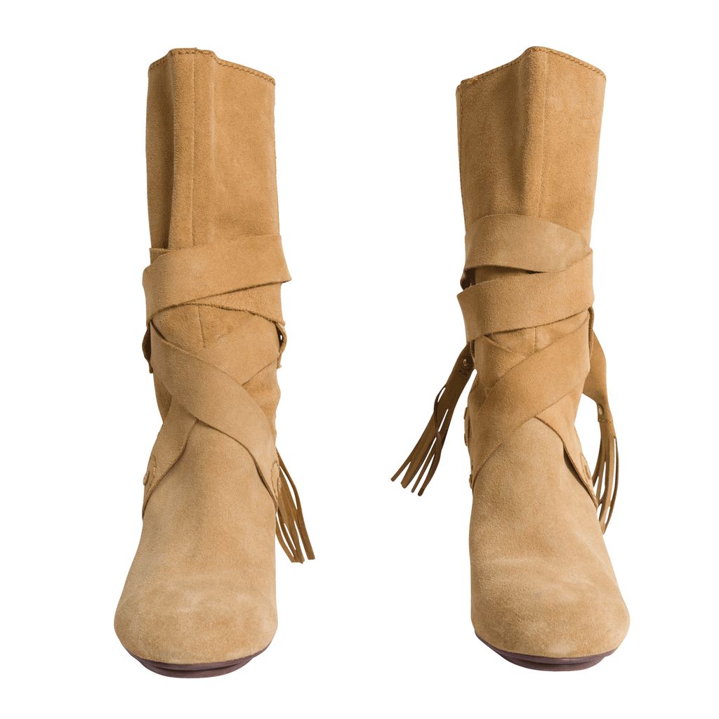 Excellent Condition. Tan Suede Boots featuring a tie around the back with a small tassle on each end. Decorative studs line the shoe.