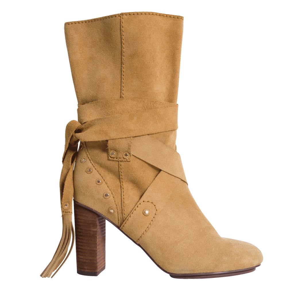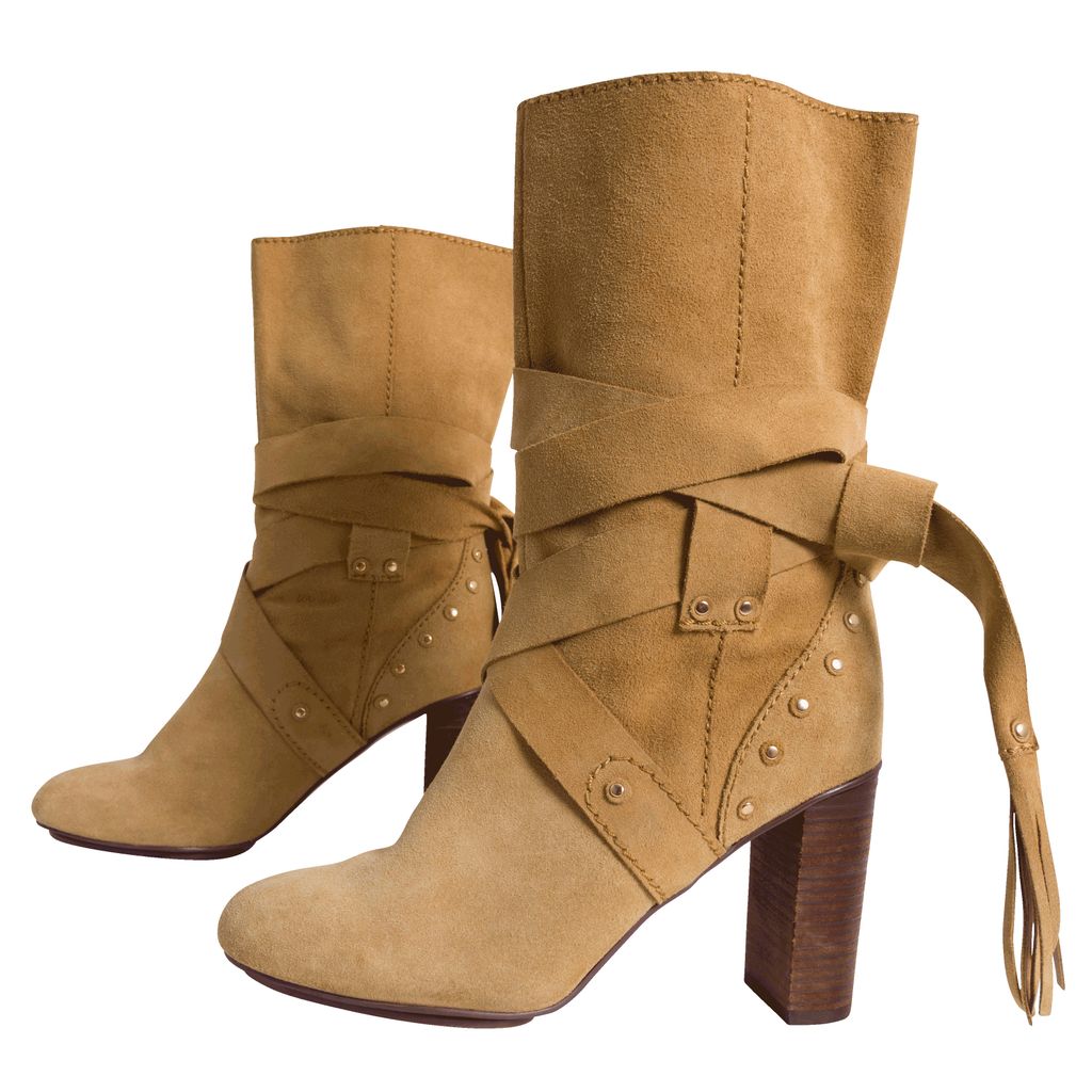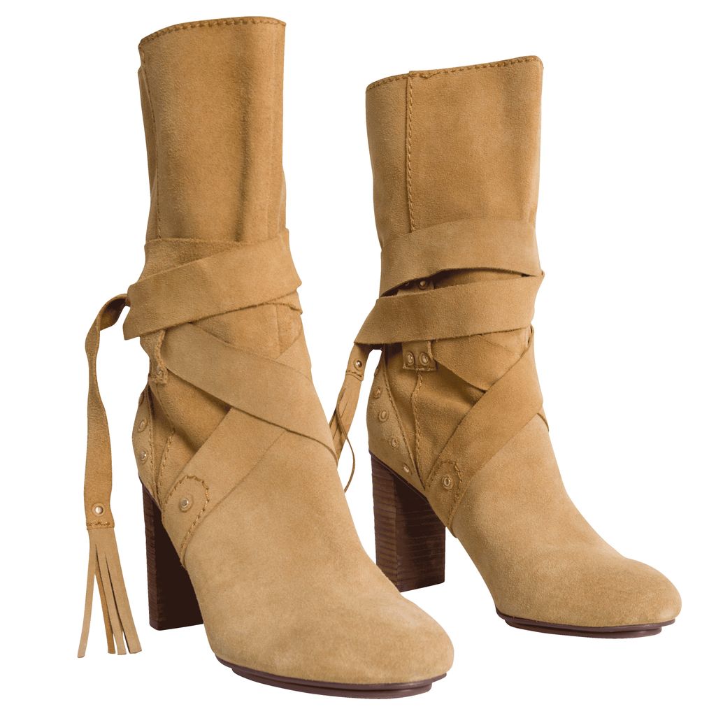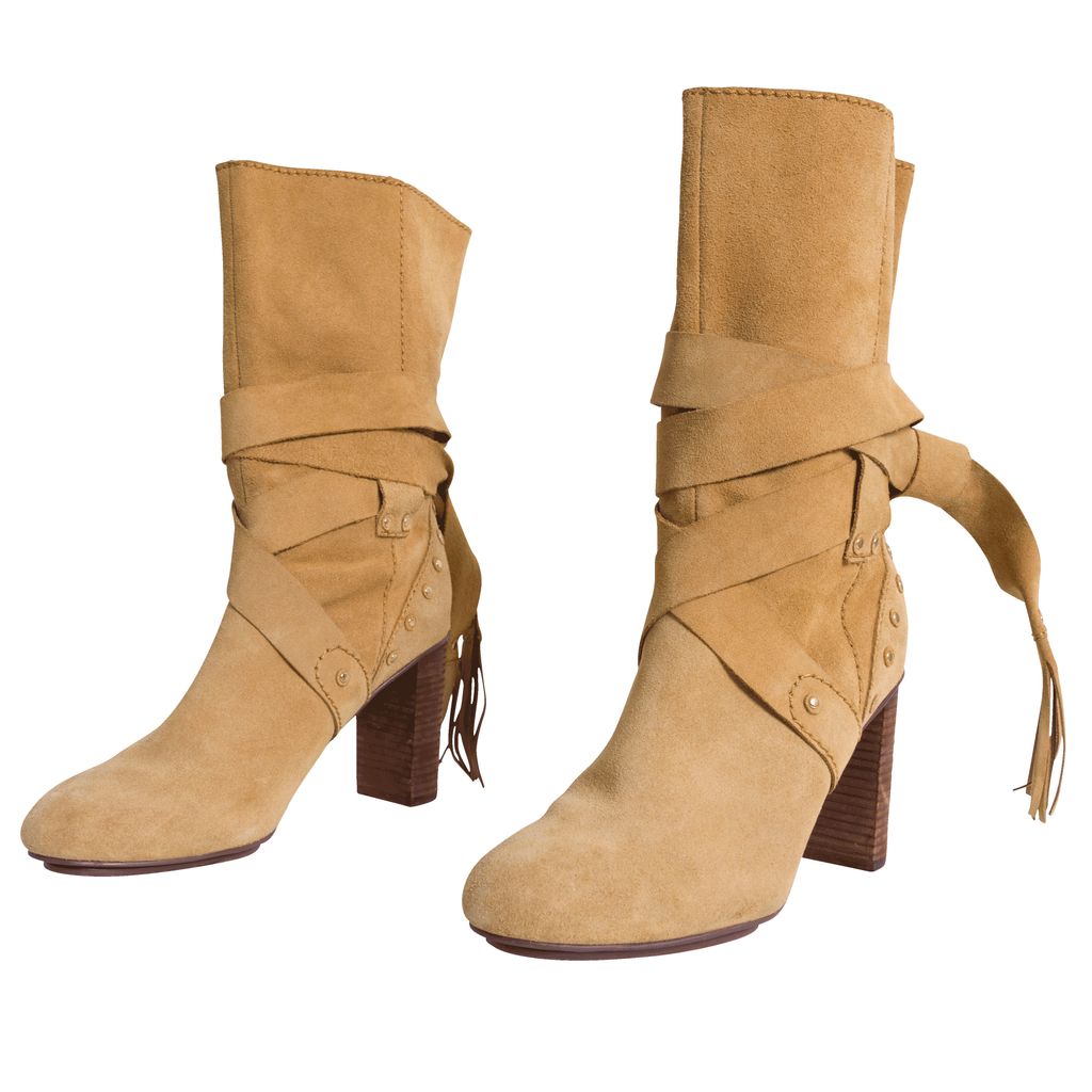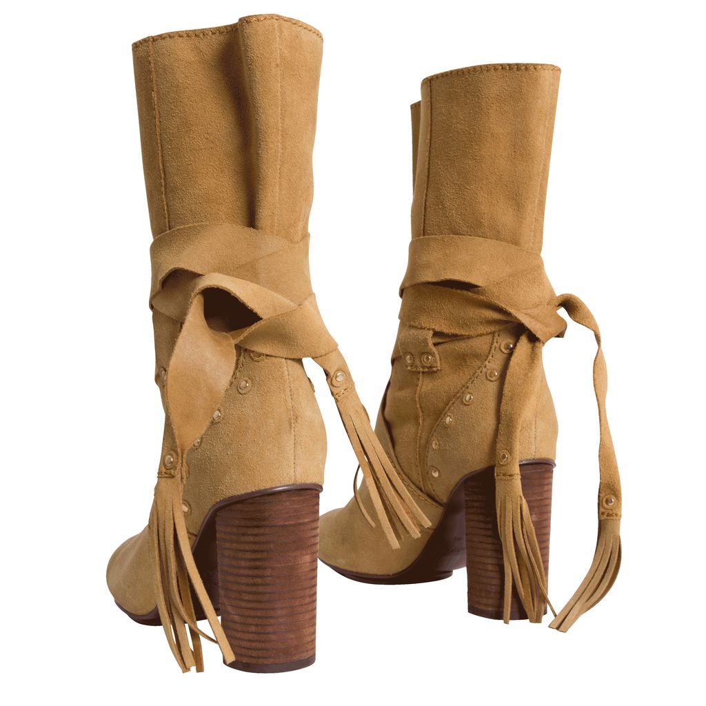 Excellent Condition. Tan Suede Boots featuring a tie around the back with a small tassle on each end. Decorative studs line the shoe.