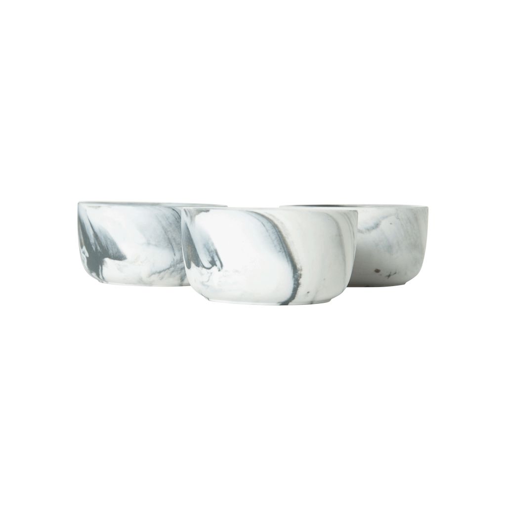Set of 3 Marble Ramekins features 3 circular ramekins with slightly differing patterns.