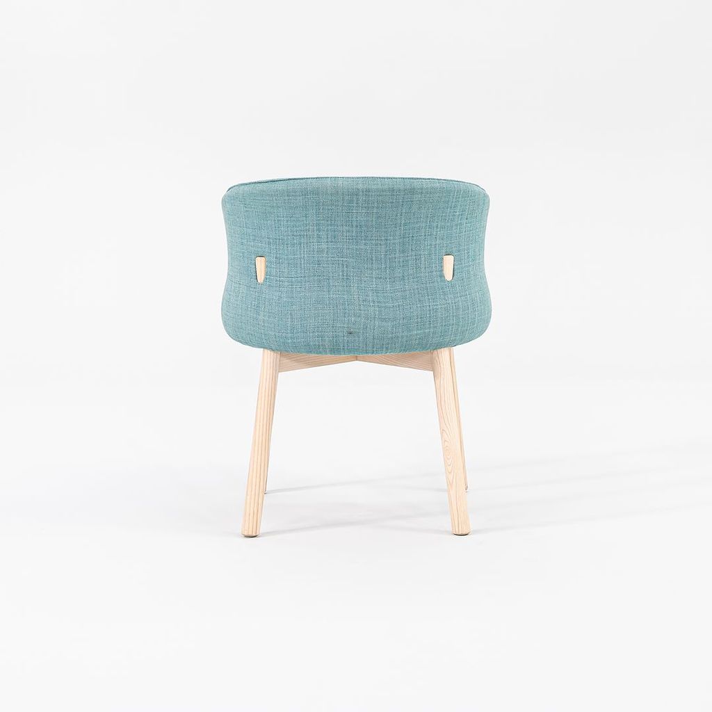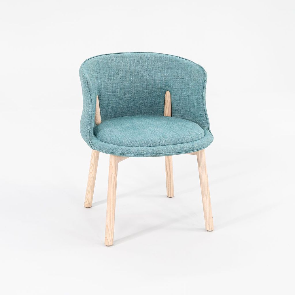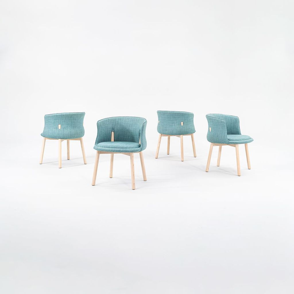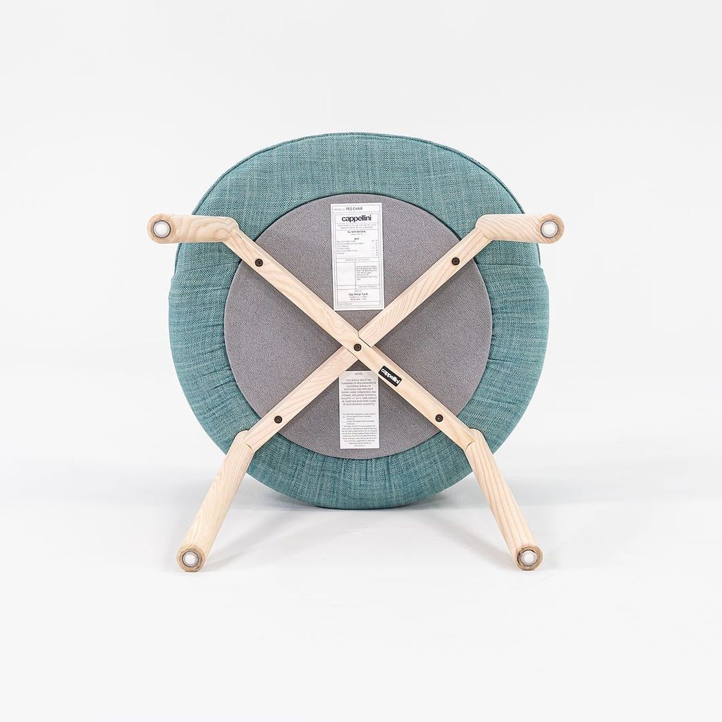 Listed for sale is a set of four (4) Peg Armchairs made with bleached ash wood legs and light teal-green fabric (Grit 14). The chairs were designed by Nendo and produced by Cappellini in Italy. They date to circa 2022 and are guaranteed as authentic. Condition is excellent. See photos.