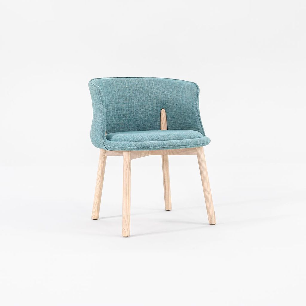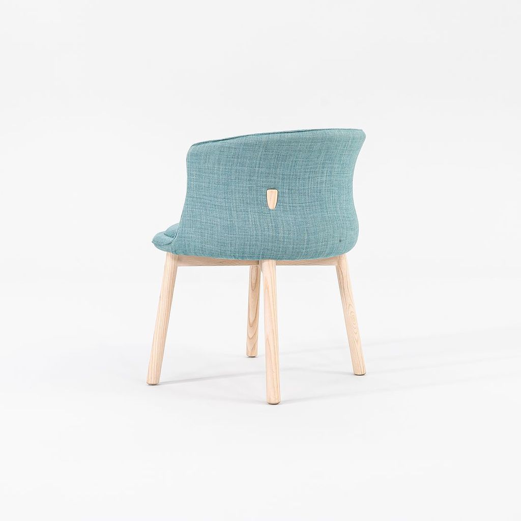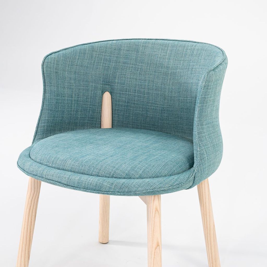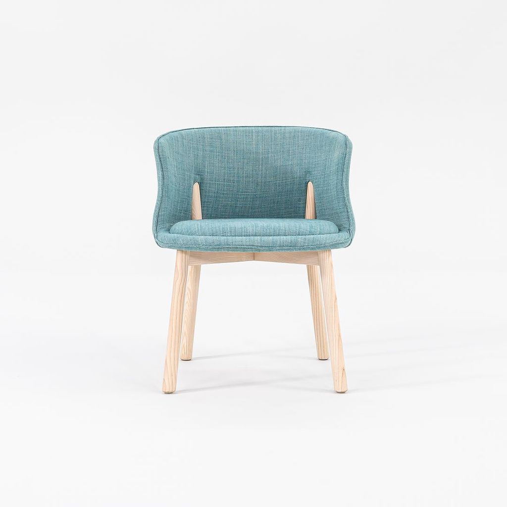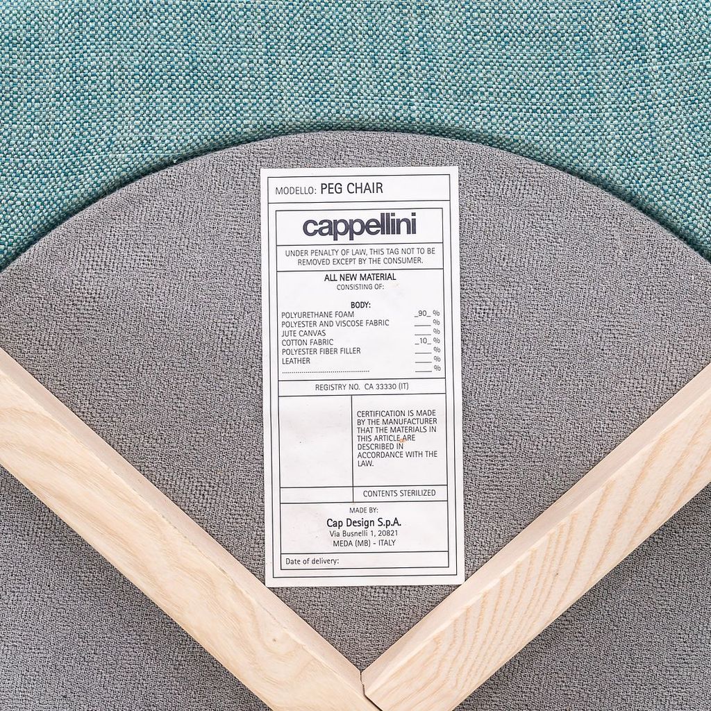 Listed for sale is a set of four (4) Peg Armchairs made with bleached ash wood legs and light teal-green fabric (Grit 14). The chairs were designed by Nendo and produced by Cappellini in Italy. They date to circa 2022 and are guaranteed as authentic. Condition is excellent. See photos.