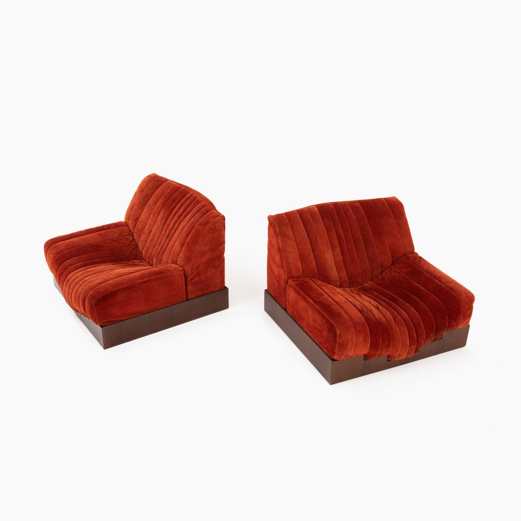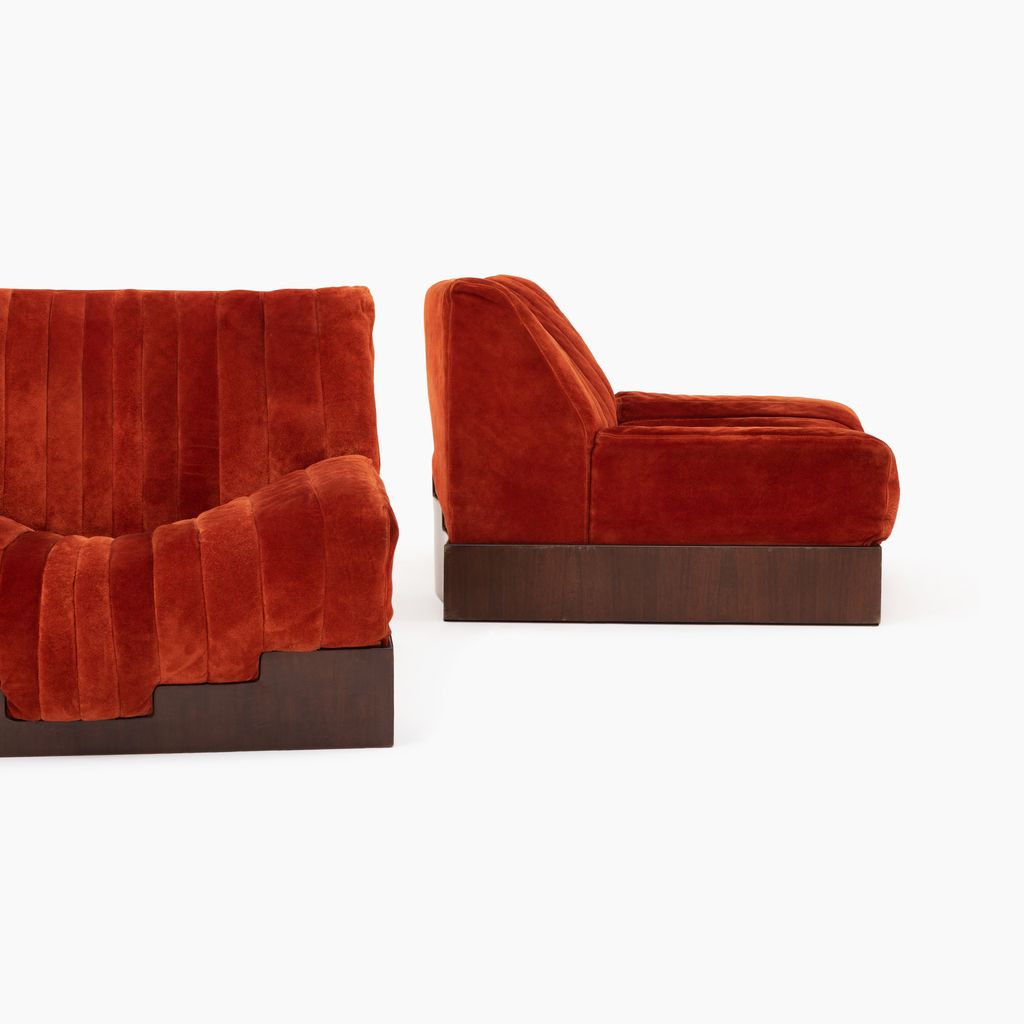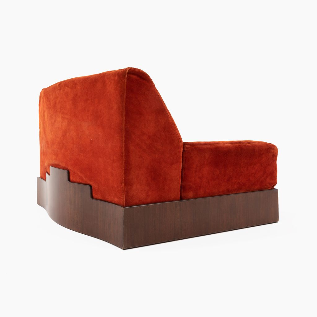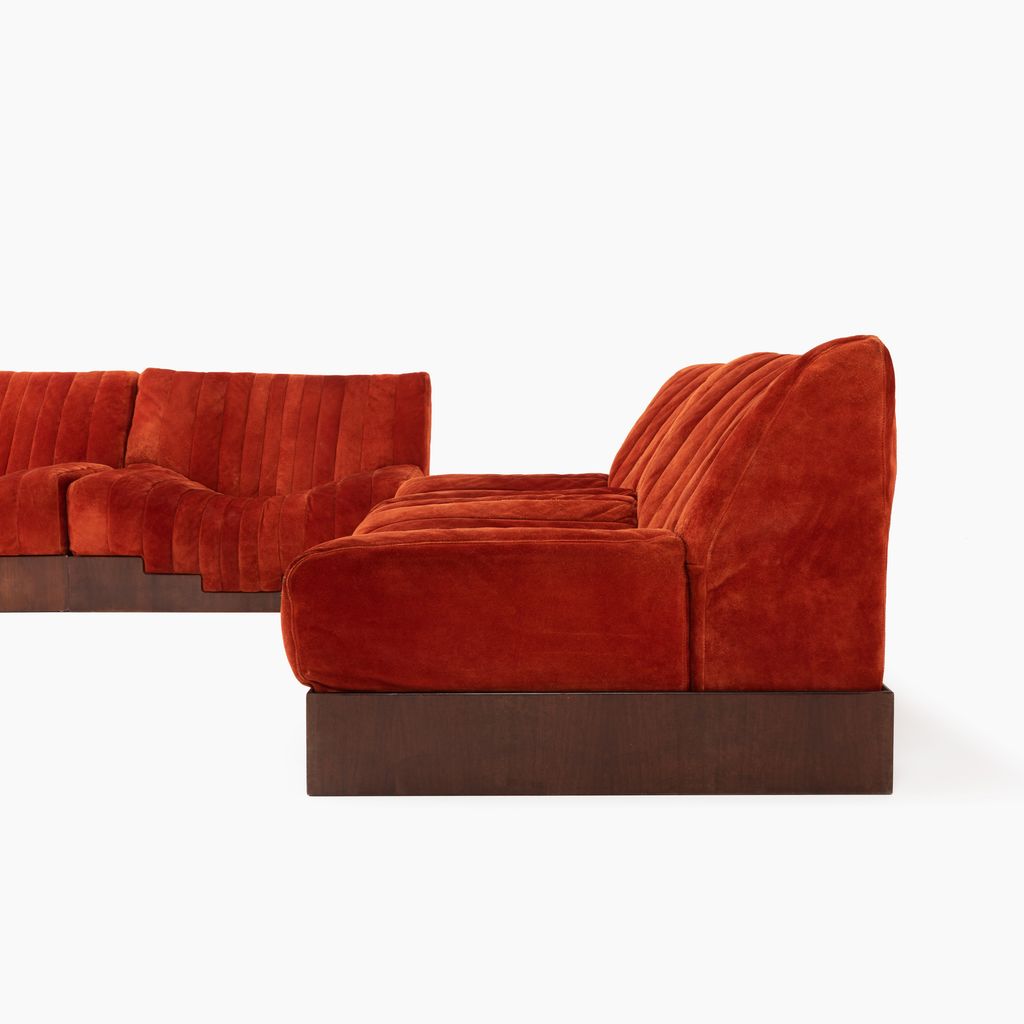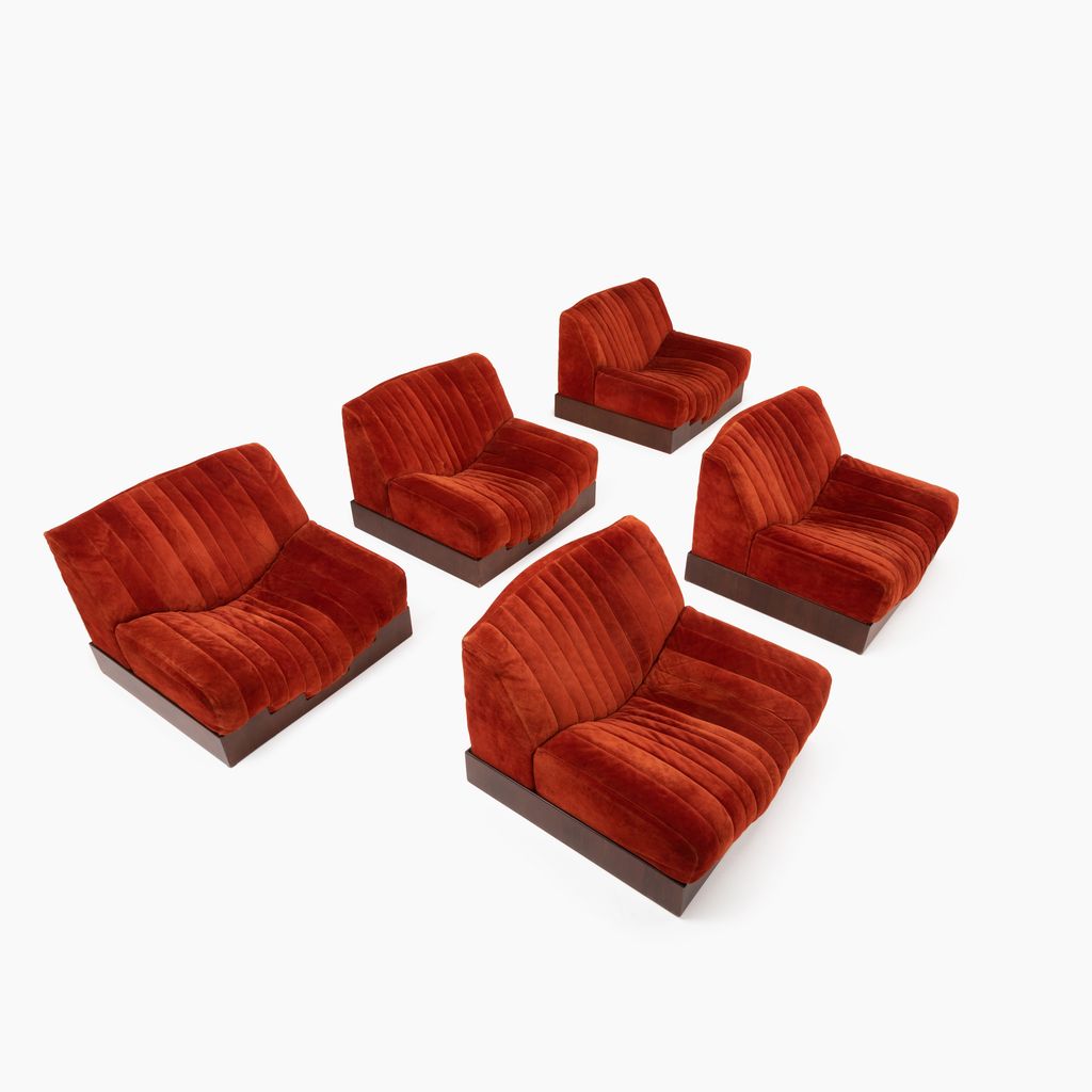 This set of five San Francisco Armchairs in original nubuck leather and wood veneer base is a variable modulae system - mobili scultura (furniture sculpture) - consisting of five individual armchairs. Together, the armchairs form a sofa system with various options of assembly. The blood orange color of the set's original velvet upholstery offers a quality of subtle regality.