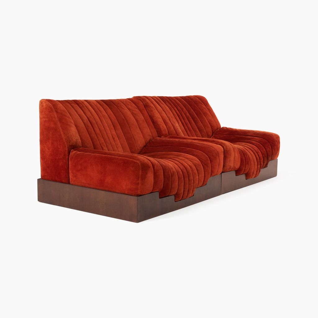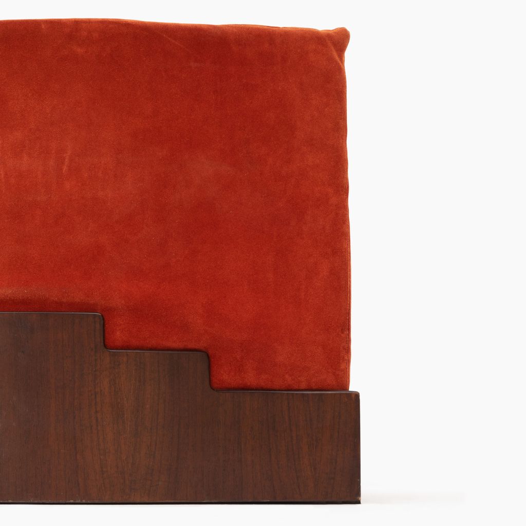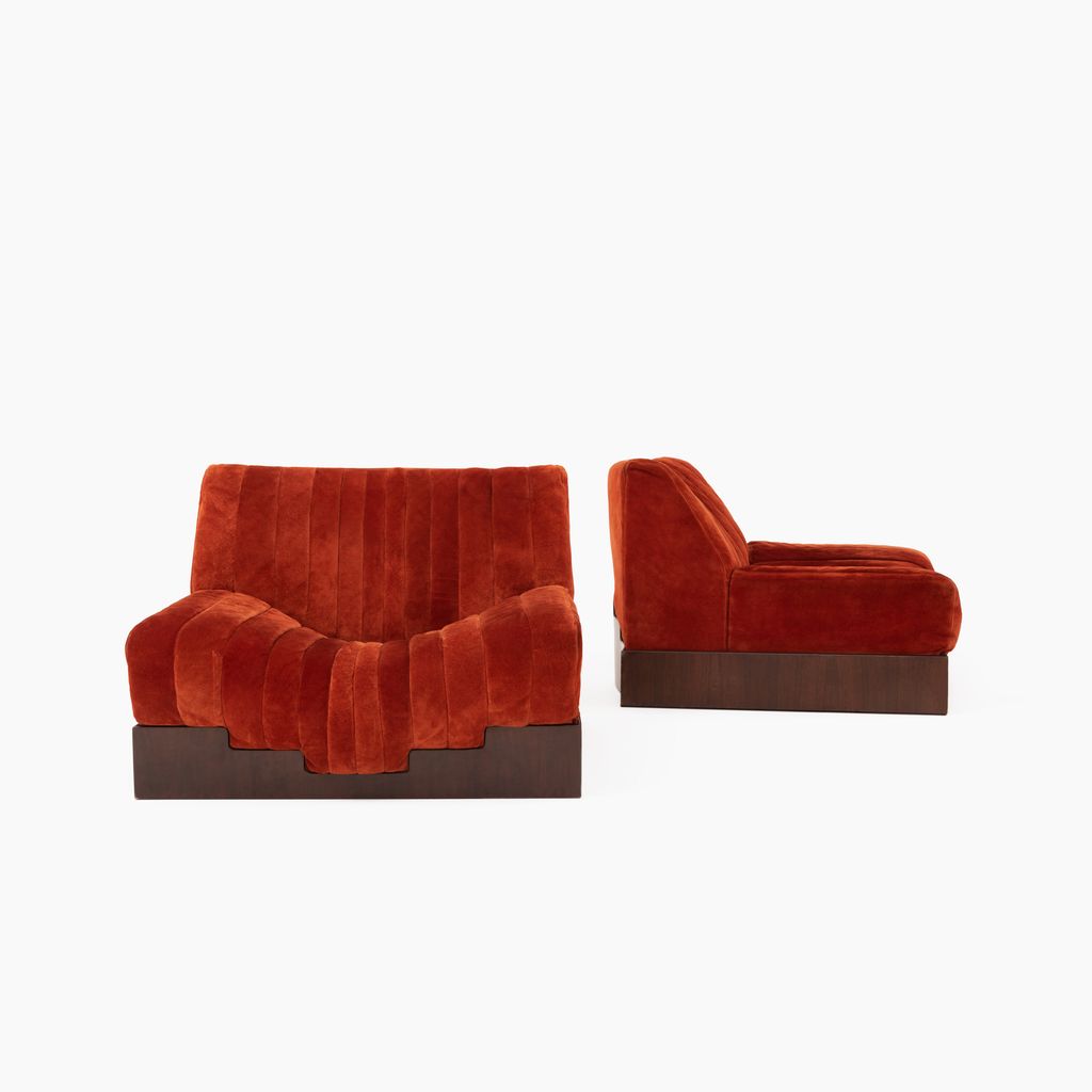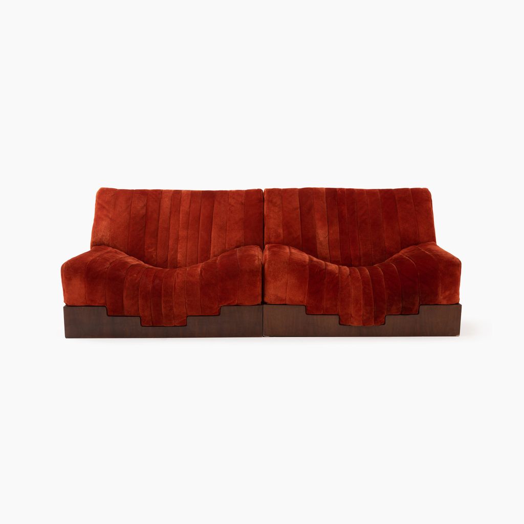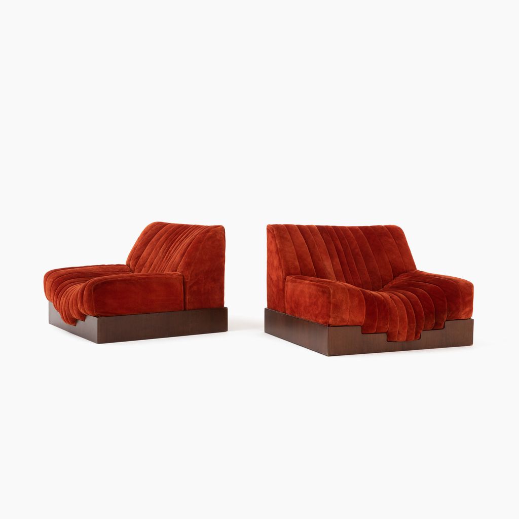 This set of five San Francisco Armchairs in original nubuck leather and wood veneer base is a variable modulae system - mobili scultura (furniture sculpture) - consisting of five individual armchairs. Together, the armchairs form a sofa system with various options of assembly. The blood orange color of the set's original velvet upholstery offers a quality of subtle regality.
