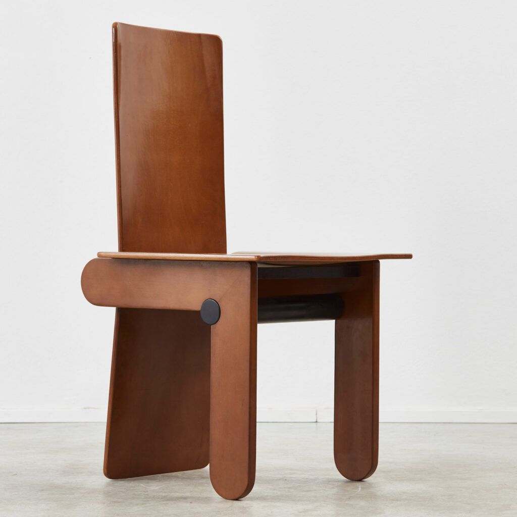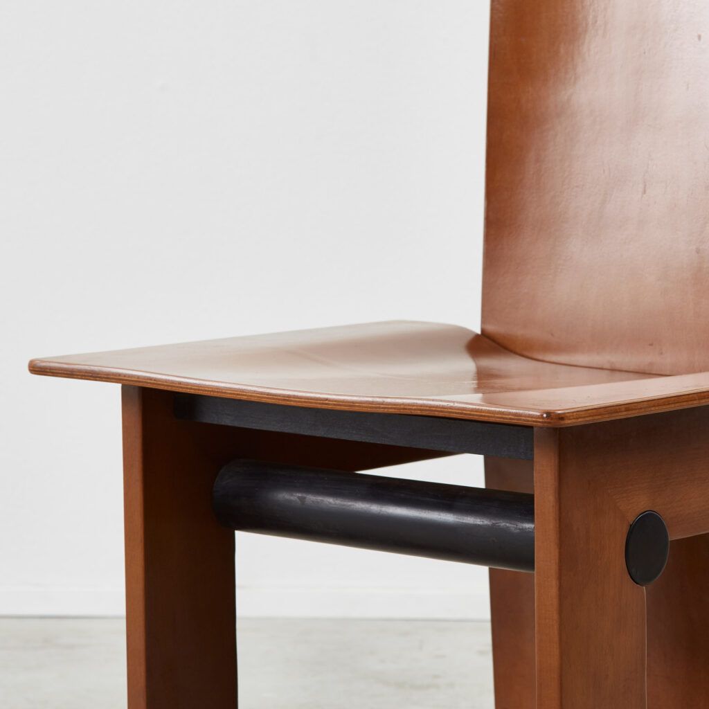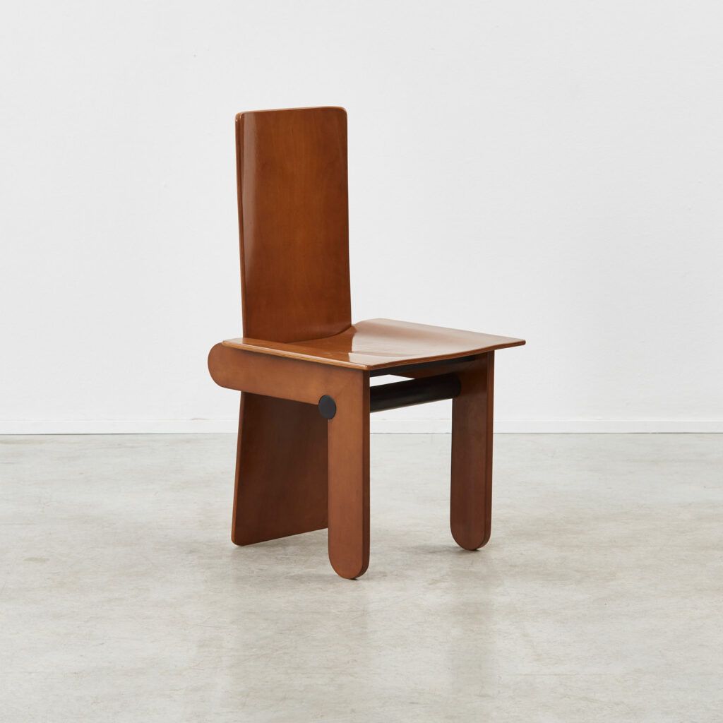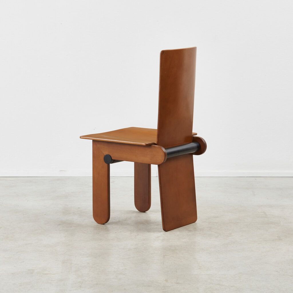 Highly distinctive, this set of solid oak dining chairs by Carlo Scarpa marry a modernist geometry with imaginative construction. The sheath-like high back is held by an ebonised crossbar, mirrored by another tubular element at the internal angle of the frame. In profile, this section reveals a rounded right angle with pleasing symmetry.