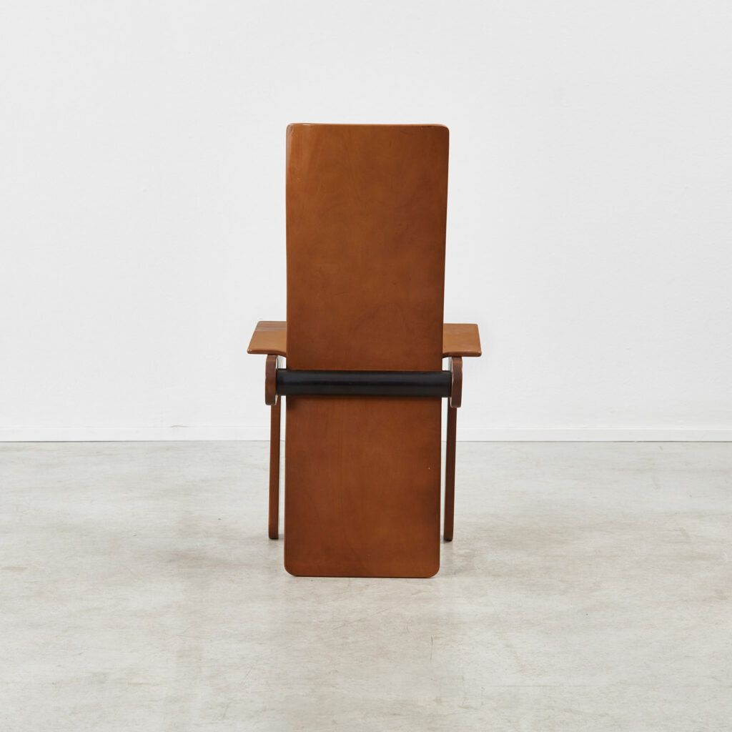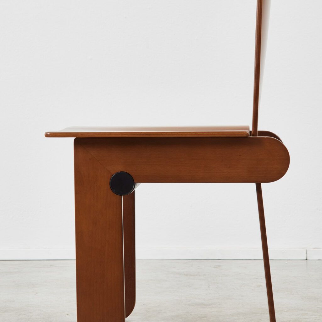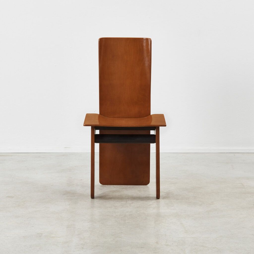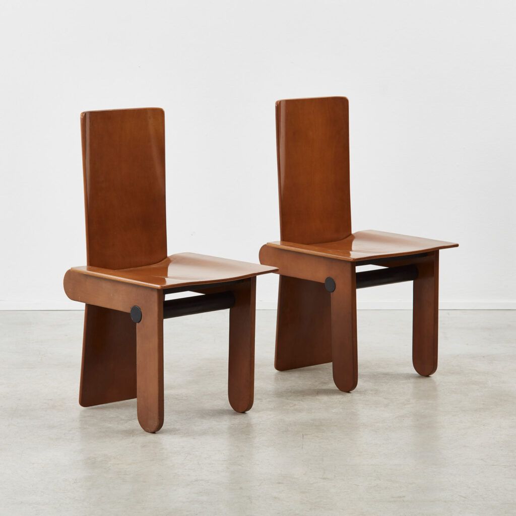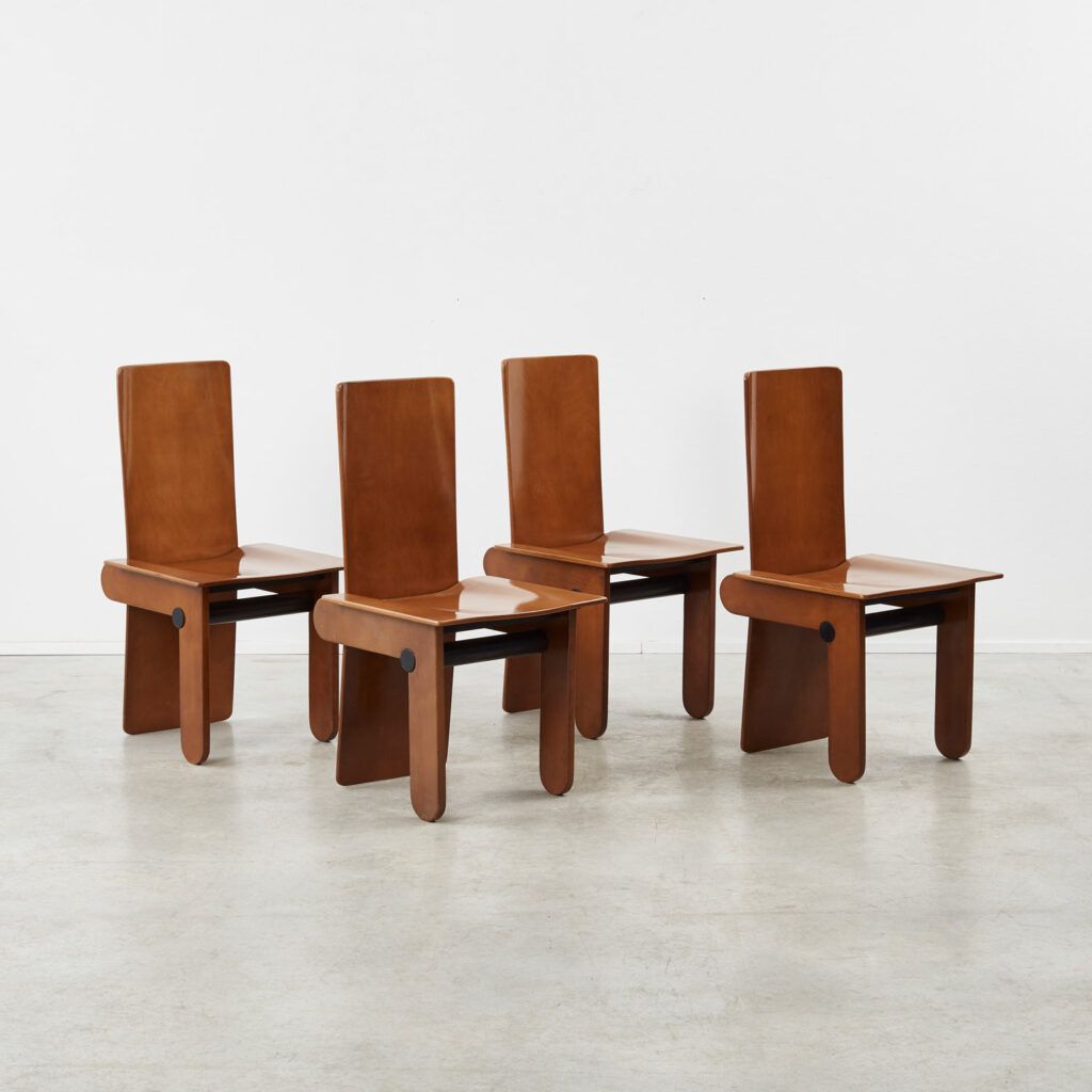 Highly distinctive, this set of solid oak dining chairs by Carlo Scarpa marry a modernist geometry with imaginative construction. The sheath-like high back is held by an ebonised crossbar, mirrored by another tubular element at the internal angle of the frame. In profile, this section reveals a rounded right angle with pleasing symmetry.