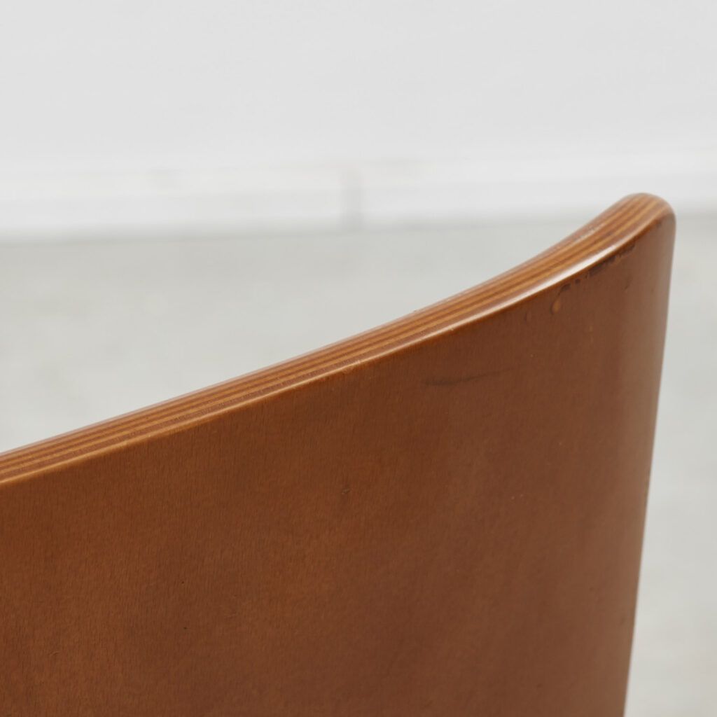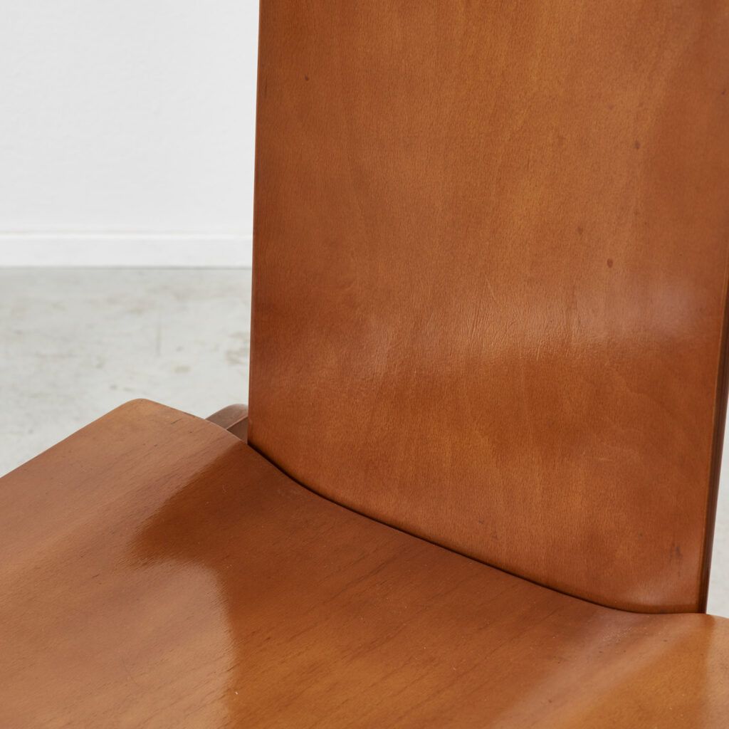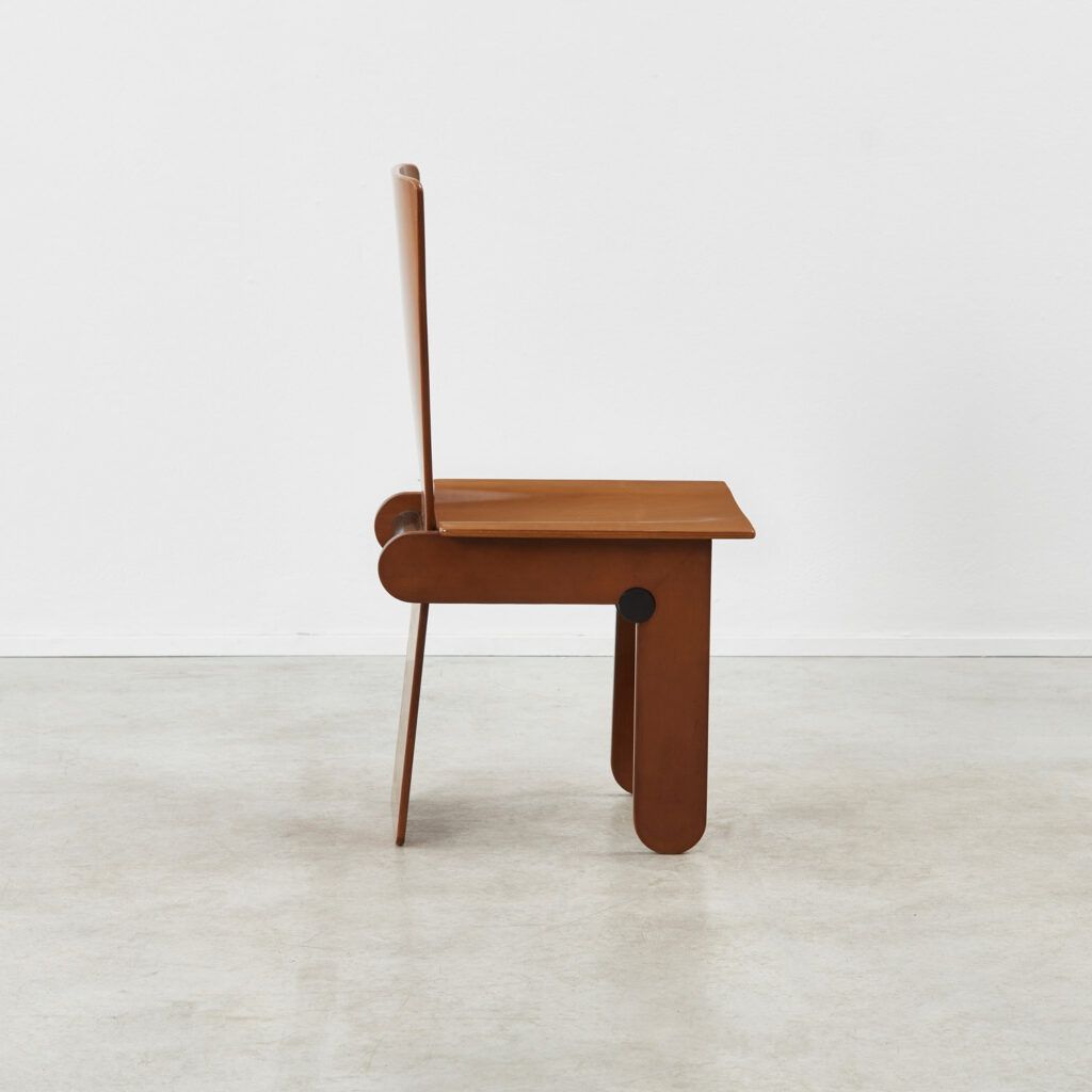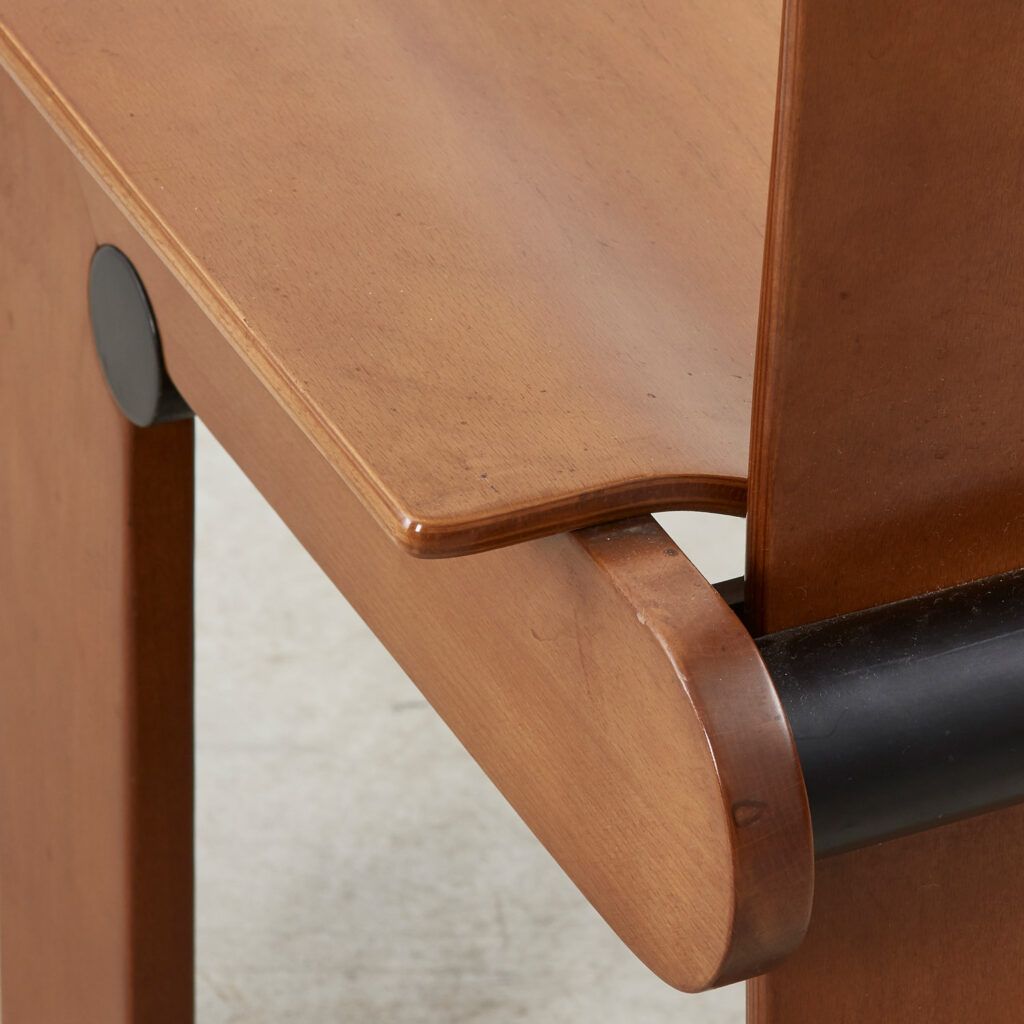 Highly distinctive, this set of solid oak dining chairs by Carlo Scarpa marry a modernist geometry with imaginative construction. The sheath-like high back is held by an ebonised crossbar, mirrored by another tubular element at the internal angle of the frame. In profile, this section reveals a rounded right angle with pleasing symmetry.