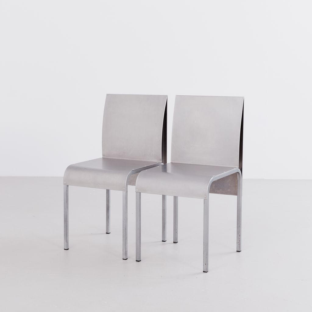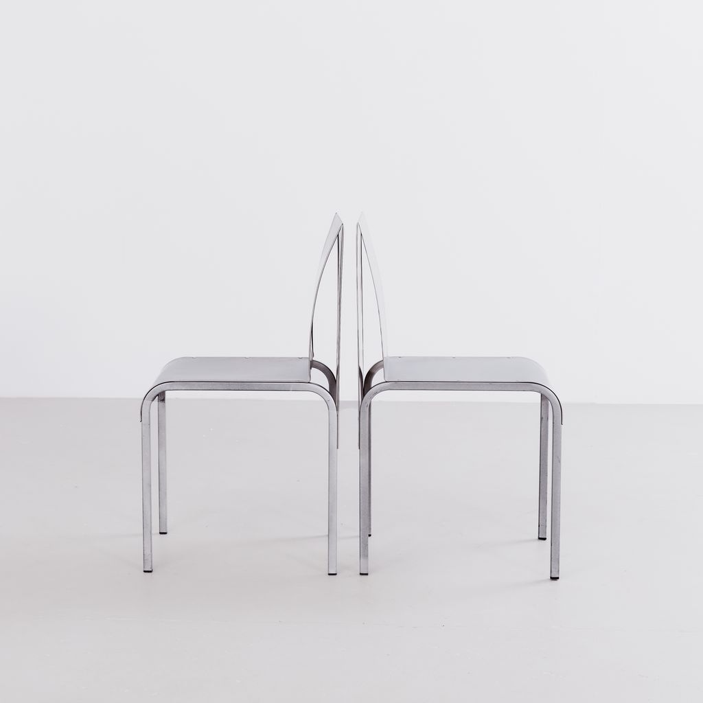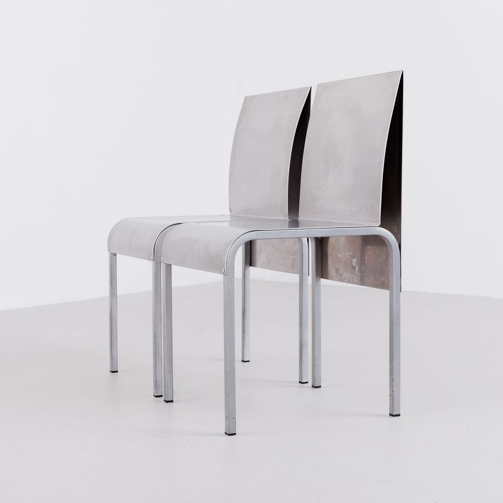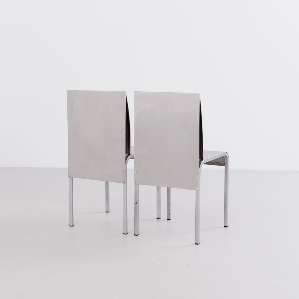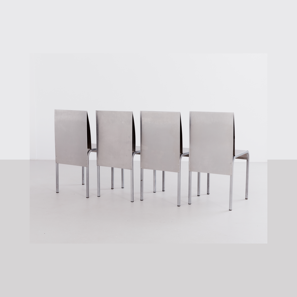 Sourced from Belgium, this set of 4 postmodern dining chairs features a minimalist folded aluminium chair based on streamlined, curved steel frame.