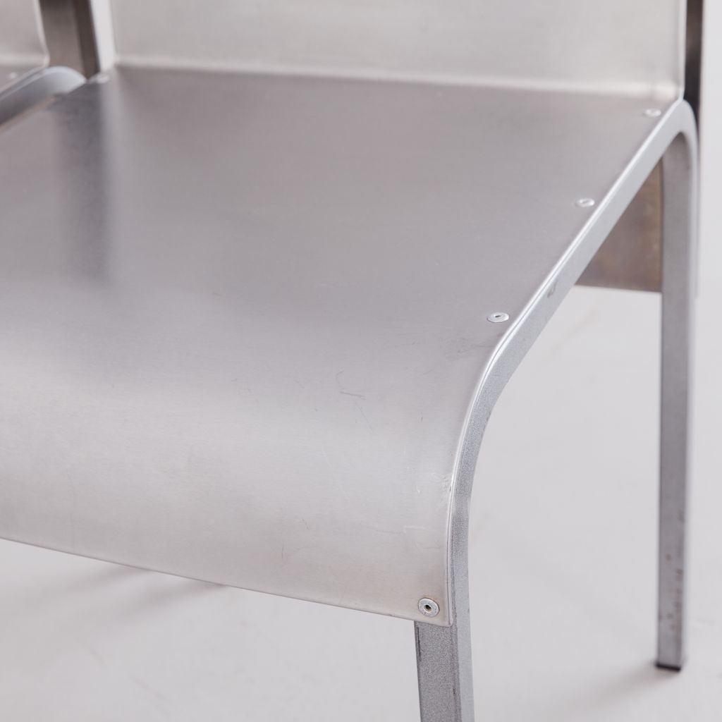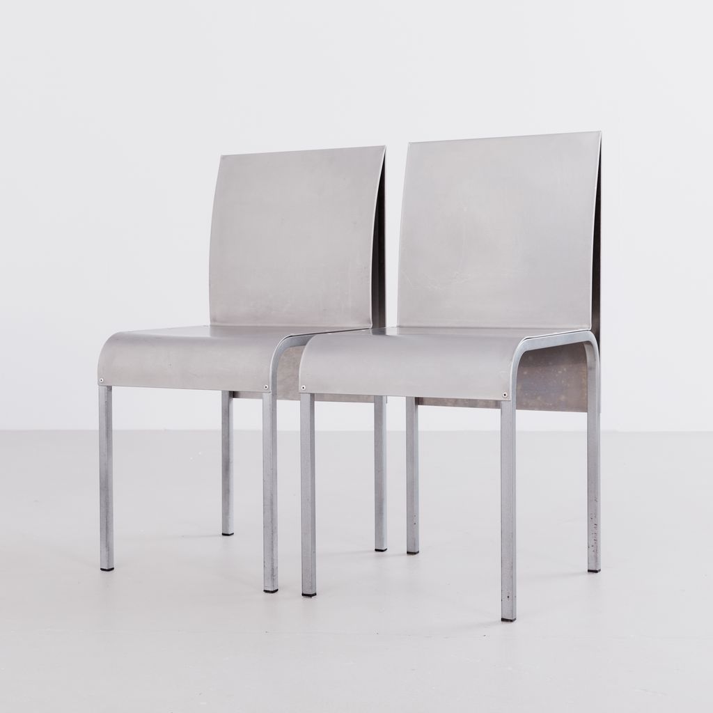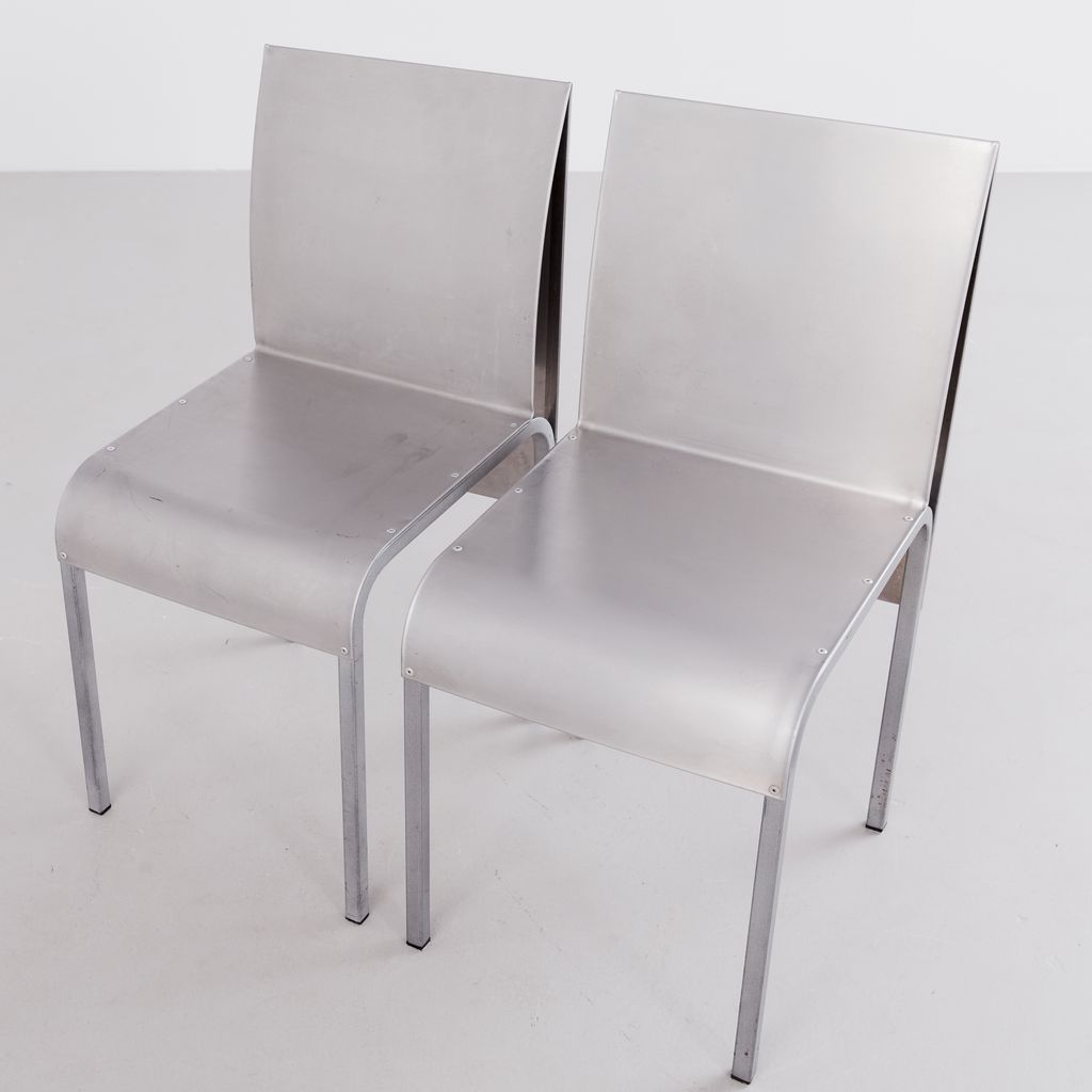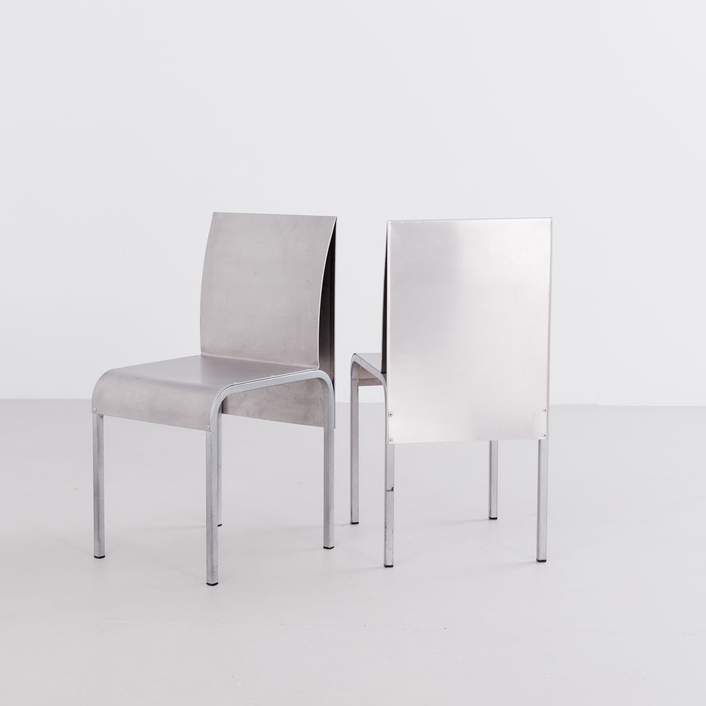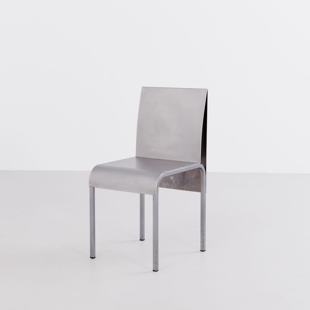 Sourced from Belgium, this set of 4 postmodern dining chairs features a minimalist folded aluminium chair based on streamlined, curved steel frame.