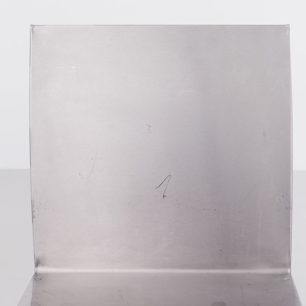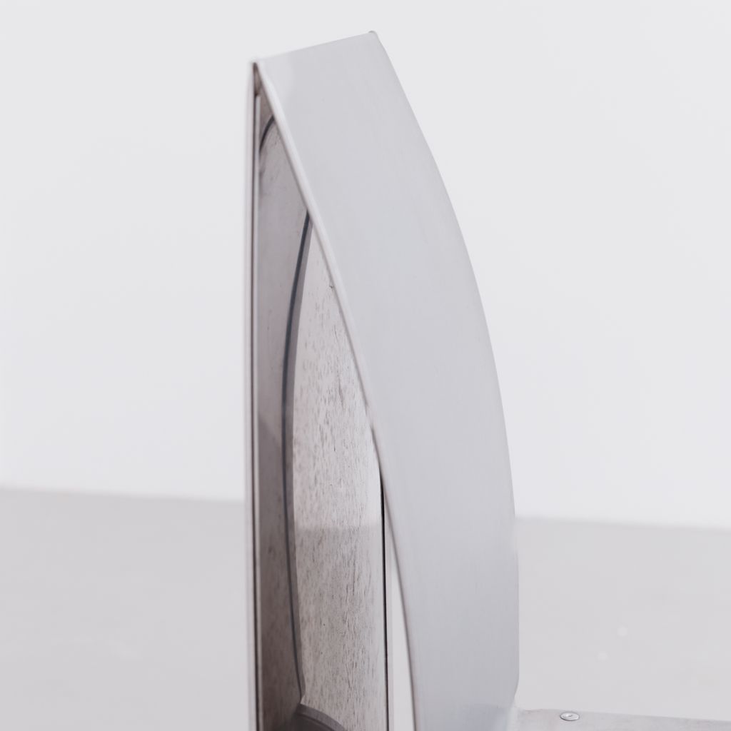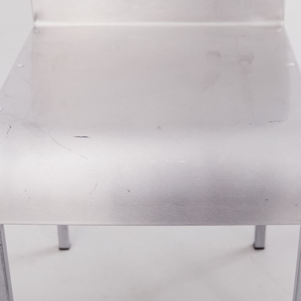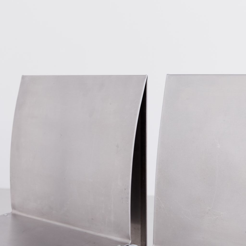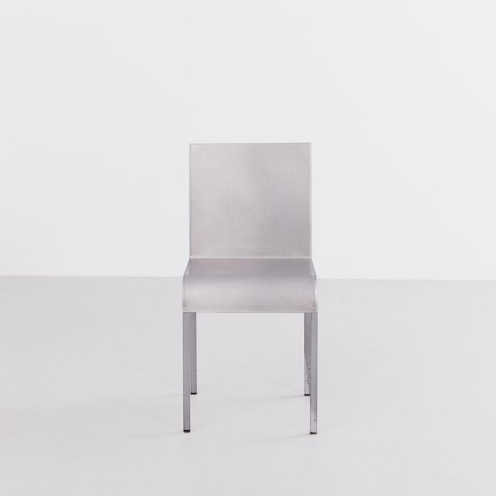 Sourced from Belgium, this set of 4 postmodern dining chairs features a minimalist folded aluminium chair based on streamlined, curved steel frame.