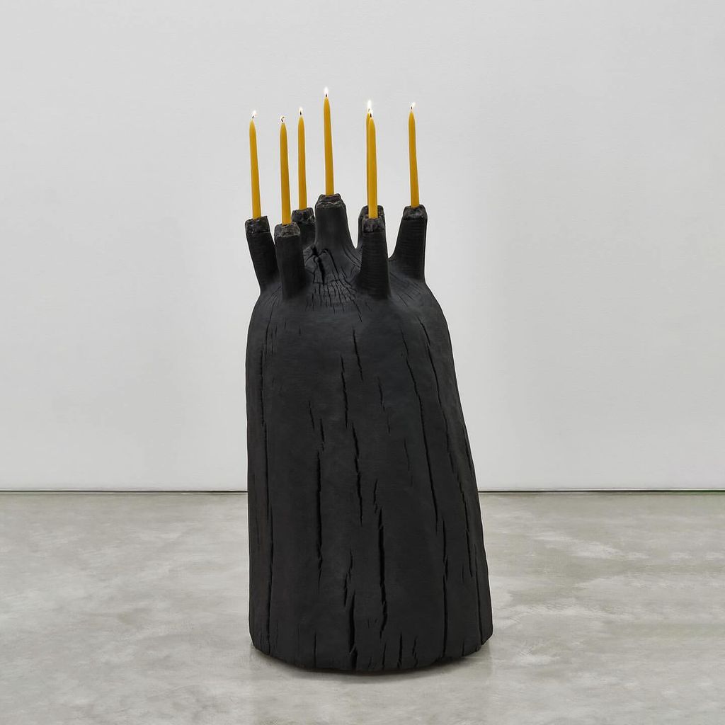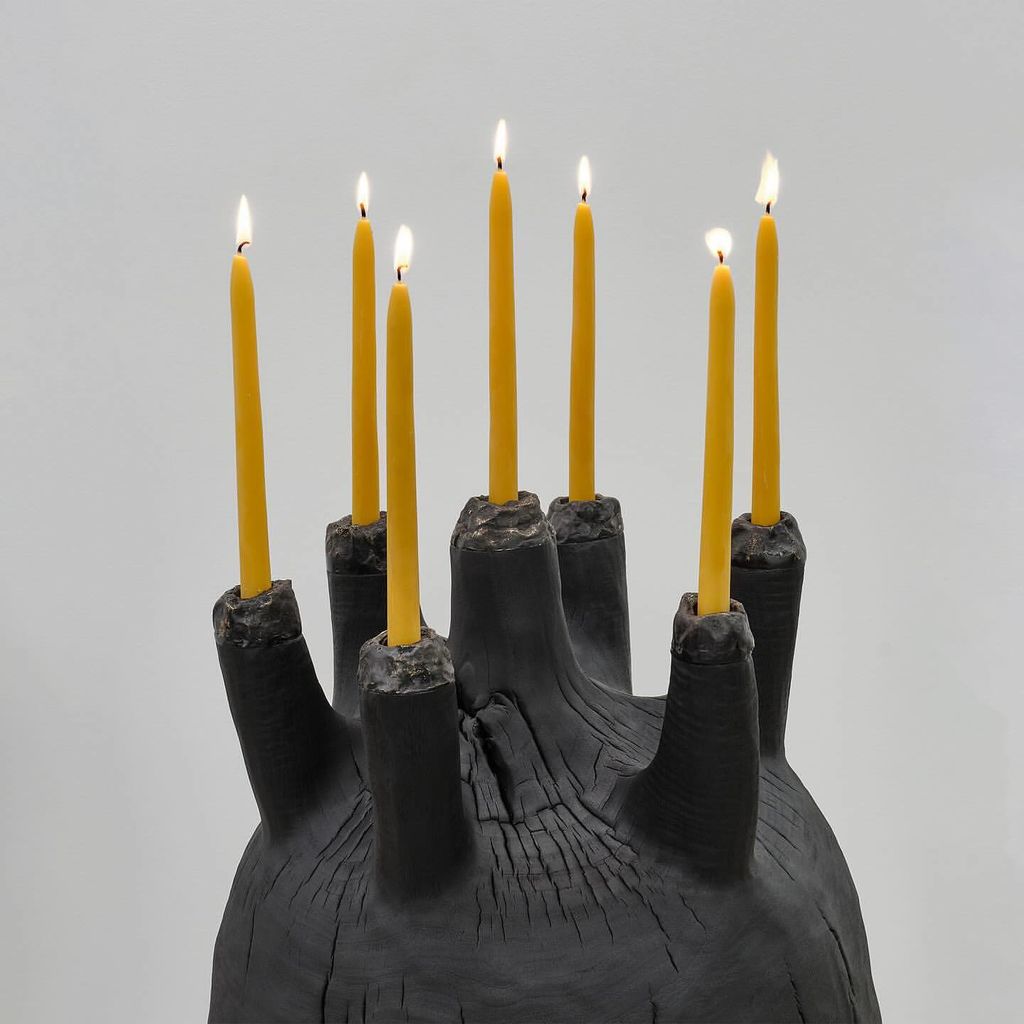 Charred claro walnut, sand cast bronze, oil and wax + beeswax candles.