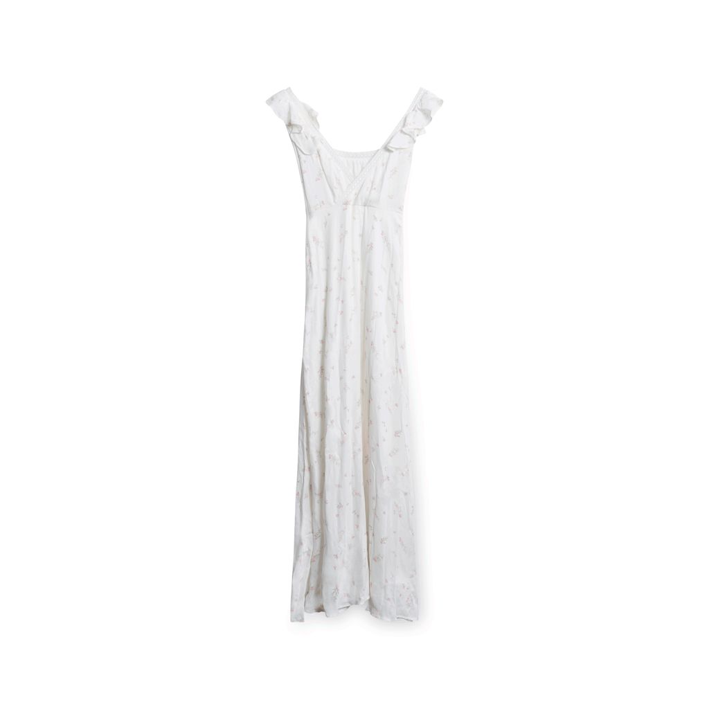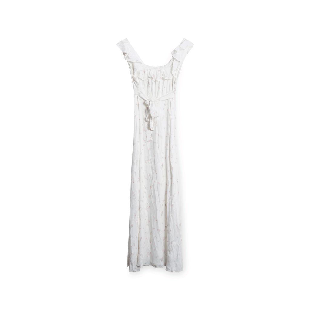 White dress featuring a square neckline and small pink flower pattern throughout. Backside of the dress features a v-shaped back and a tie at the waist. Touches of lace at the neck accent the dress. A zipper enclosure is located at the left side.