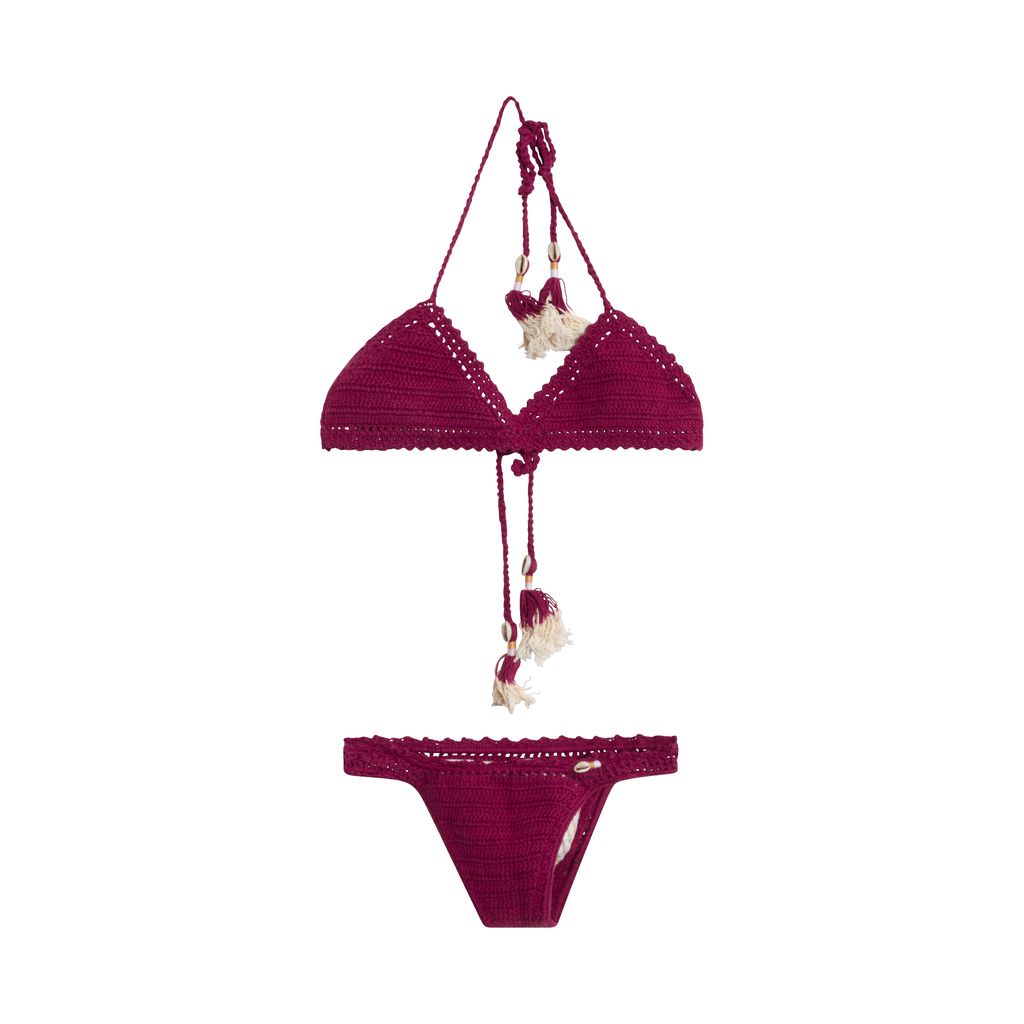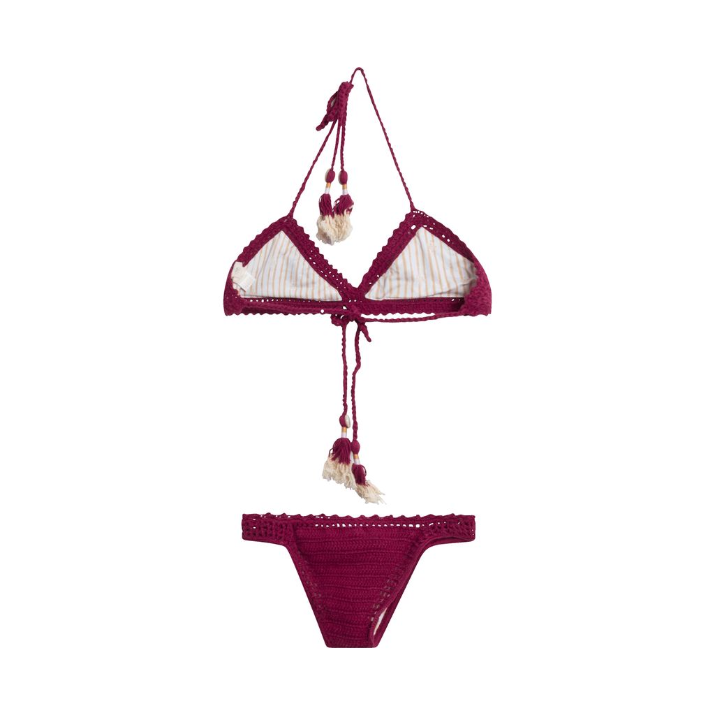 Like new. Selling as a set. One cotton crochet sliding halter bikini top with sliding, adjustable cups. One cotton crochet cheeky bikini bottom with elasticated waist and leg openings. Fully lined. 100% cotton crochet with Lycra lining. Featuring intricate crochet detailing, finished with signature She Made Me detailing and block-printed stripe lining. Not waterproof