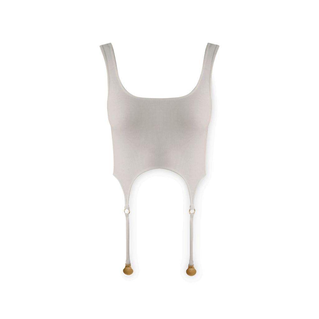 That perfect rib knit tank top transformed into a garter. Buttery soft fabric stretches across the body for a perfect fit every time. The straps drape from the bodice to attach to stocking or let them dangle for a more casual look. The hardware is KZ signature hand casted solid brass with a shell motif garter clip. Wear as a lingerie piece or style with a high waisted wide leg pant (blazer optional) for a chic look.