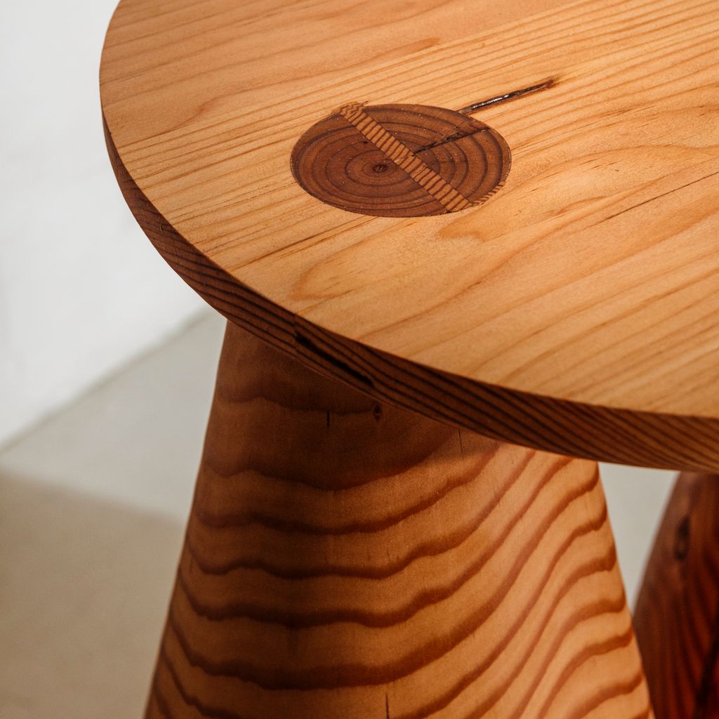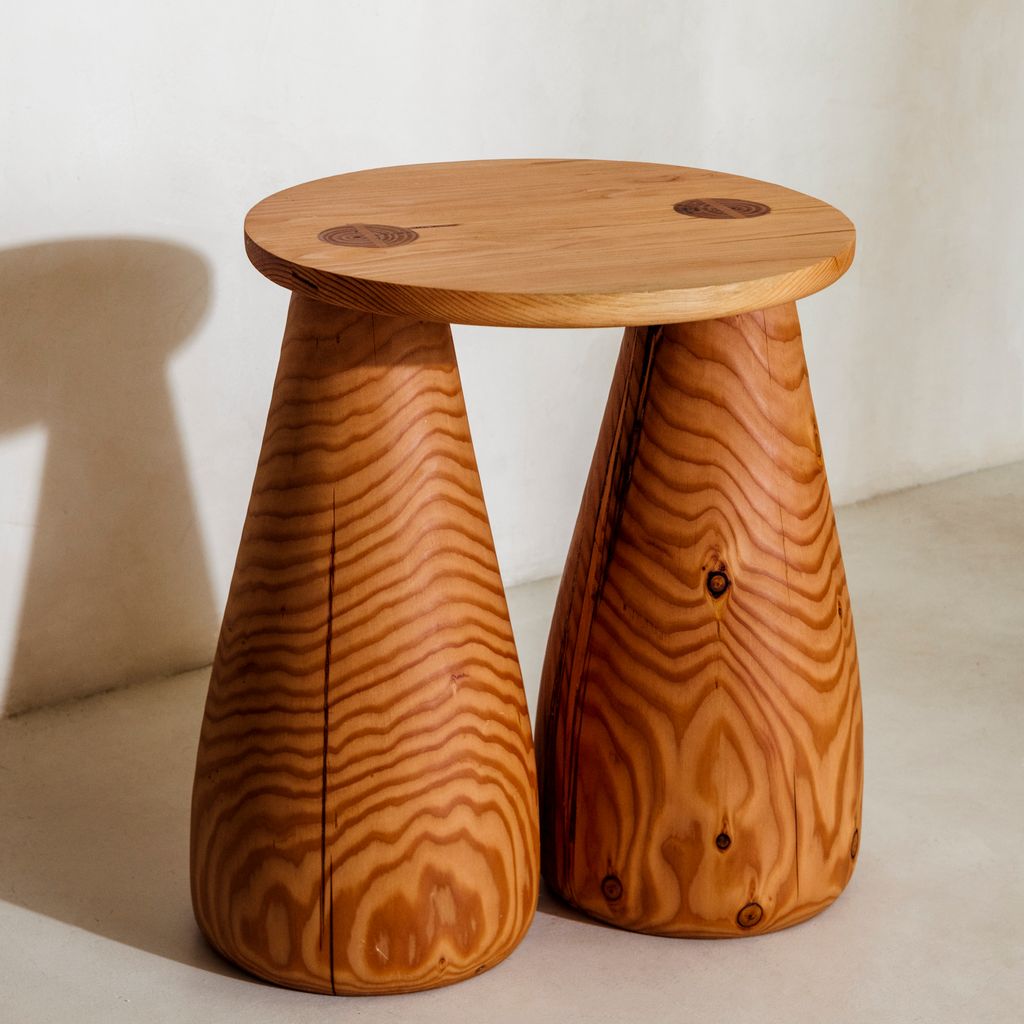 The Side Table is made from salvaged douglas fir and treated with a clear natural oil finish. The side table has large bell shaped legs that are signature to Klemick's work. This side table is made to order.