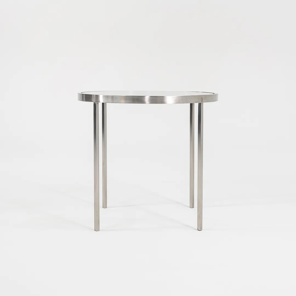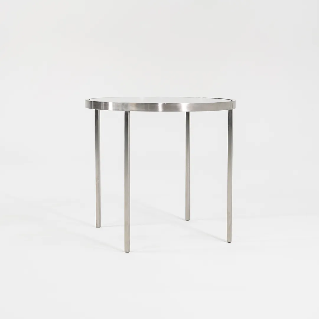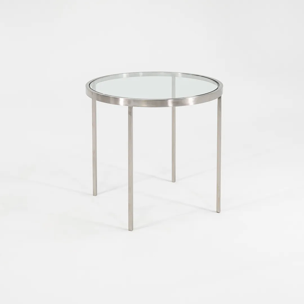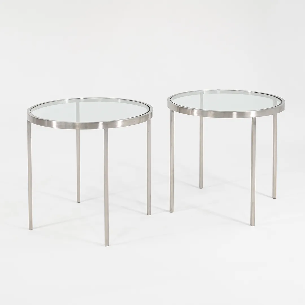 These are two (sold individually) custom solid stainless steel side tables by Gratz Industries. The tables were used as showroom models in Gratz's Philadelphia showroom and they appear to be in superb condition. The glass tops sit flush with the stainless edge.