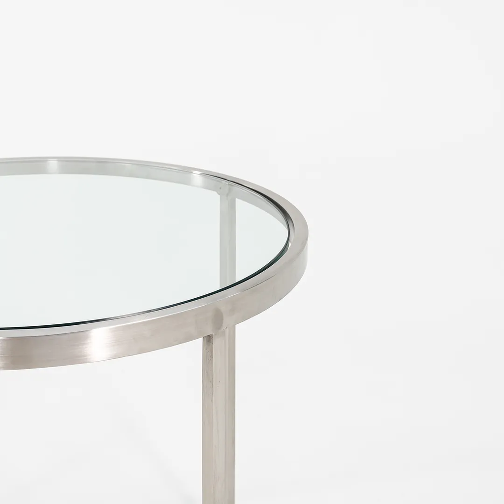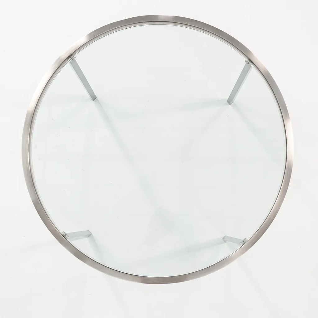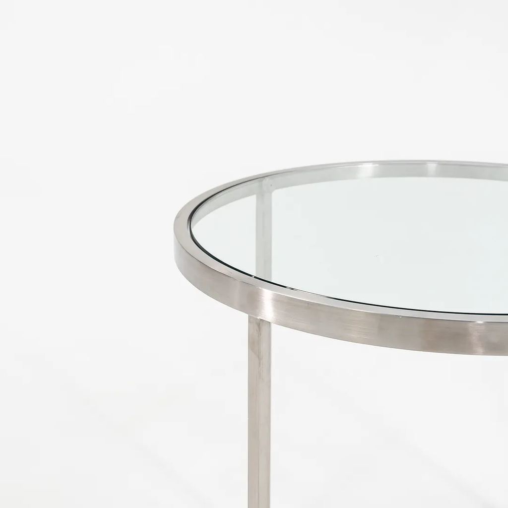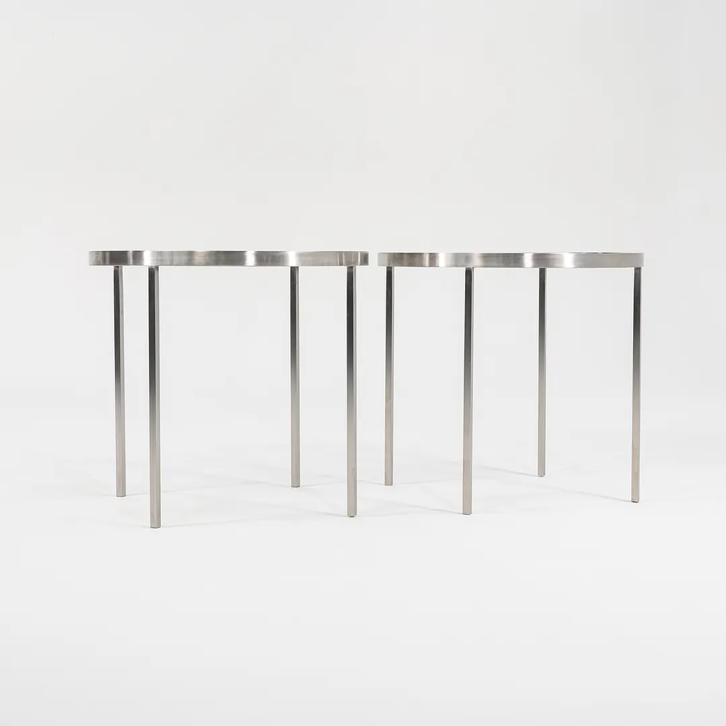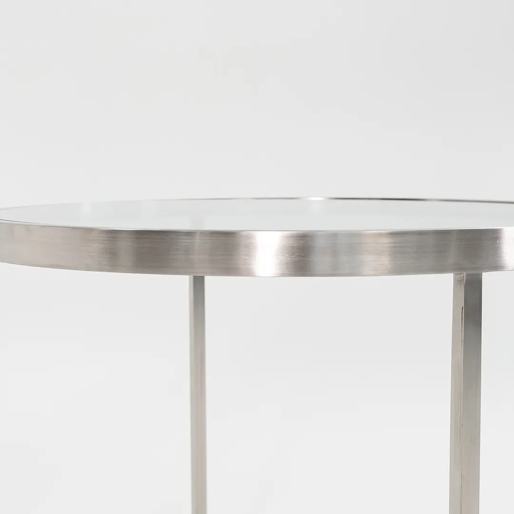 These are two (sold individually) custom solid stainless steel side tables by Gratz Industries. The tables were used as showroom models in Gratz's Philadelphia showroom and they appear to be in superb condition. The glass tops sit flush with the stainless edge.