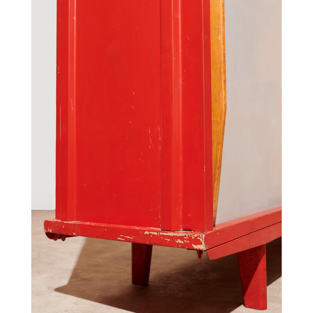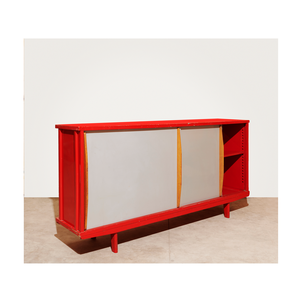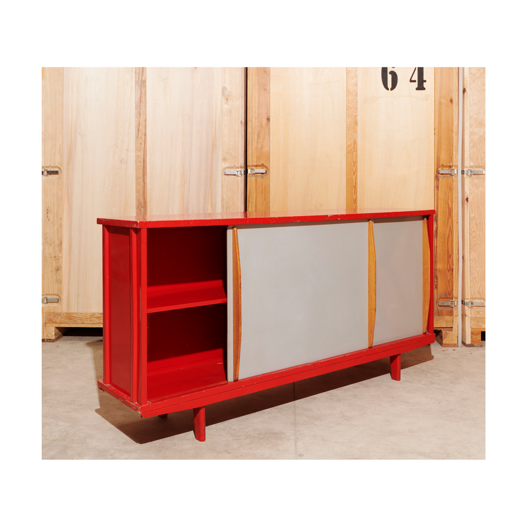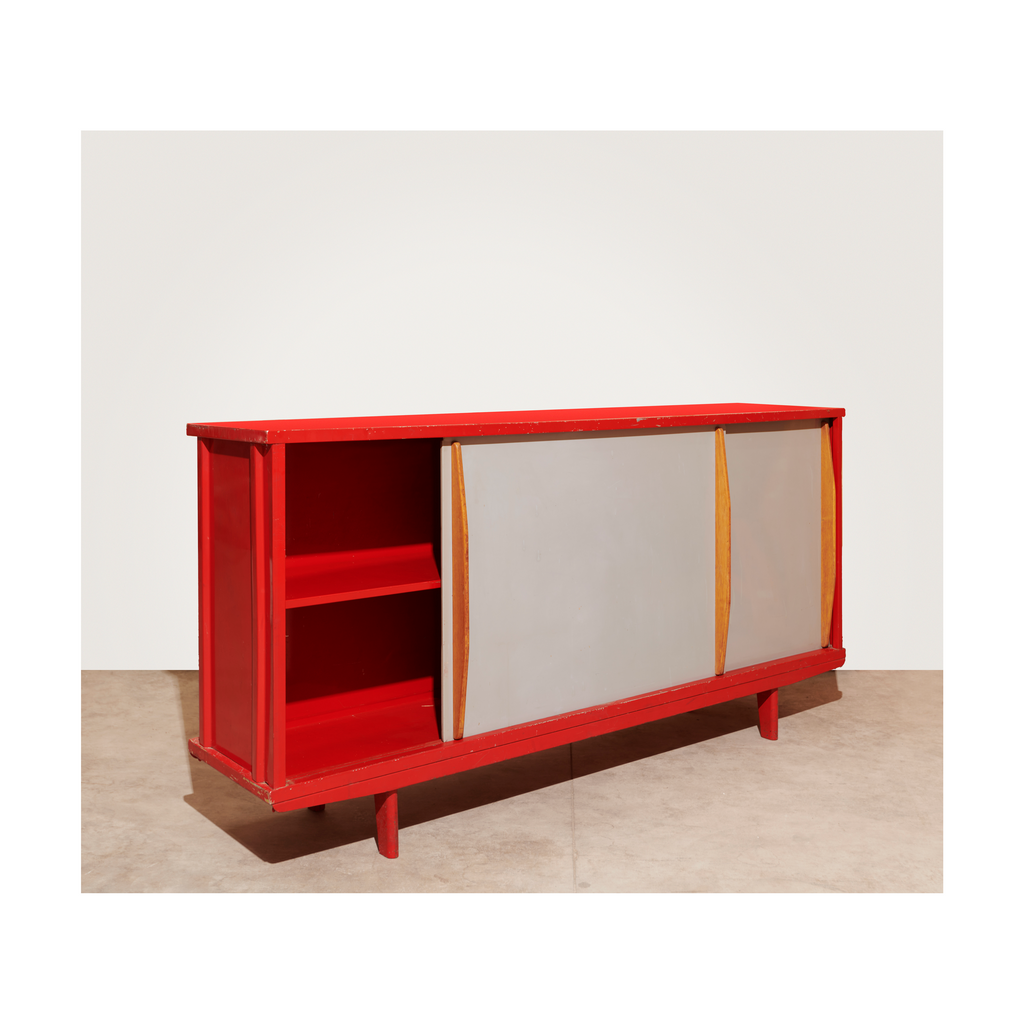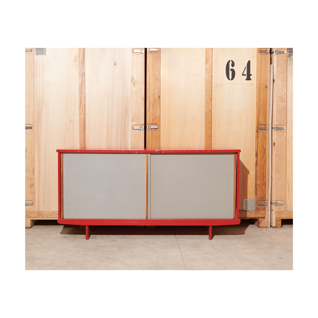 Structure in aluminum sheet and base in folded and lacquered steel sheet "Corsair Red", sliding doors lacquered "Vermeer Gray" with profiled oak handles, two shelves on rails.
