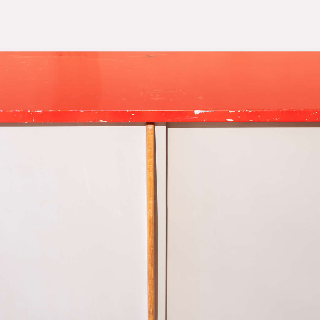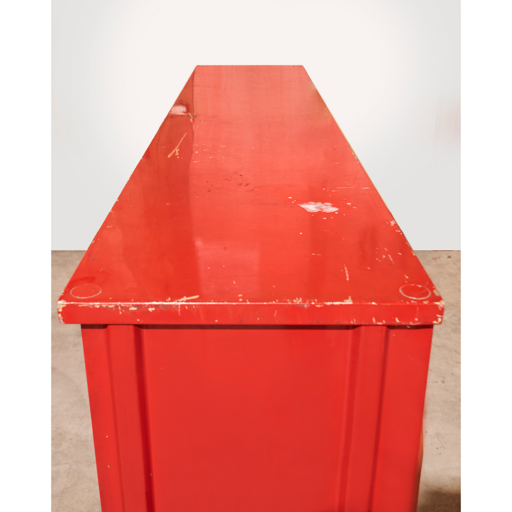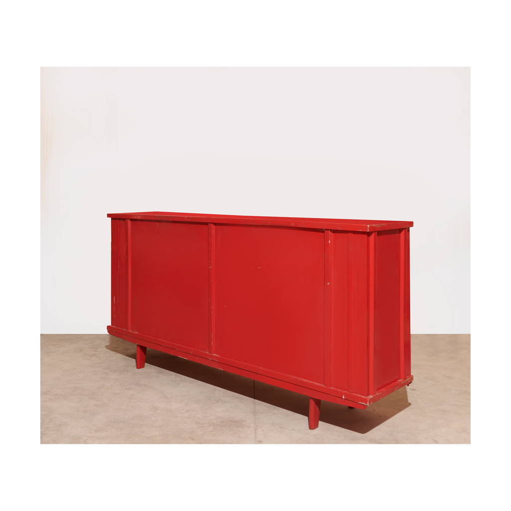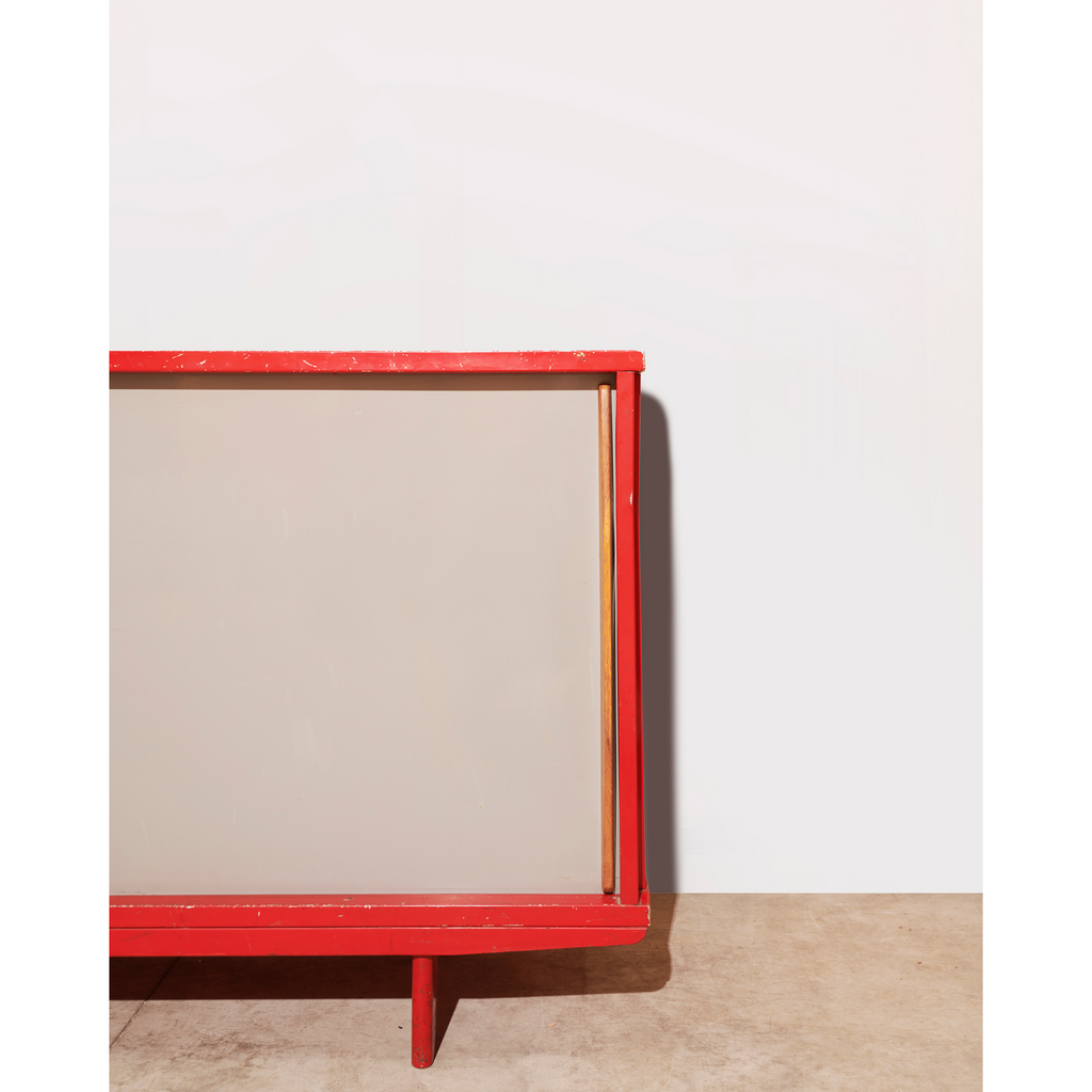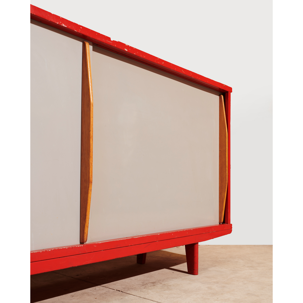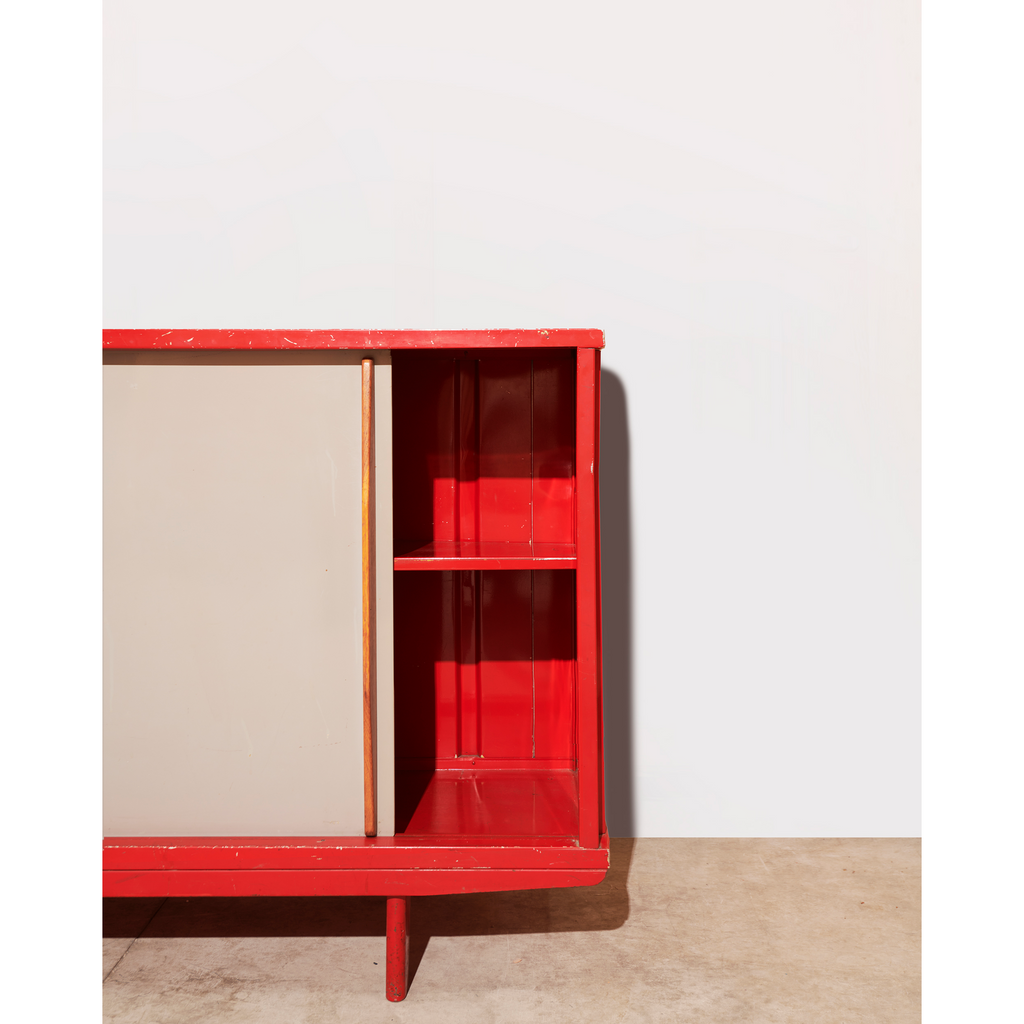 Structure in aluminum sheet and base in folded and lacquered steel sheet "Corsair Red", sliding doors lacquered "Vermeer Gray" with profiled oak handles, two shelves on rails.