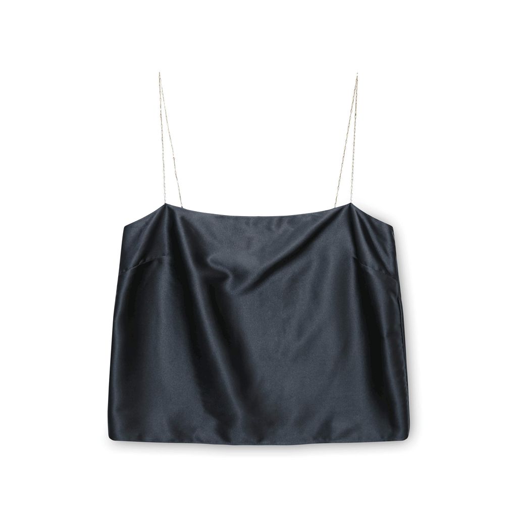 Crafted from fine silk, the cami tank falls at all the right places. 14K gold fill chain straps drape over the shoulder. This perfect little boxy cami is complete with a slit down the center back and finished with a hand casted solid brass hook clasp.
