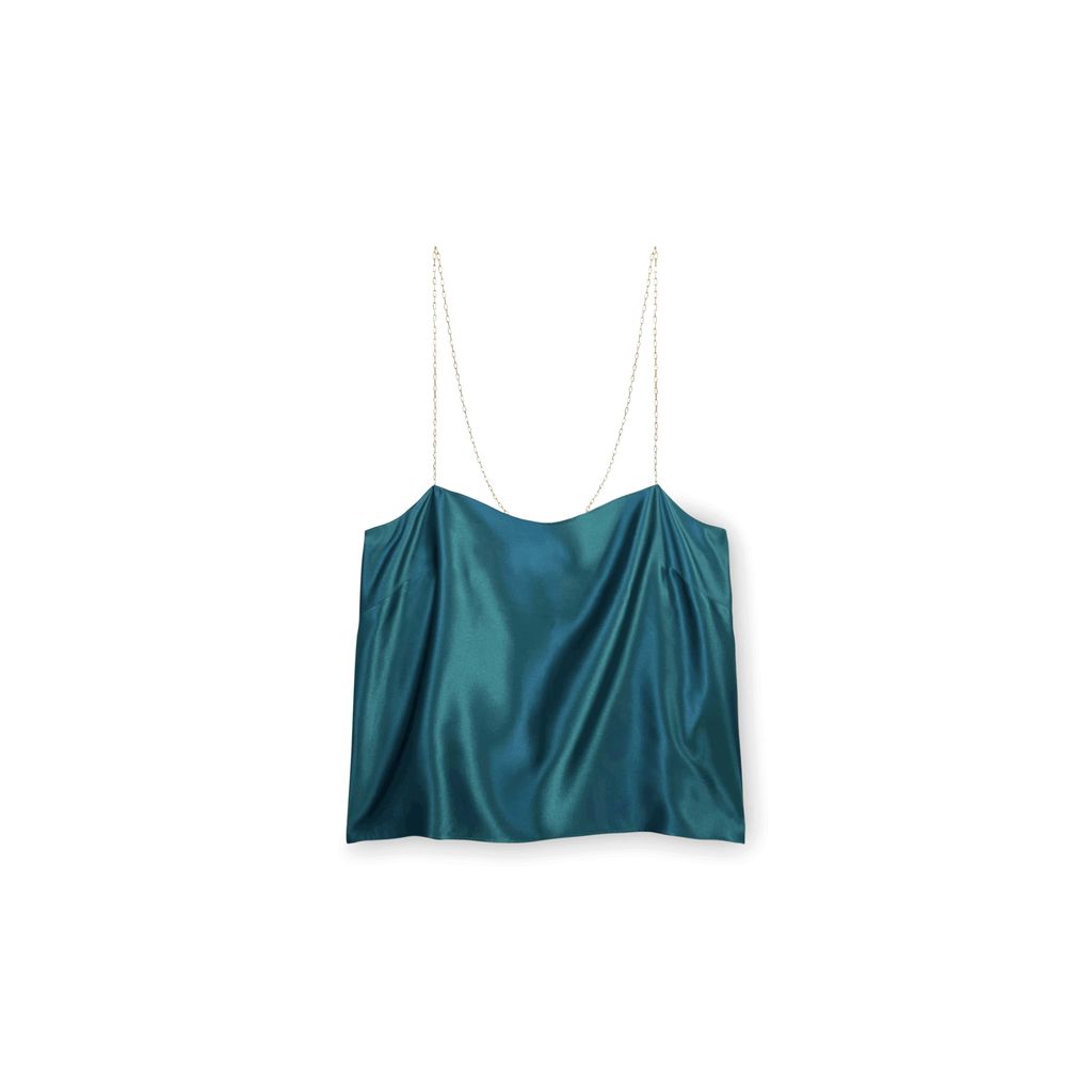 Crafted from fine silk, the cami tank falls at all the right places. 14K gold fill chain straps drape over the shoulder. This perfect little boxy cami is complete with a slit down the center back and finished with a hand casted solid brass hook clasp.