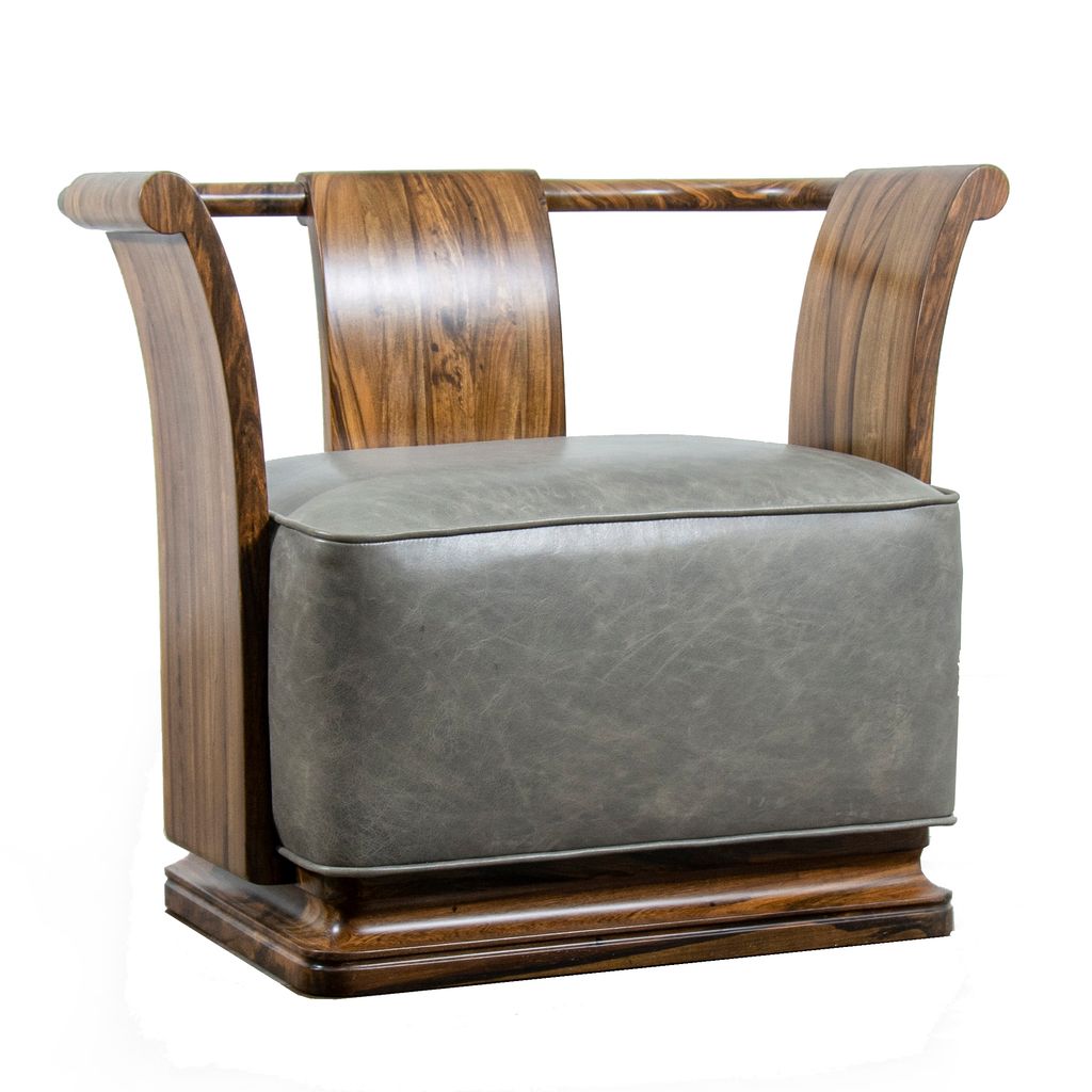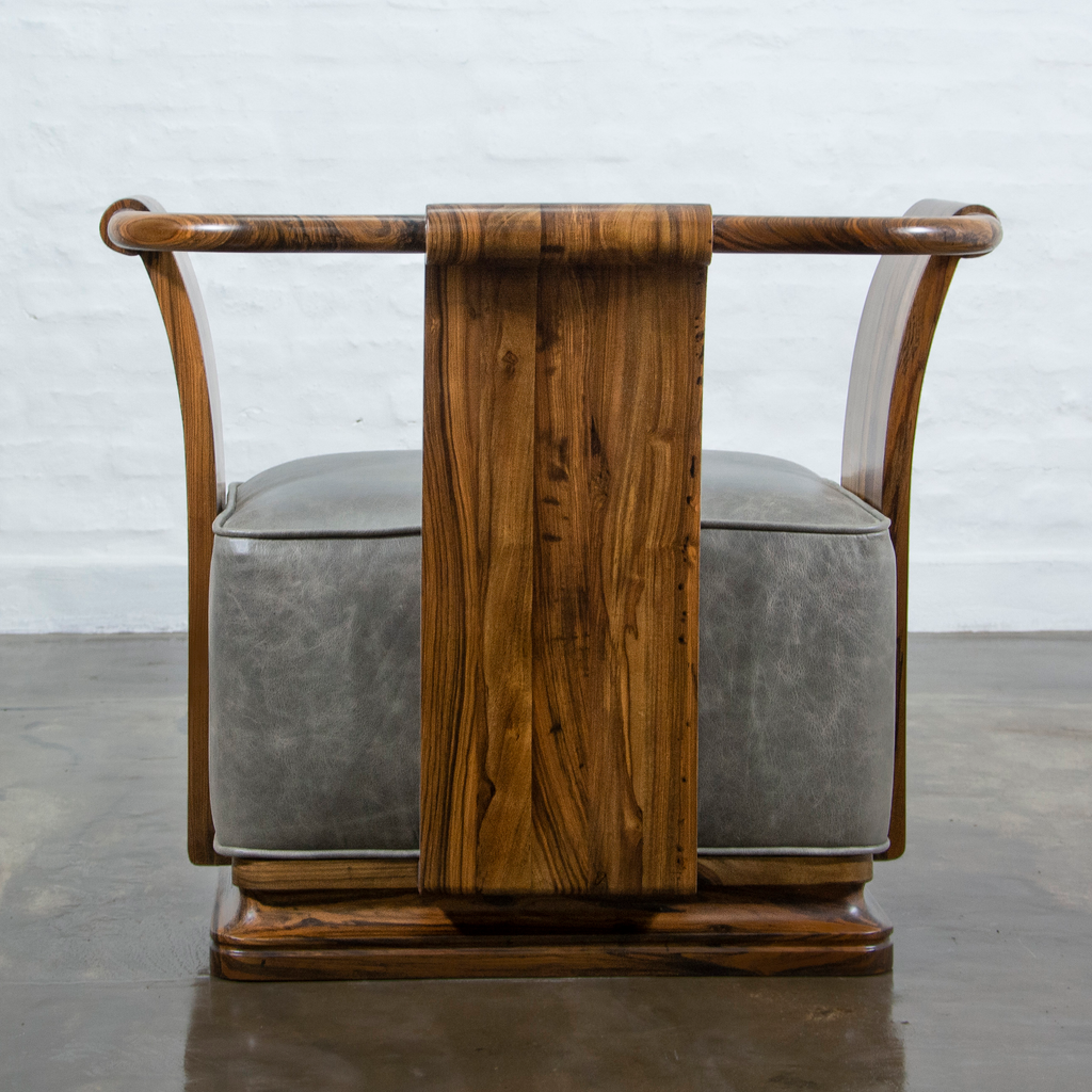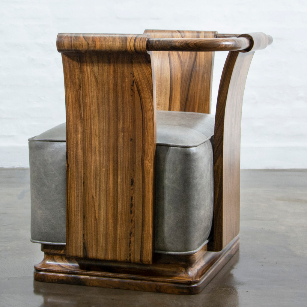 The Simone Chair’s gently sloping sides and back allude to forms from early 20th century Art Deco style. Shown in Argentine Rosewood but available in any solid wood and the upholstery material of your choice.