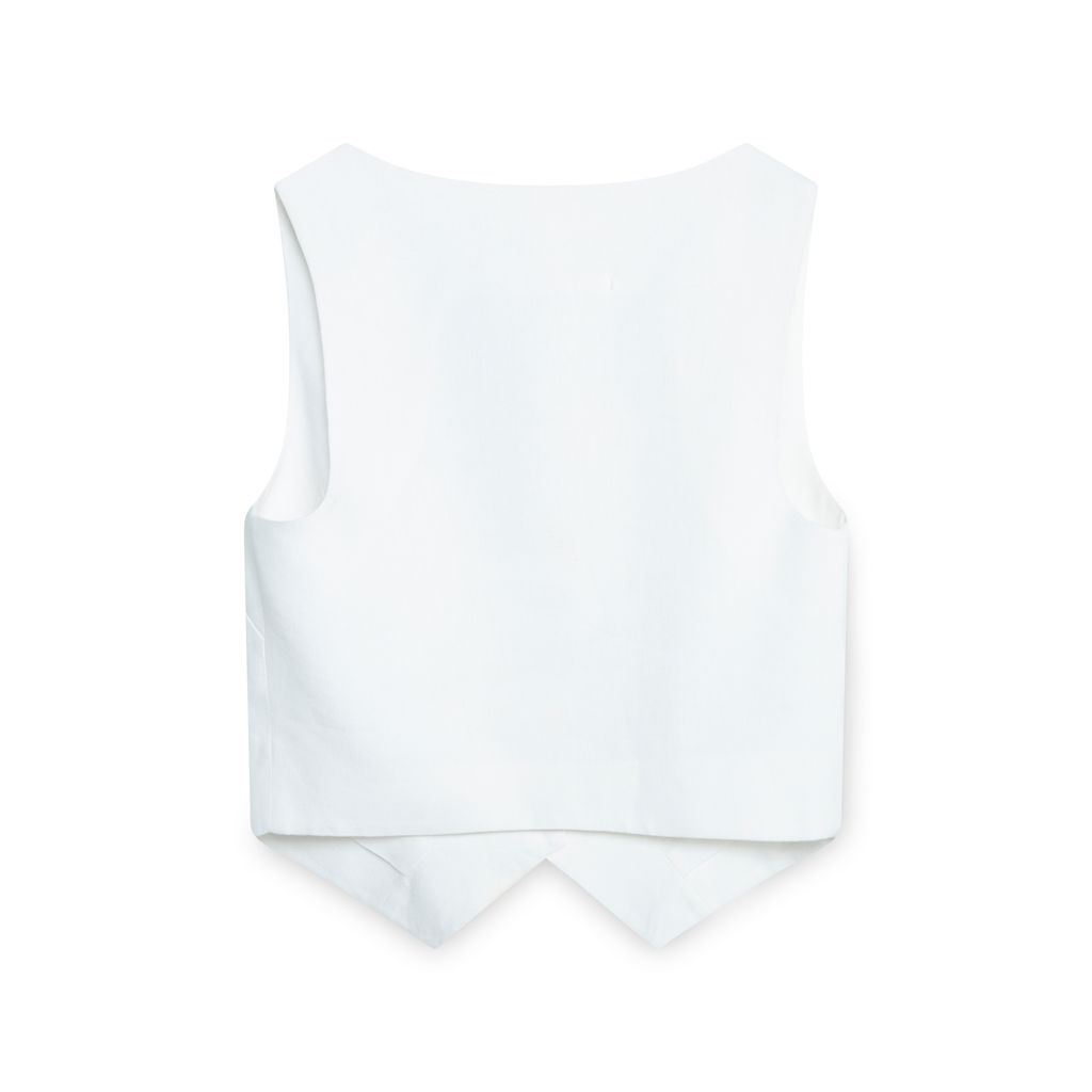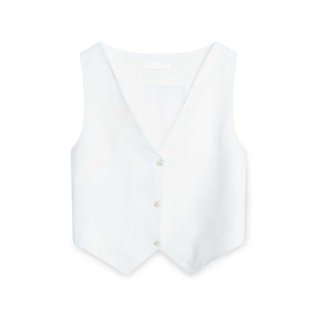 SIR. White Linen Vest features V-neck, front button closure, and sleeveless design.