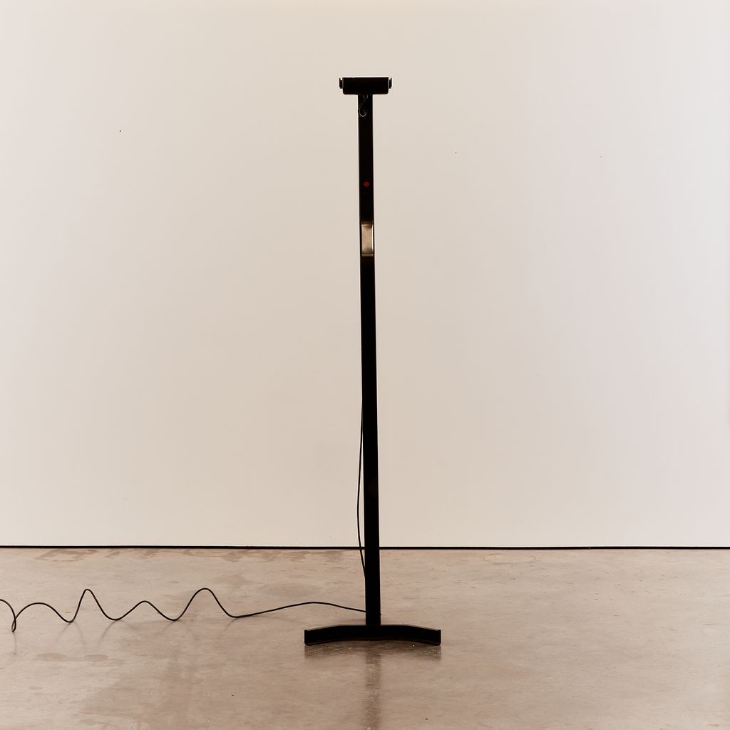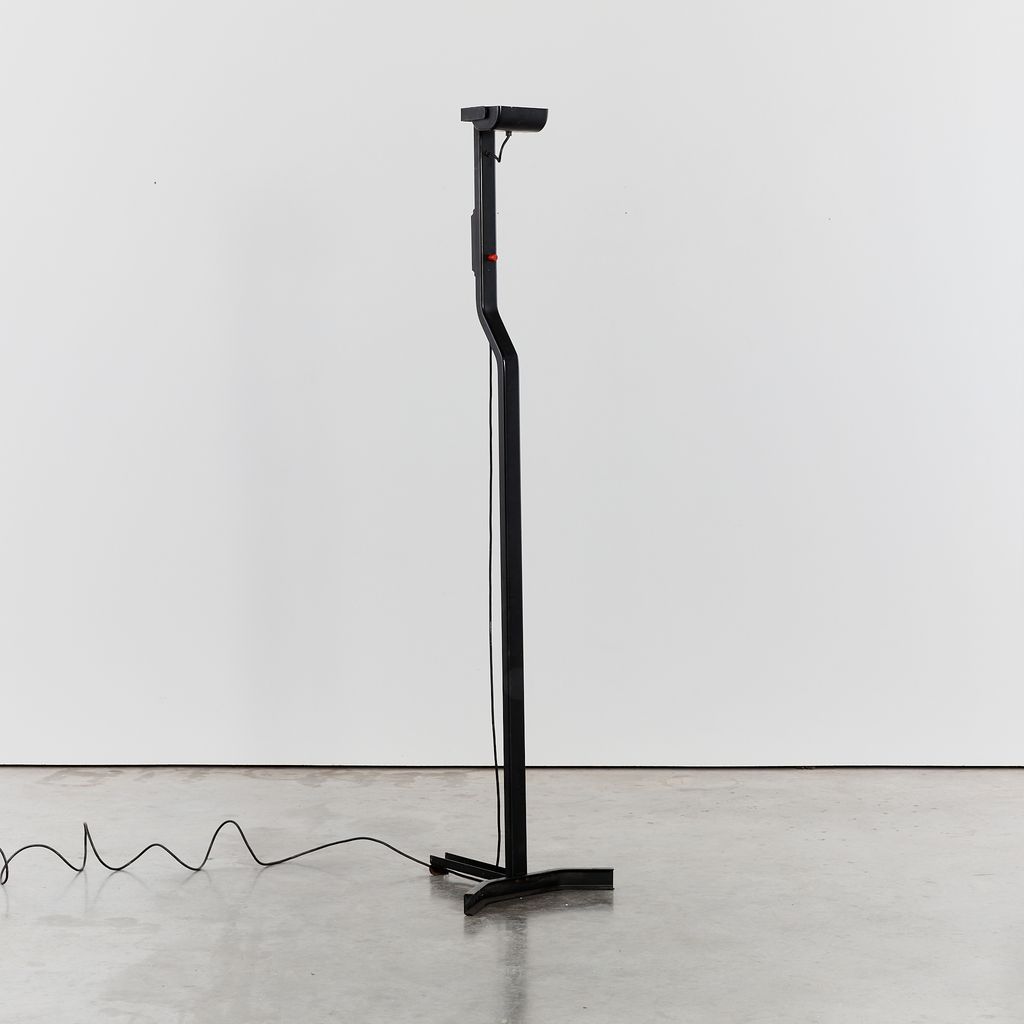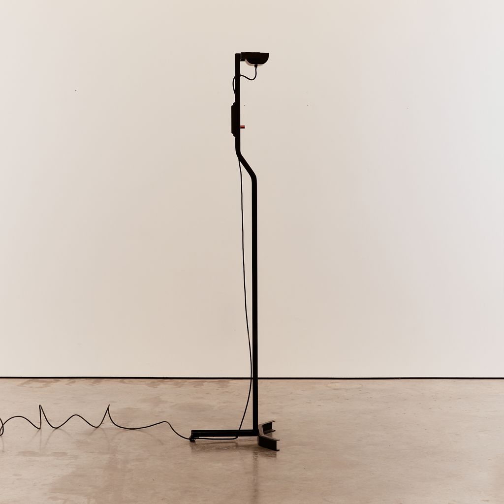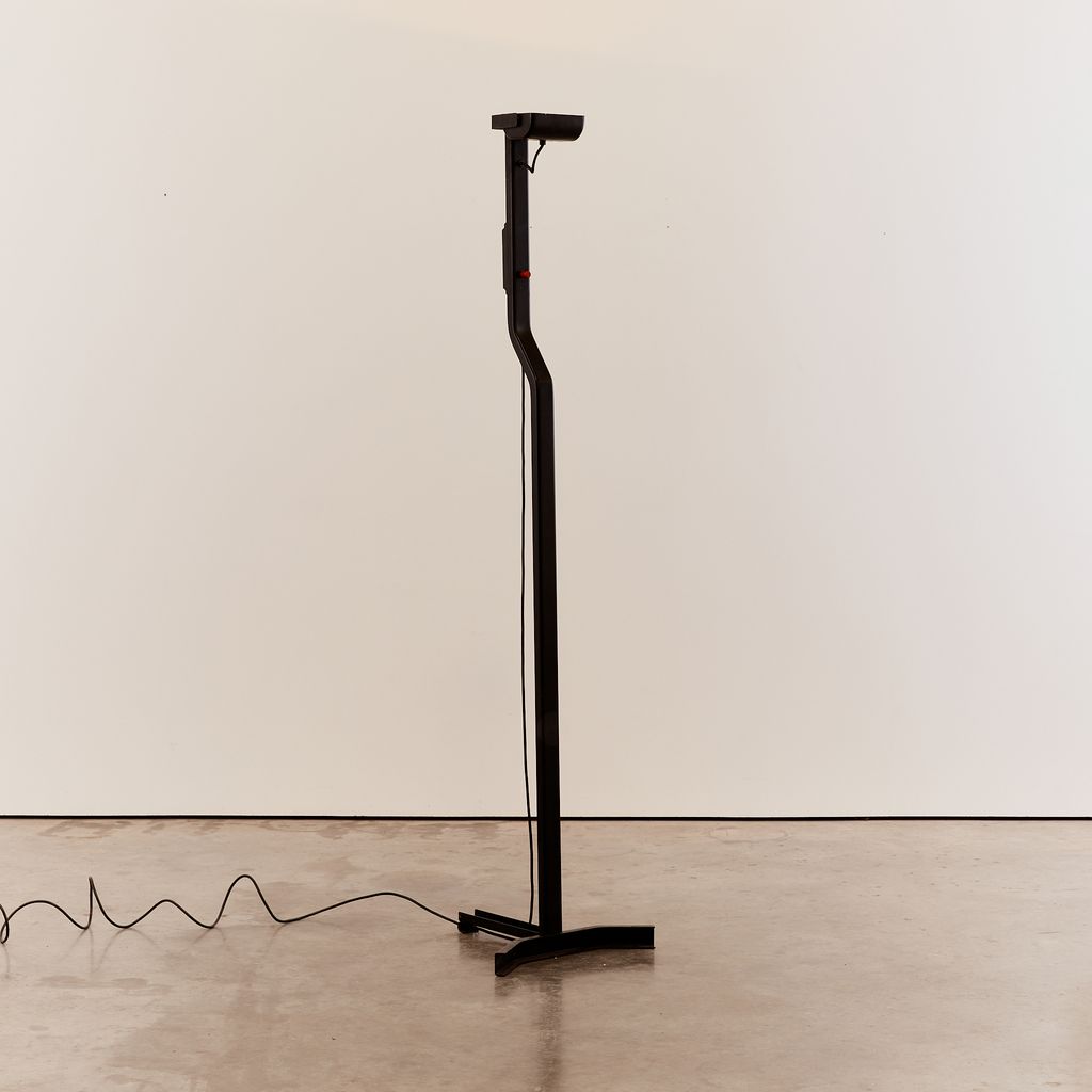 Sirio T floor lamp by Kazuhide Takahama with a matte black powder coating. No longer in production, this distinctive floor lamp features the hallmarks of Takahama's minimal/technical designs.