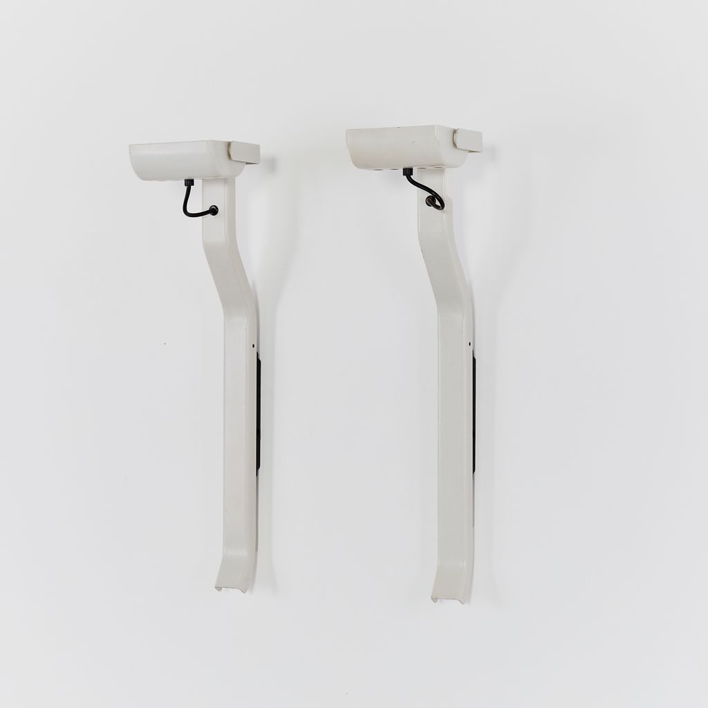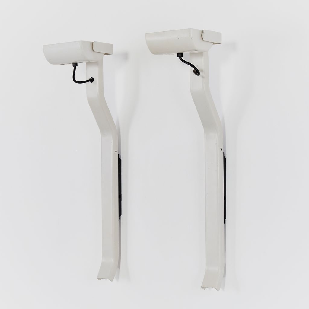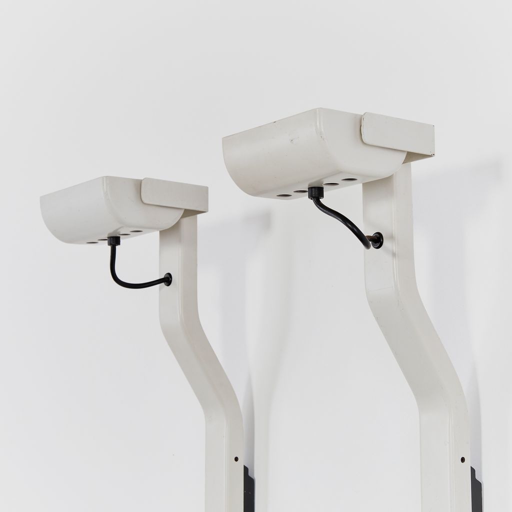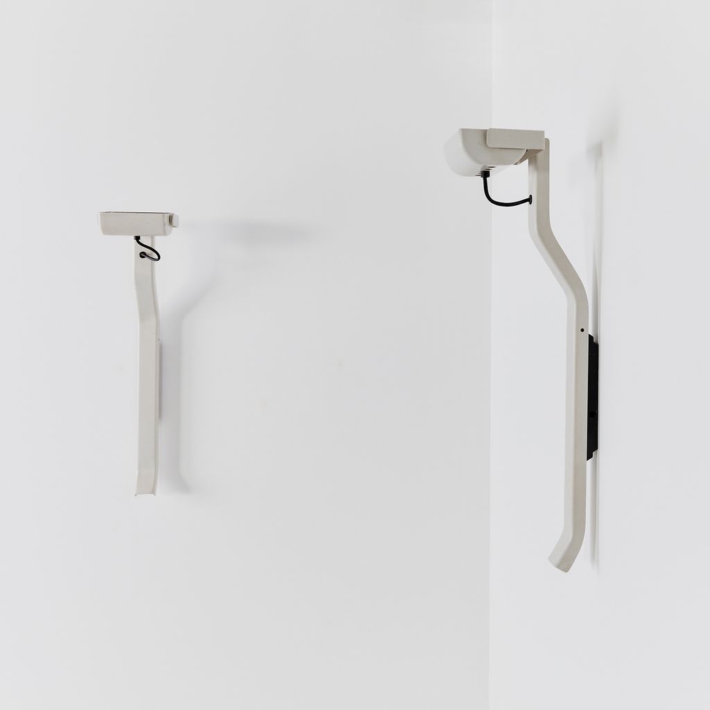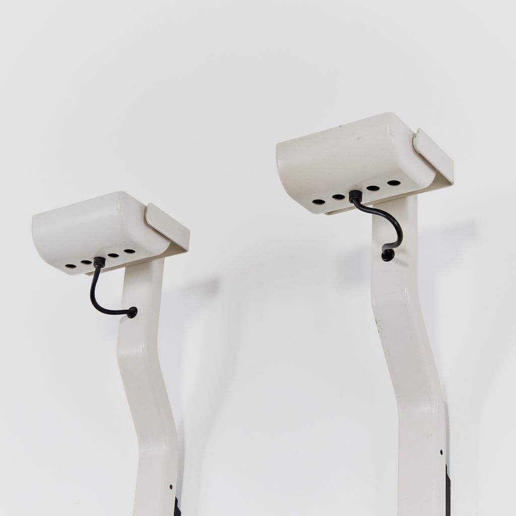 Sirio wall sconces by Kazuhide Takahama with an off-white powder coating. No longer in production, these distinctive wall lamps feature the hallmarks of Takahama's minimal/technical designs. Requires electrician to wire in to the wall. Three available, sold separately.