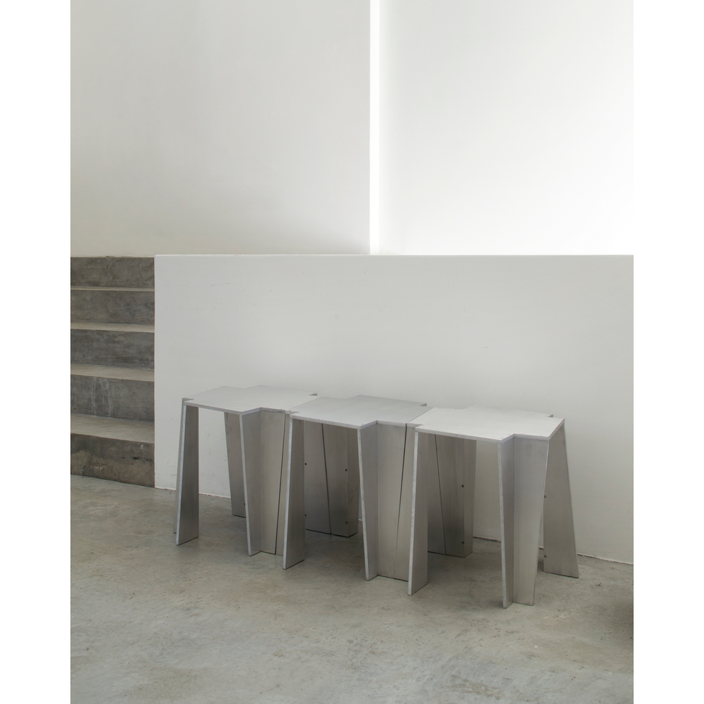 The three versions - Skew I, Skew II, Skew III - share industrial materials and details—like exposed screws and brushed aluminum—but differ in their angles and assembly methods, forming a visual dialogue of edges, lines, and surprising perspectives.