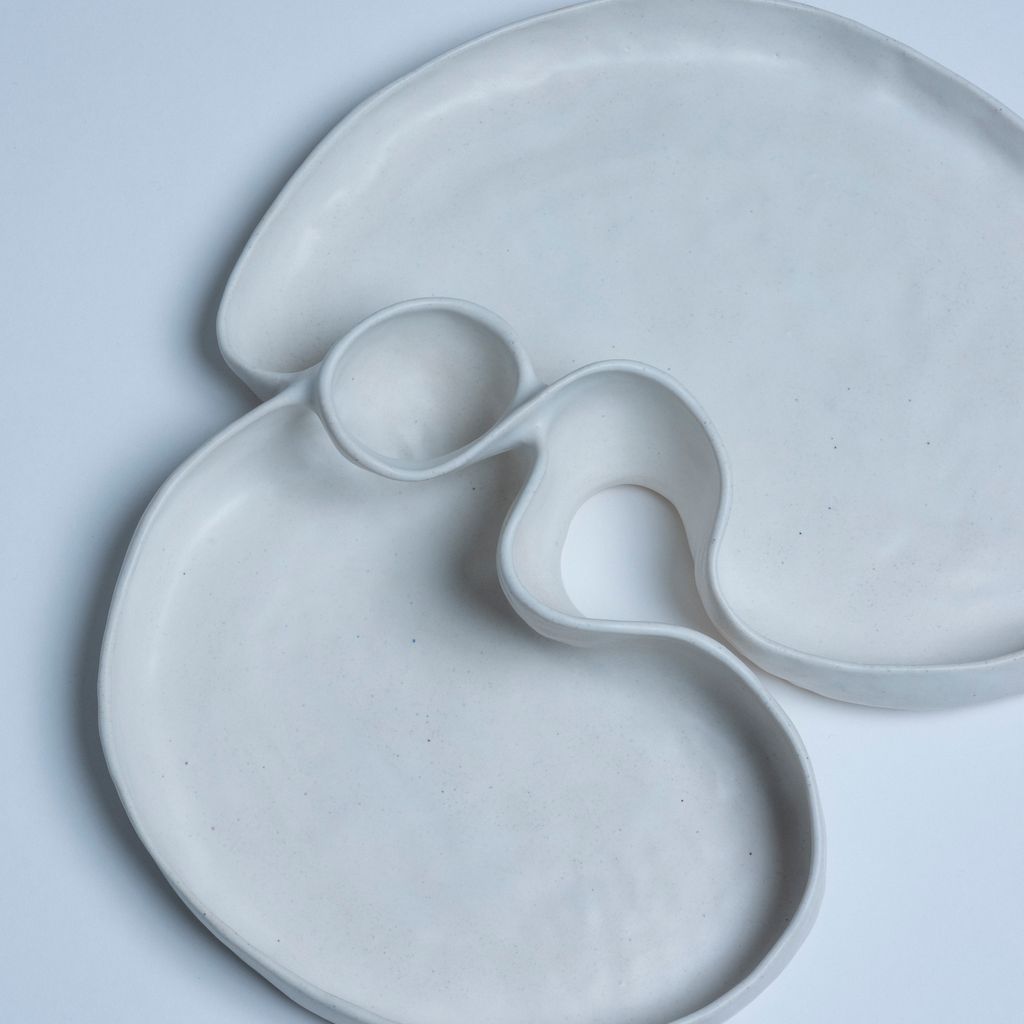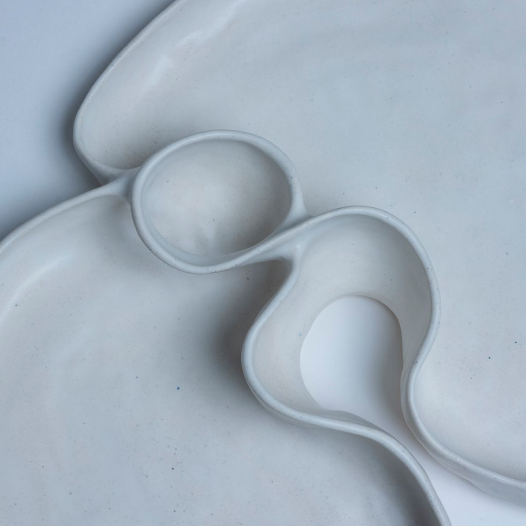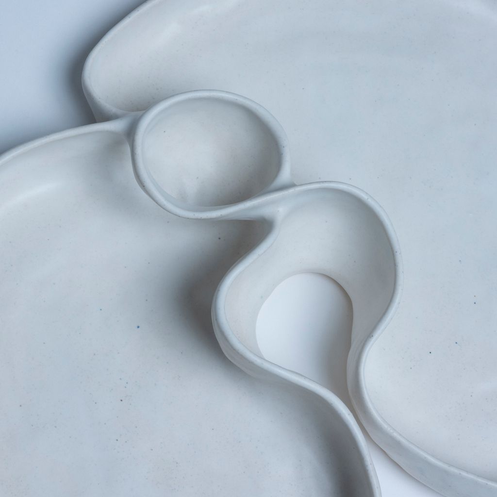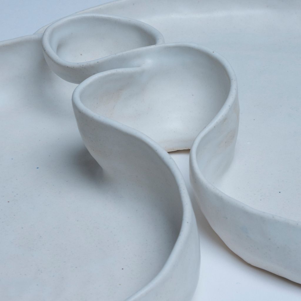 This hand built stoneware platter is inspired by intertwined curves carved by skiers on a mountain face. The work can sit table top or hung vertically via a french cleat.