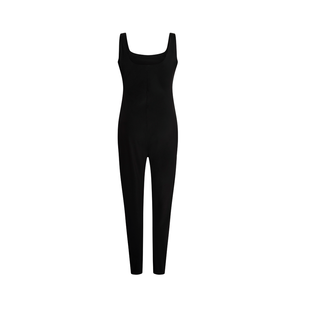 Skims Black Jumpsuit features pullover fit, 69% nylon, slightly elastic fabric.