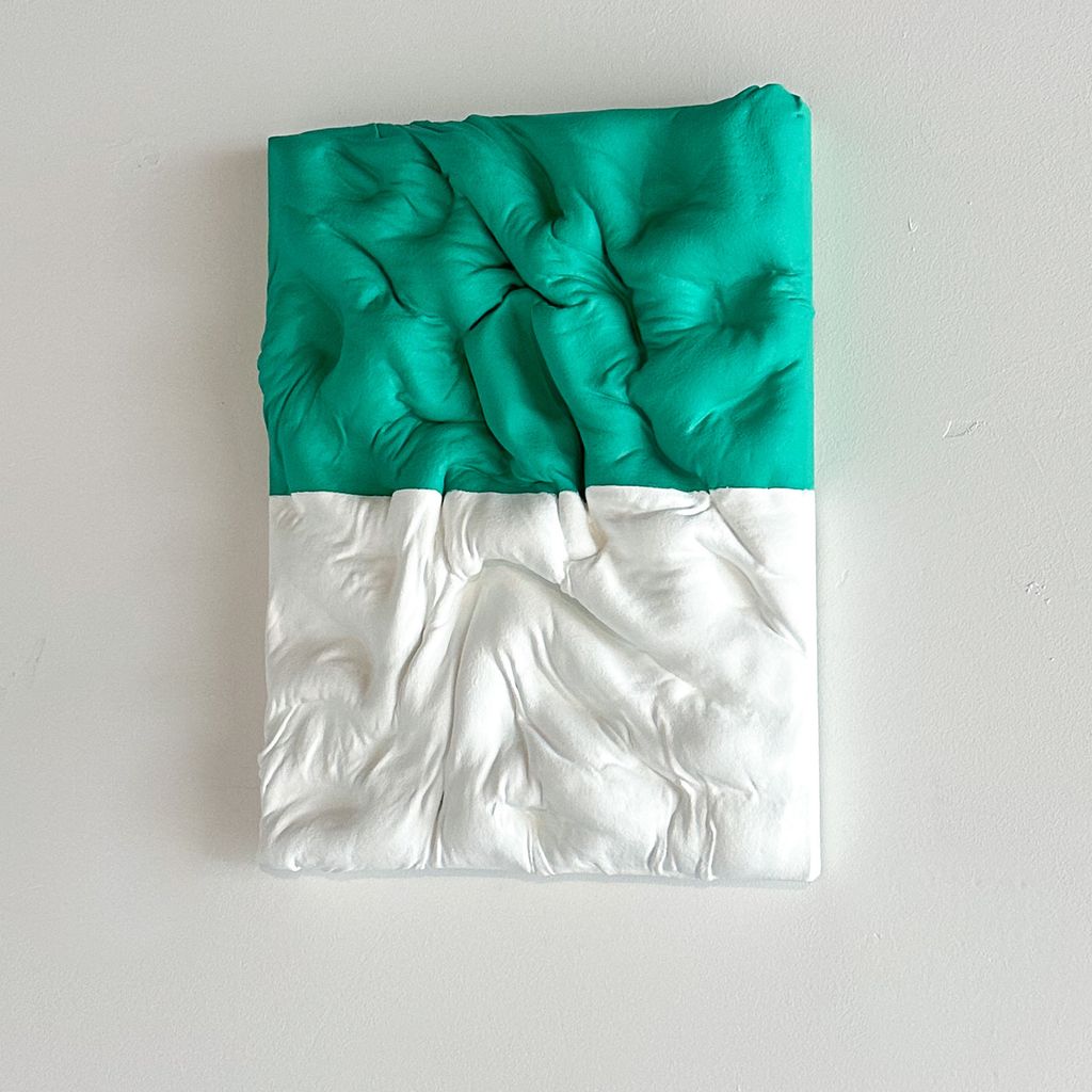 Flashé, cotton (worn t-shirt), molding paste on birch panel.