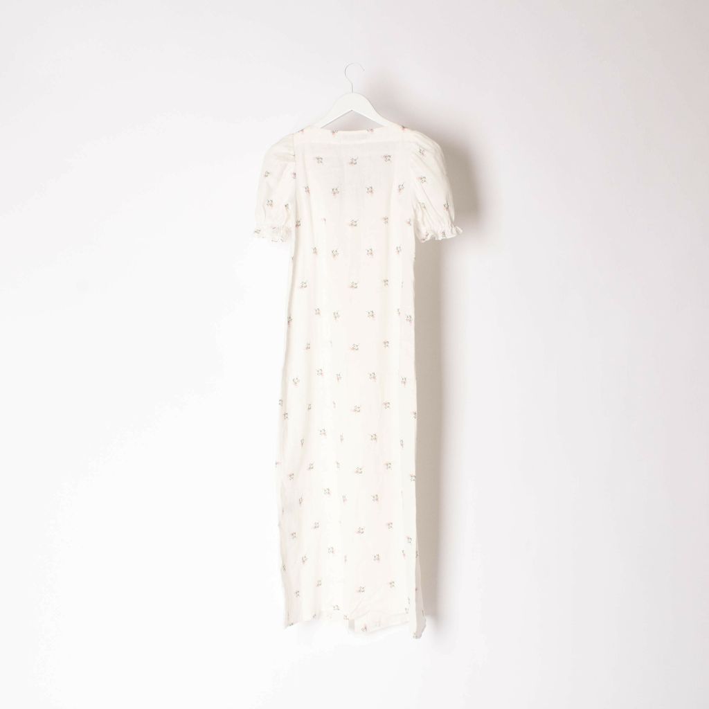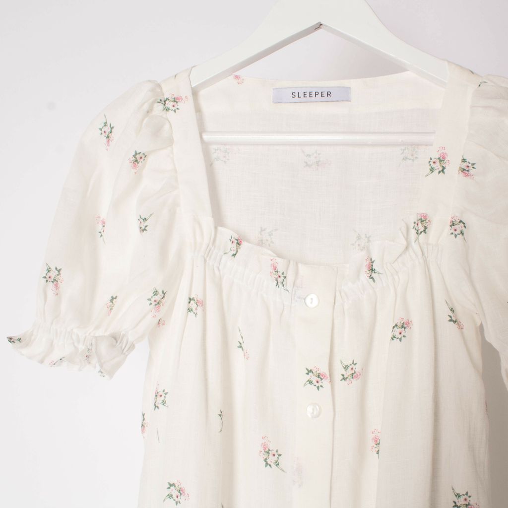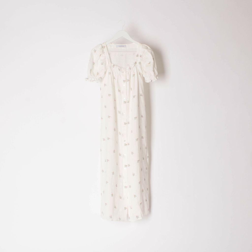 Sleeper brand white floral print peasant style linen dress with a full button down front and elastic at the neckline and arms. Size XS.