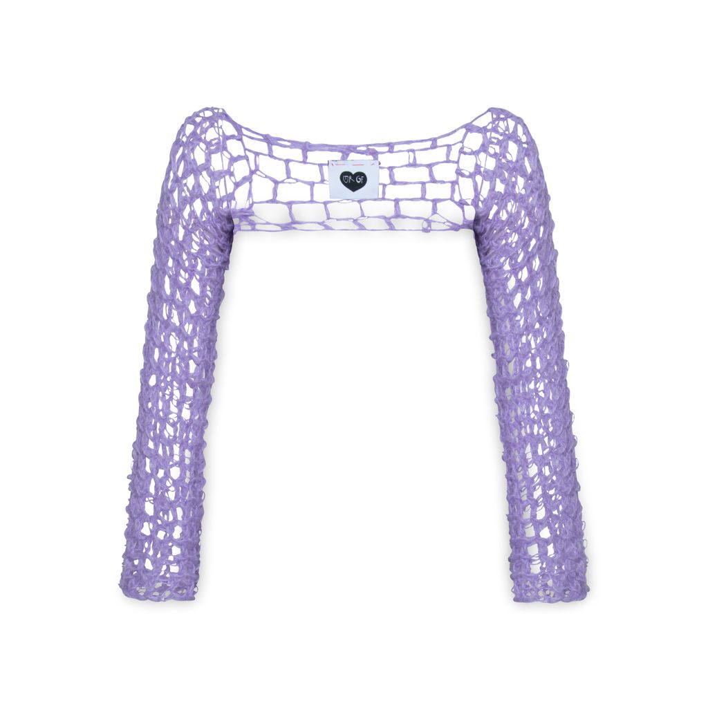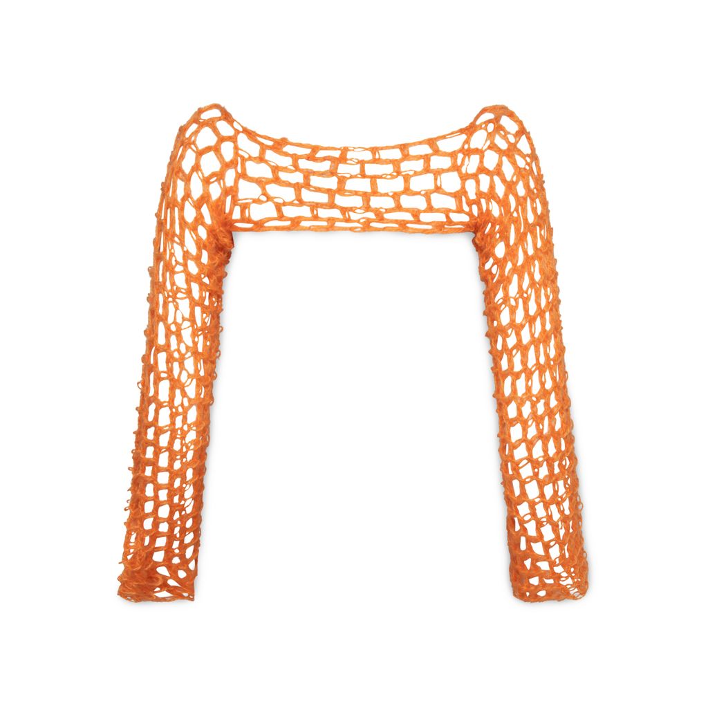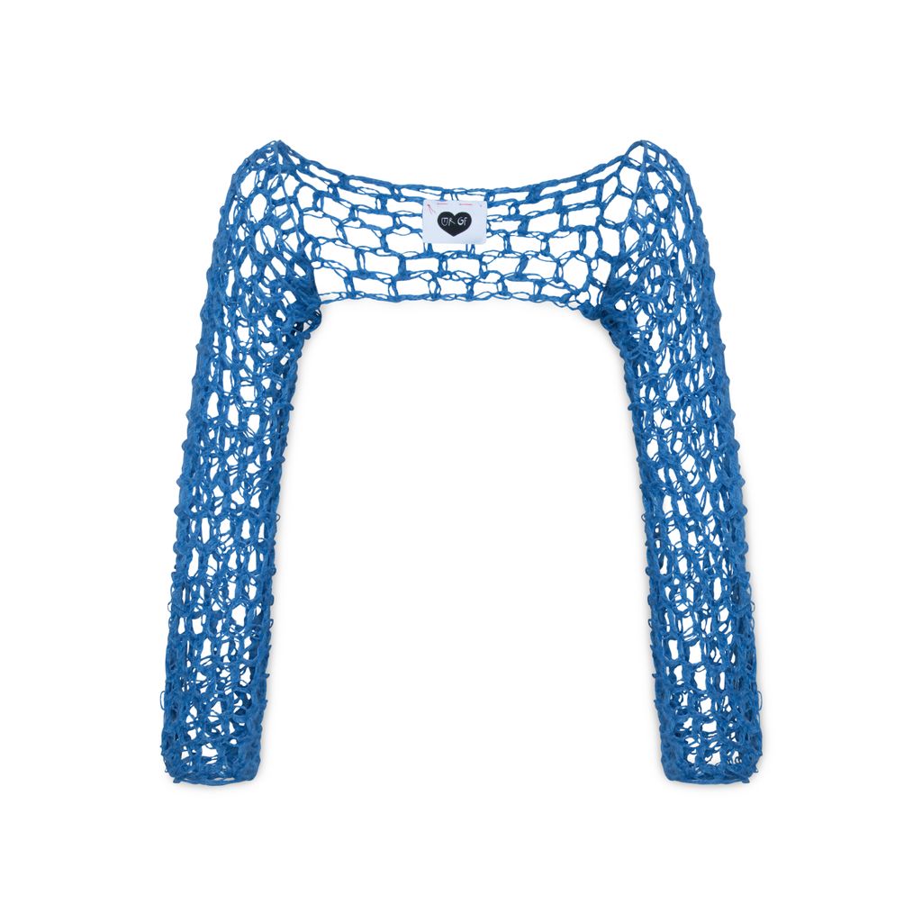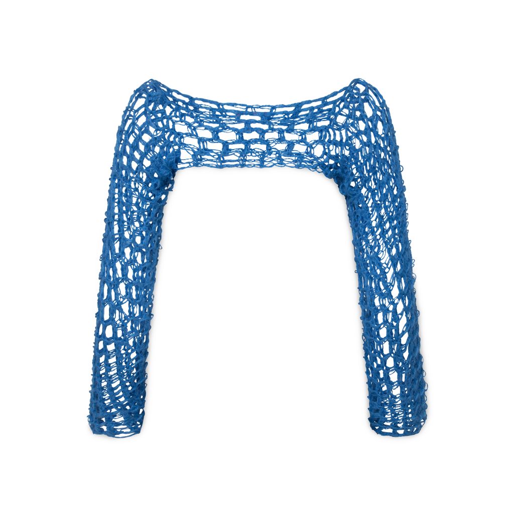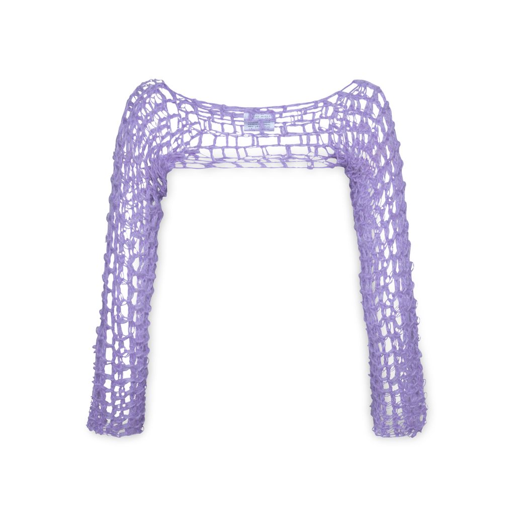 Hand crochet Sleeve features open chest design.