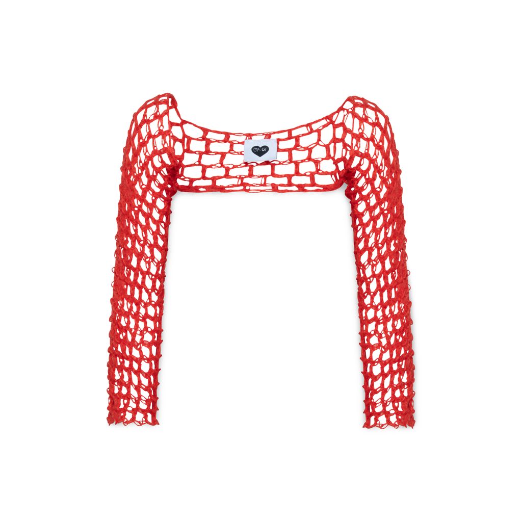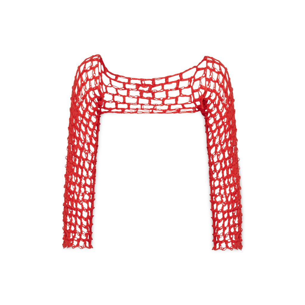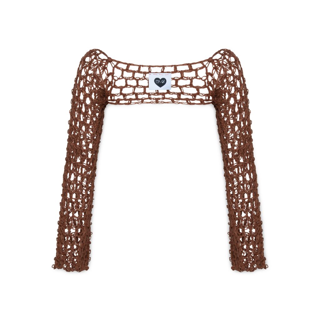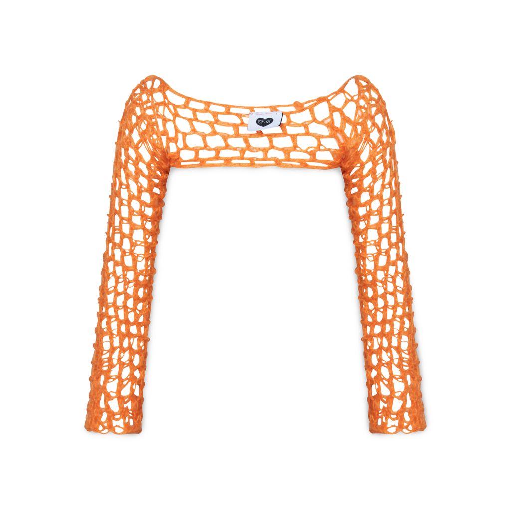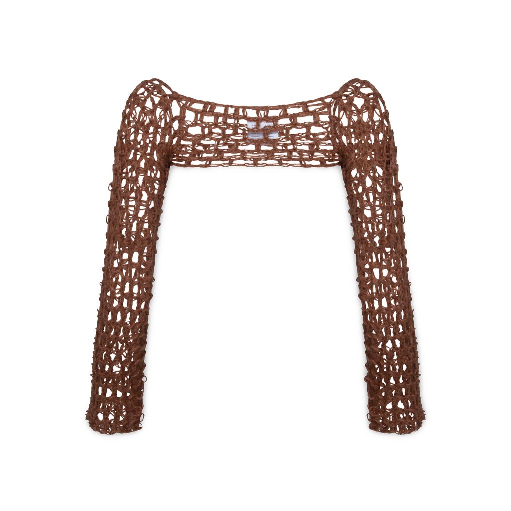 Hand crochet Sleeve features open chest design.