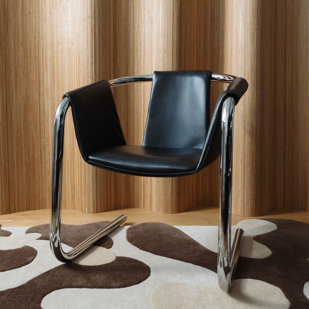 Vintage Zermatt Sling chairs designed by Duncan Burke and Gunter Eberle for Vecta Group of Dallas and manufactured in Italy in 1973. Black leather upholstery on a sturdy chrome base.