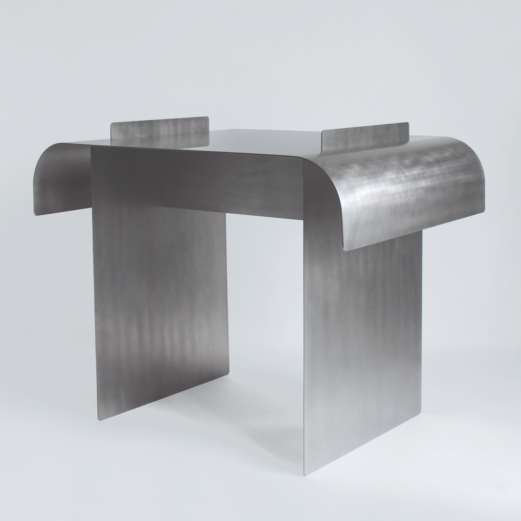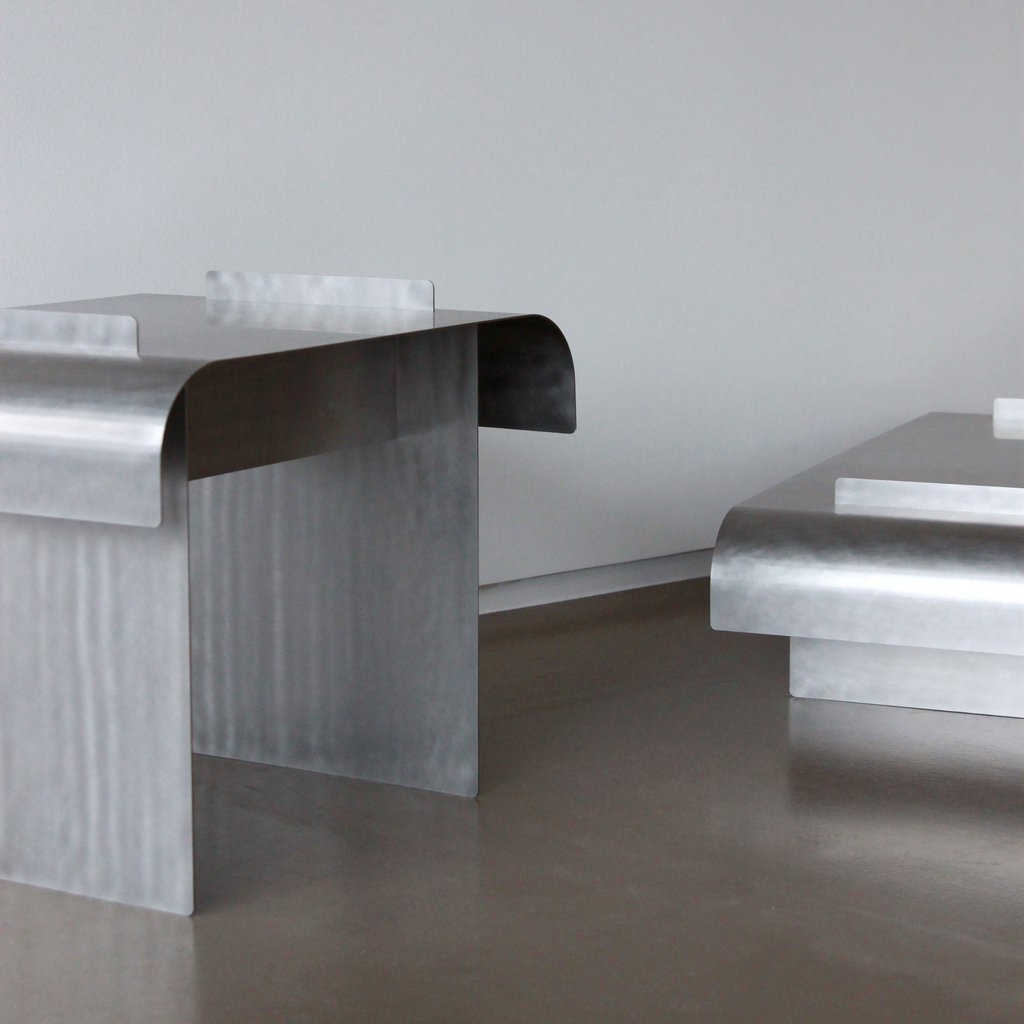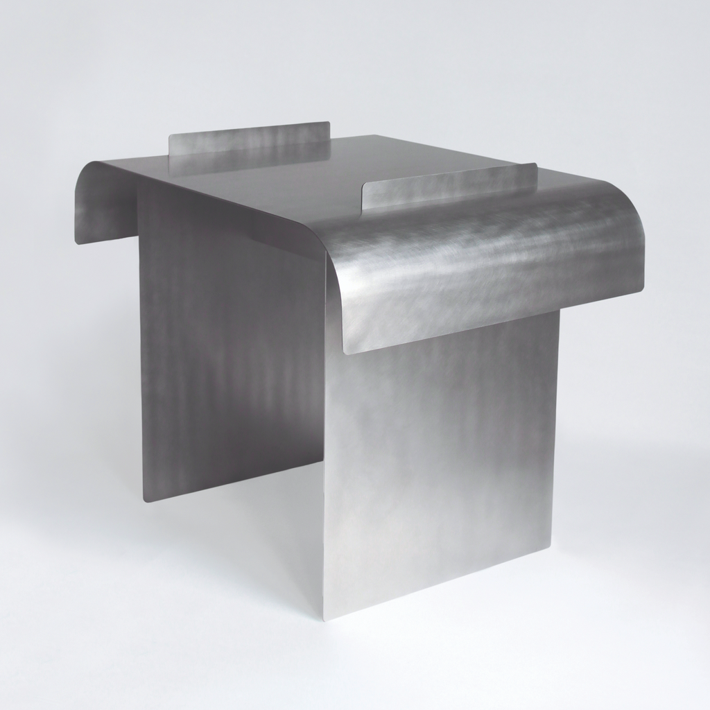 Bend Small, 2018 is a stainless steel side table constructed without screws, welding or glue. Each plain of the table interlocks within another providing support and resulting in a form that can be easily assembled and disassembled. Curved sides of the table giving the table an approachable and friendly character. Whilst every detail is laser-cut for the perfect fit, every detail of the Bend table is later brushed by hand. The traces left on the surface show the human touch in its cloudy texture and let the surface play with the light and reflect its surroundings