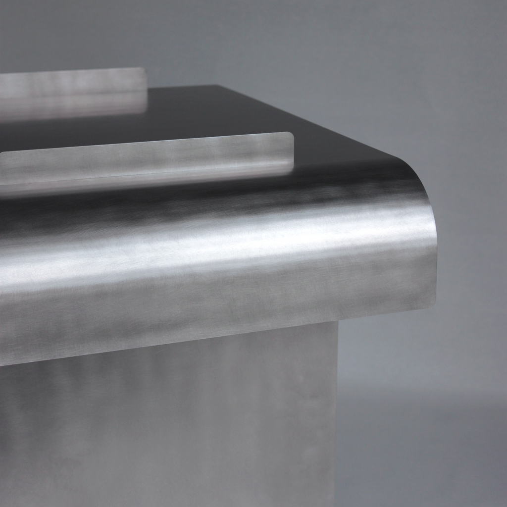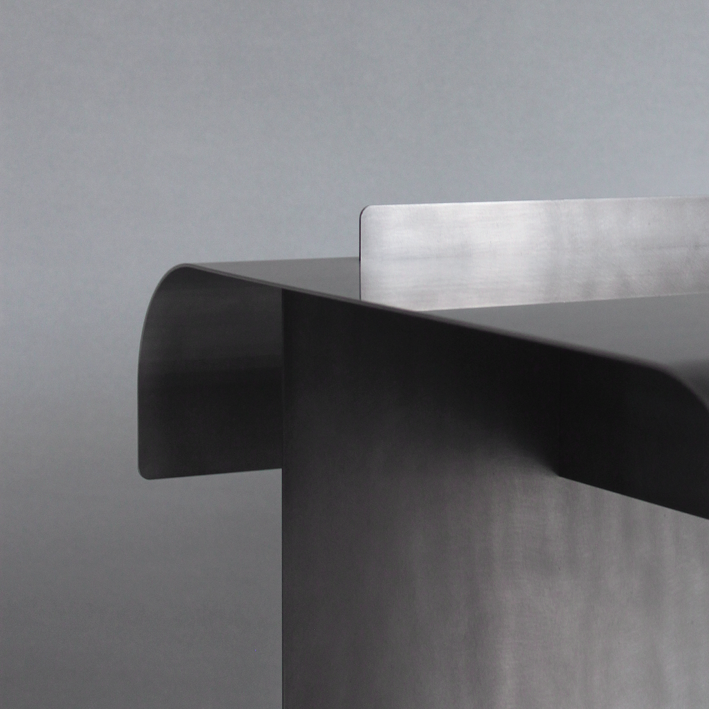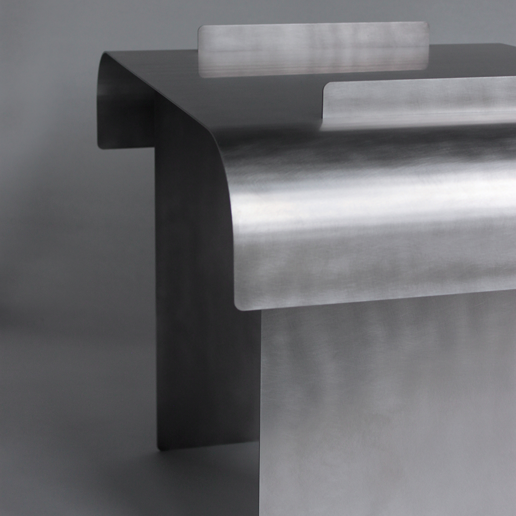Bend Small, 2018 is a stainless steel side table constructed without screws, welding or glue. Each plain of the table interlocks within another providing support and resulting in a form that can be easily assembled and disassembled. Curved sides of the table giving the table an approachable and friendly character. Whilst every detail is laser-cut for the perfect fit, every detail of the Bend table is later brushed by hand. The traces left on the surface show the human touch in its cloudy texture and let the surface play with the light and reflect its surroundings
