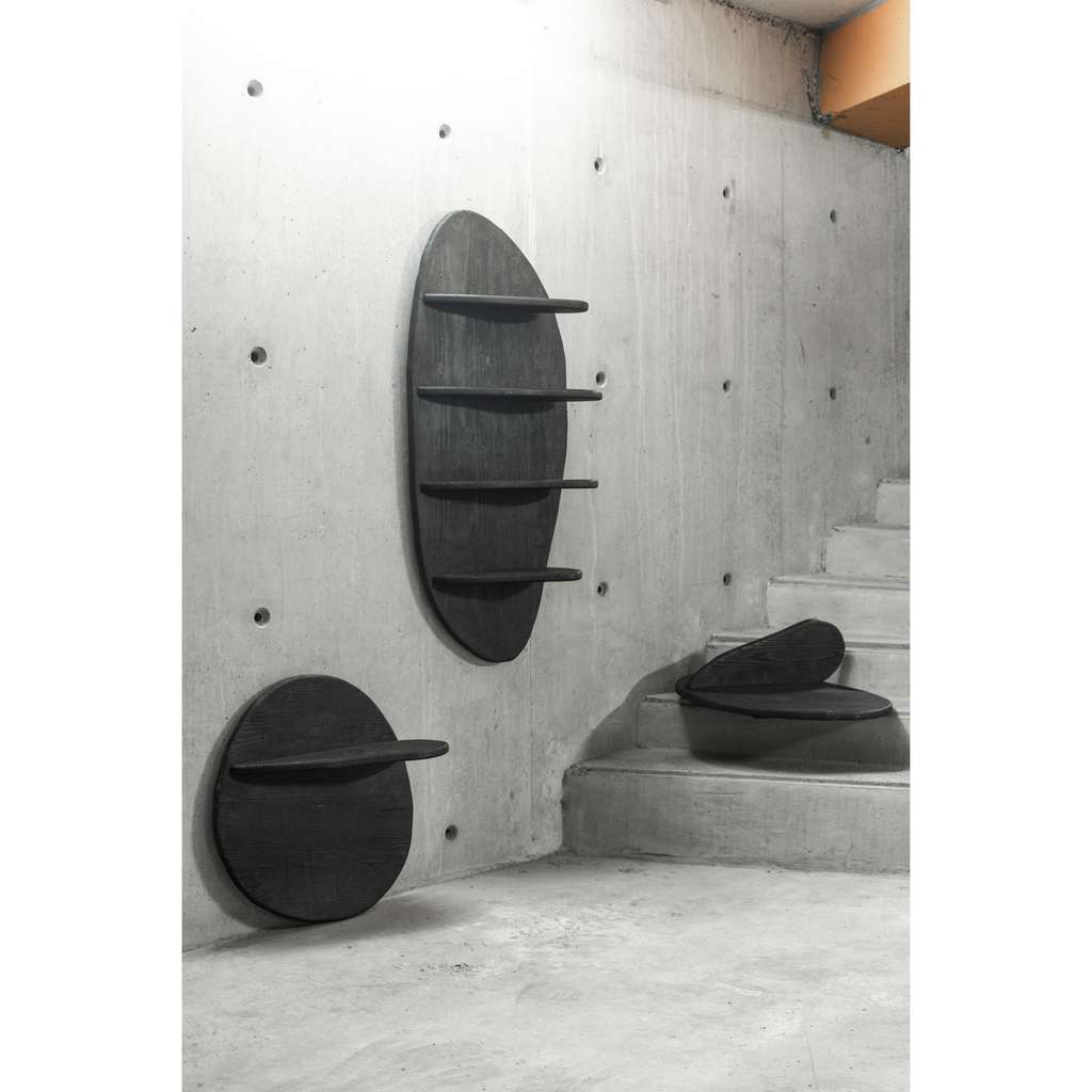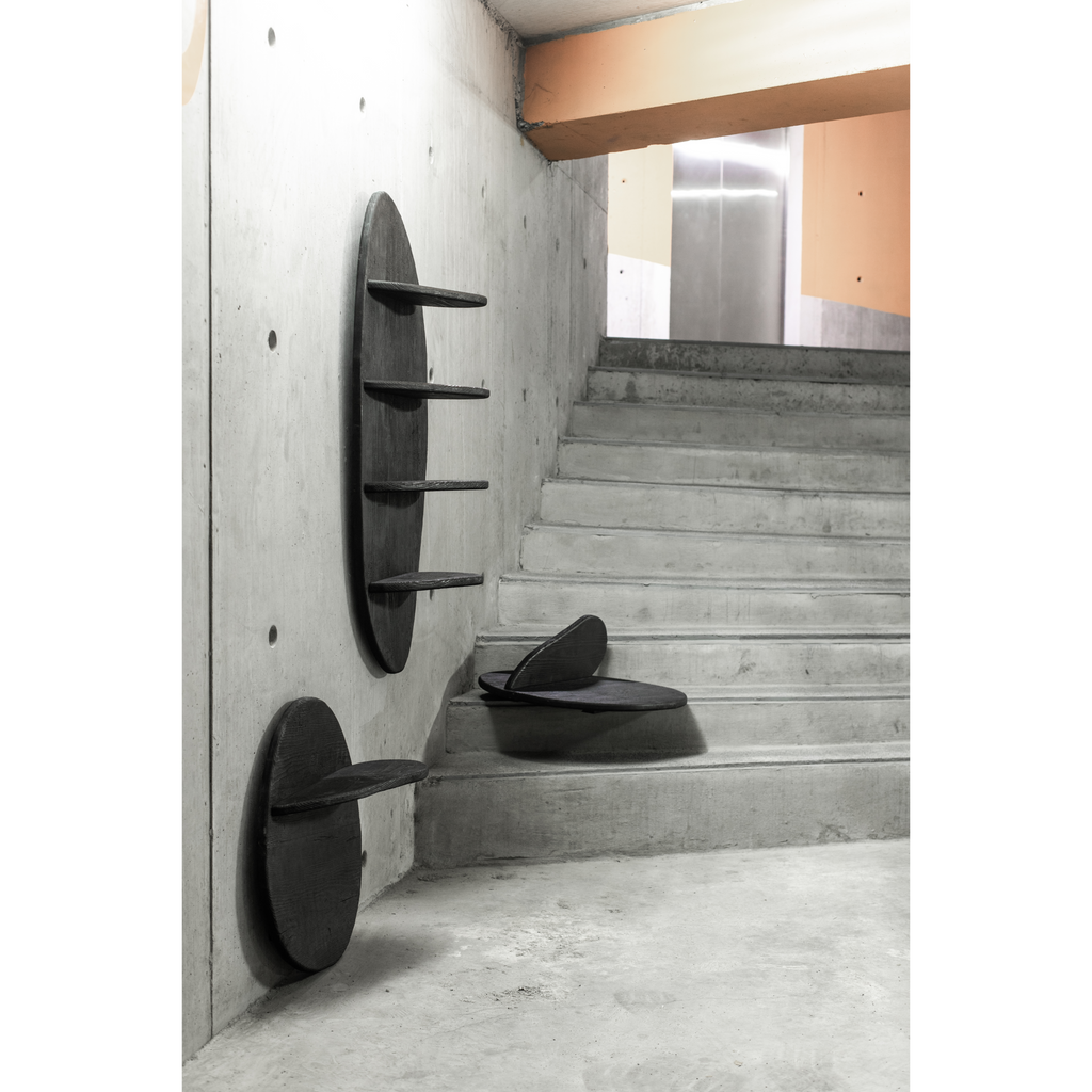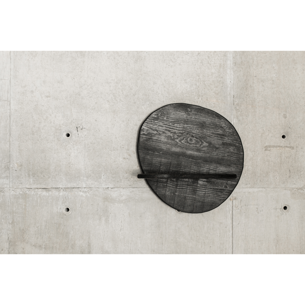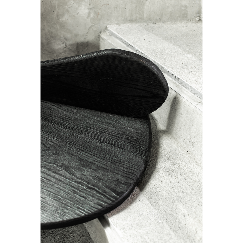 Inspired by organic shapes where elegance and simplicity converge. Characteristics and geometries are based on stones and balance. These pieces are an exploration of processes with rudimentary techniques such as wood burning, protecting and enhancing the beauty of the material. Solid pine wood, black finish applied by wood burning.