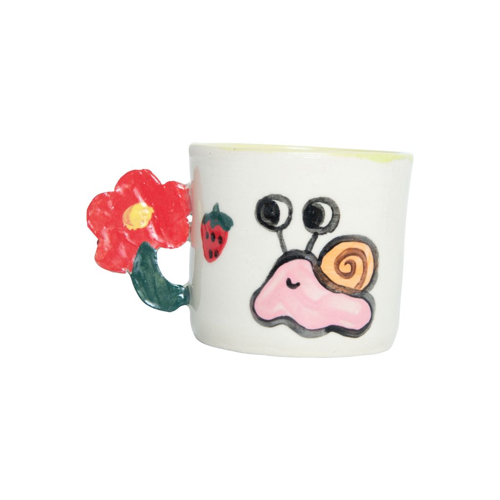 Snail Daisy Mug features red flower handle, snail paintings, and green inside glaze.