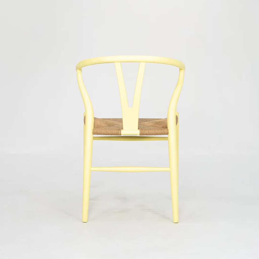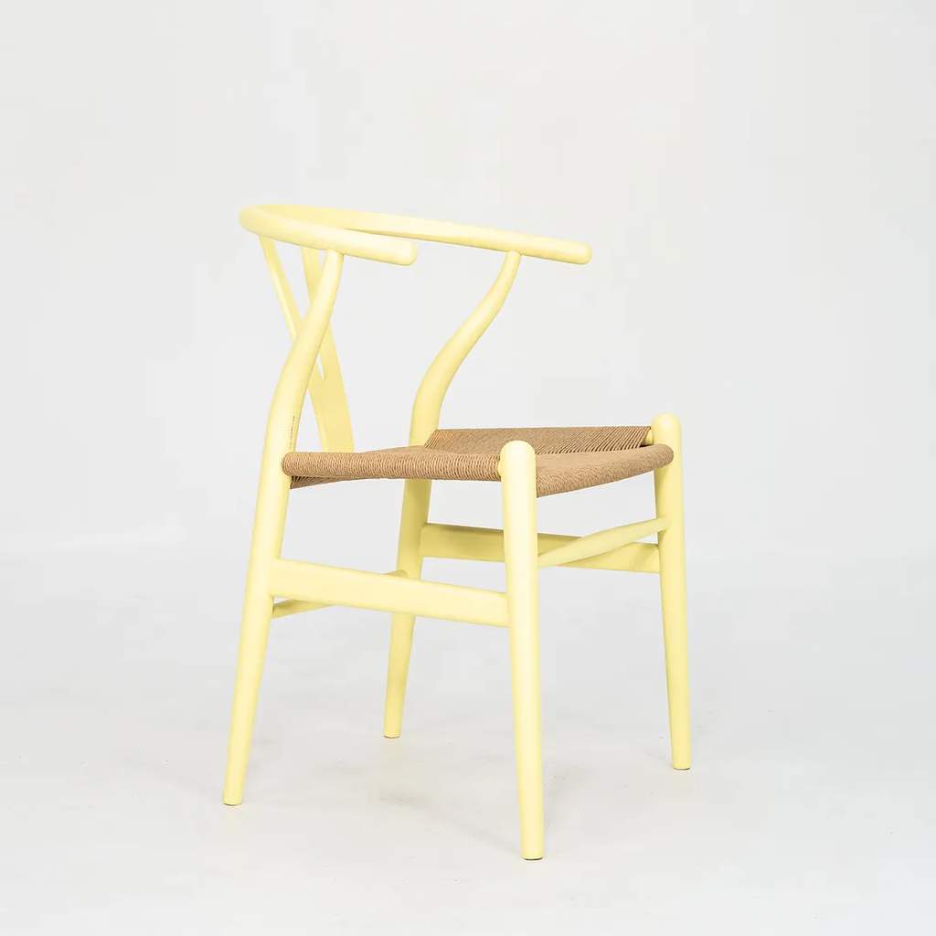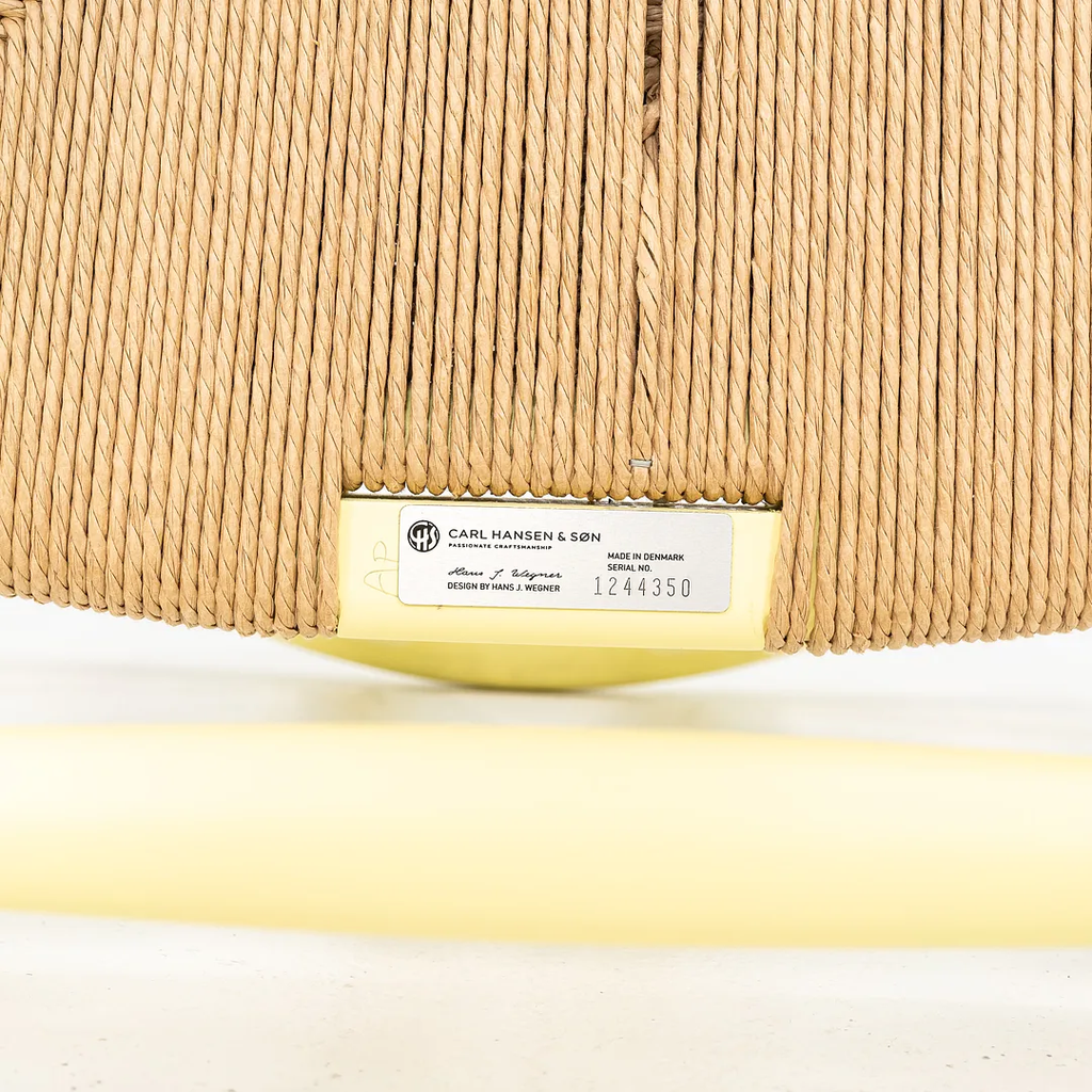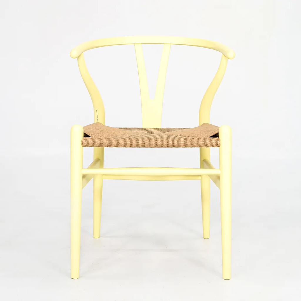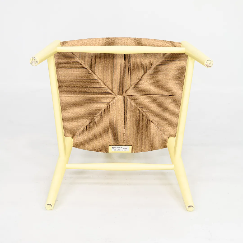 This is a CH24 Wishbone Dining Chair made with a solid beech wood frame, painted Hollyhock yellow, and a natural paper cord seat. This chair has an unmarked box, but appears to be in the Hollycock color by Ilse Crawford and Hans Wegner. The chair, designed by Hans Wegner and produced by Carl Hansen & Son in Denmark, dates to circa 2021 and is guaranteed as authentic. Condition is good with some very light wear. There is a cut mark on the back, but can be touched up prior to shipping if requested. See photos.