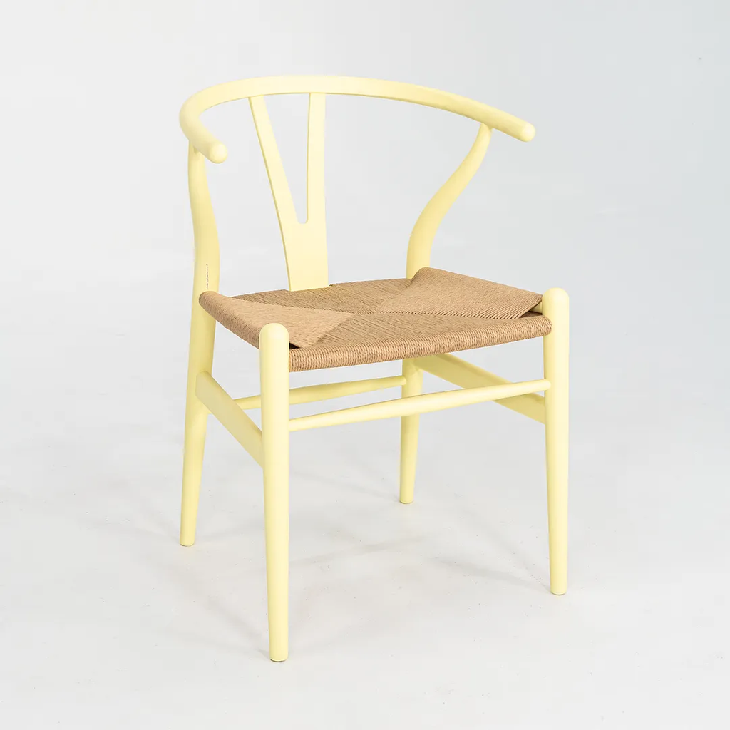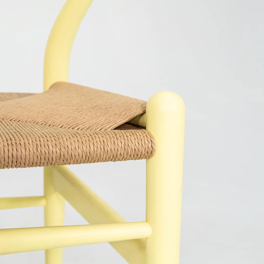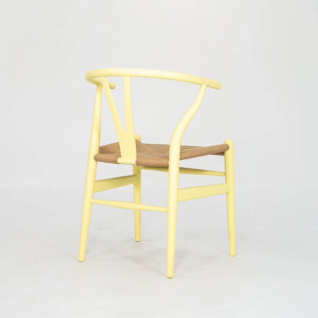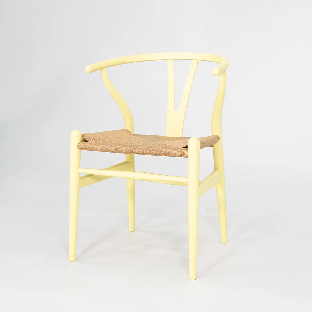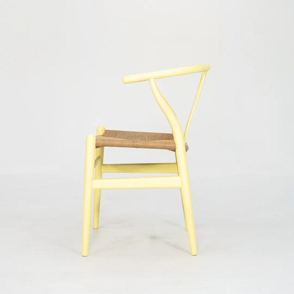 This is a CH24 Wishbone Dining Chair made with a solid beech wood frame, painted Hollyhock yellow, and a natural paper cord seat. This chair has an unmarked box, but appears to be in the Hollycock color by Ilse Crawford and Hans Wegner. The chair, designed by Hans Wegner and produced by Carl Hansen & Son in Denmark, dates to circa 2021 and is guaranteed as authentic. Condition is good with some very light wear. There is a cut mark on the back, but can be touched up prior to shipping if requested. See photos.