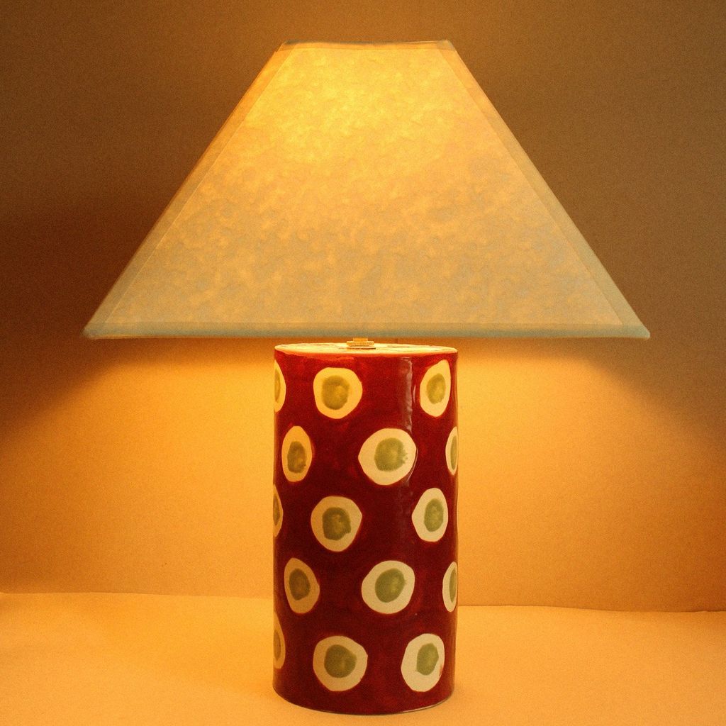 One-of-a-kind, hand-built and painted ceramic lamp in a deep burgundy glaze with sage green and cream dots; stamped. Custom square lampshade in natural paper parchment; brass clip-on.
