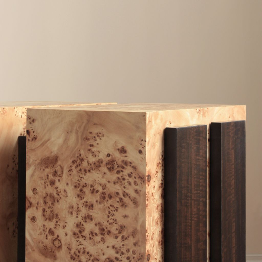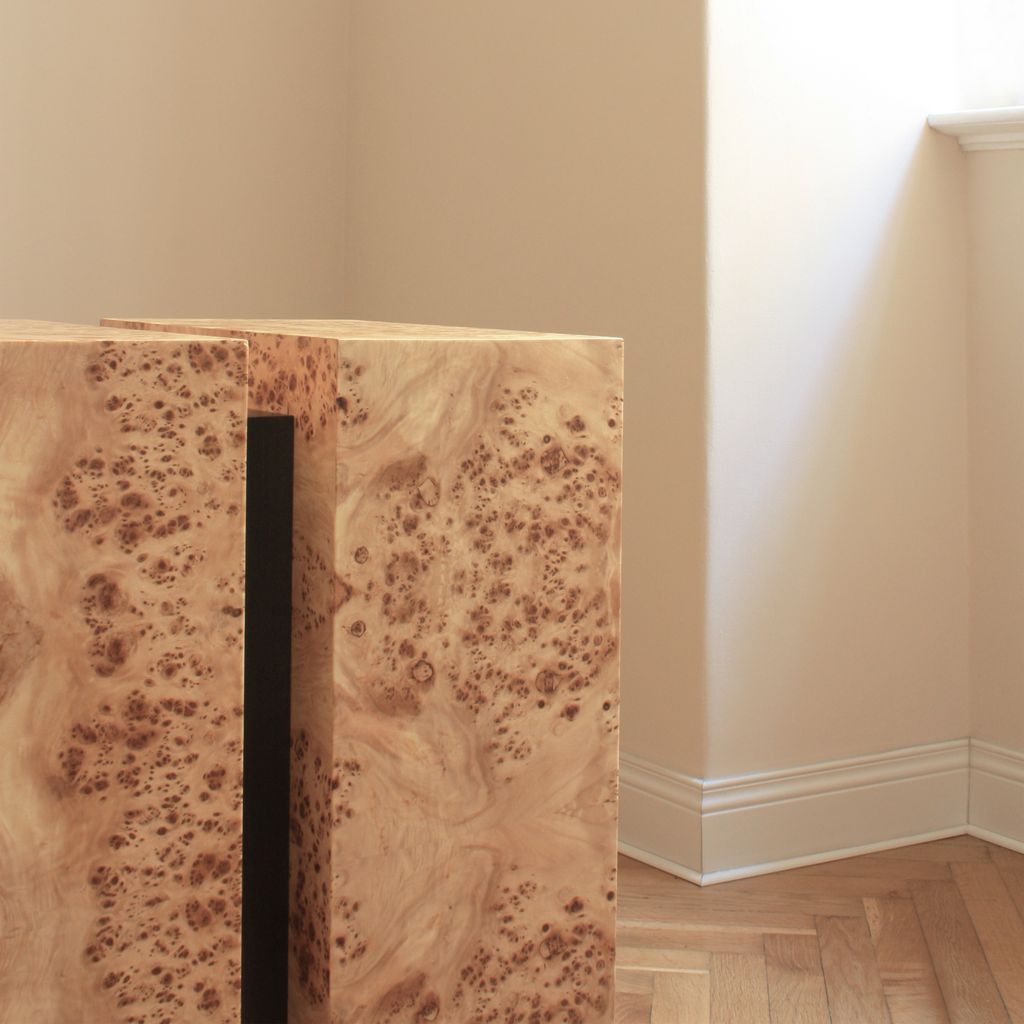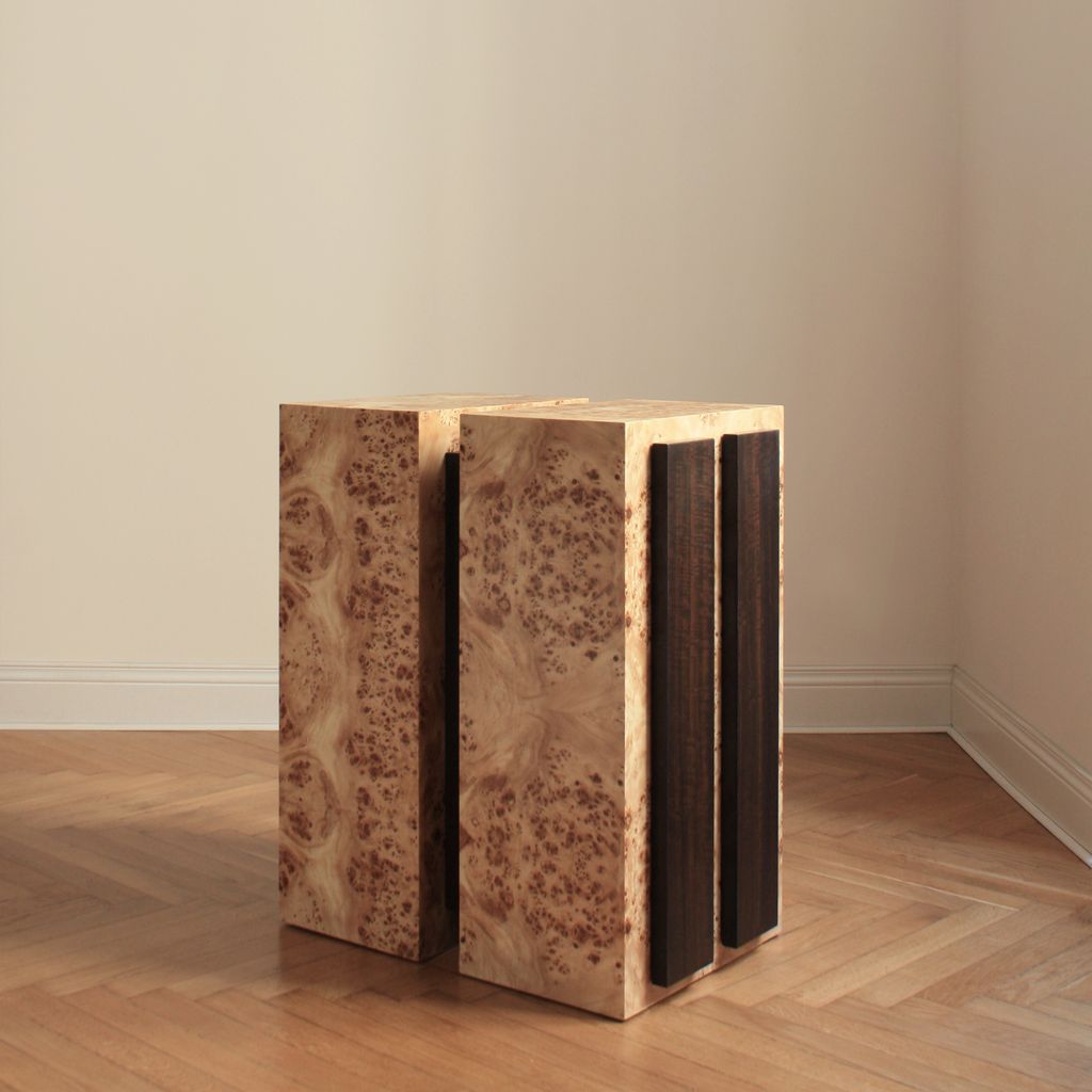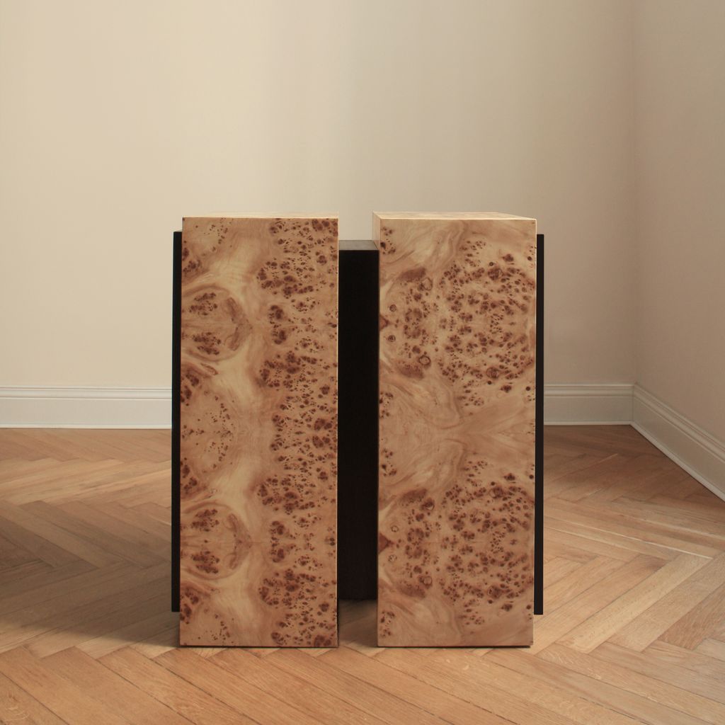 Premiered at COLLECTIBLE Brussels 2025 and at Salone del Mobile Milano 2025 - Salone Satellite. This side table is part of the Limited Edition of 50 pieces, characterised by bold proportions and purity of lines, counterbalanced by the texture richness of Poplar and Eucalyptus Frisè burl woods, as a subtle reframing of the Art Déco aesthetic. This side table features an intriguing eye-catching materiality, where the sought-after burlwood surfaces are rigorously smoothed by hand, respecting and preserving the wood's natural qualities and texture richness. The refined artisanal process, the heritage of high-end Italian cabinet-making tradition, results in the rhythm of the exquisite pattern, where contrasts and nuances are carefully framed by the strict layout of the object's prospects.