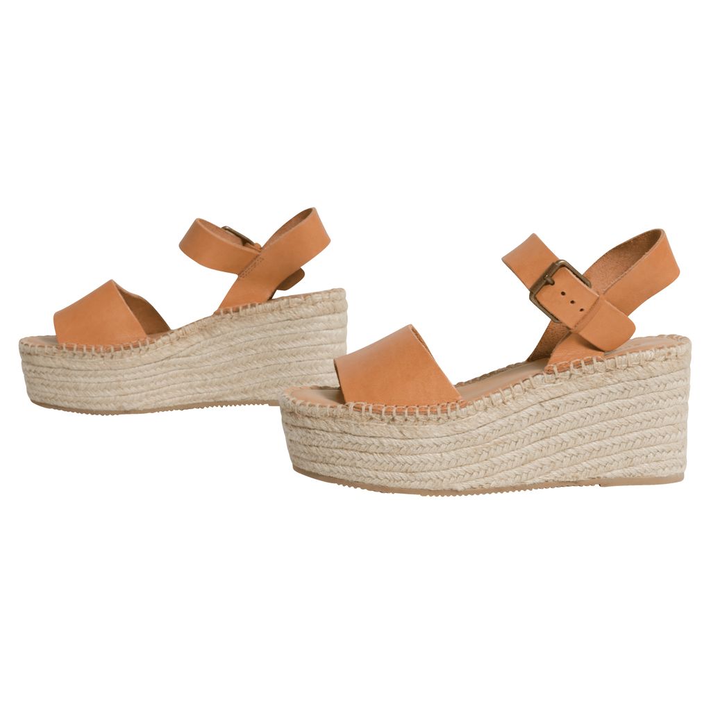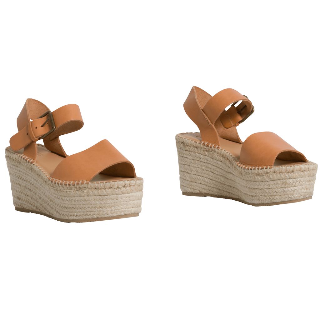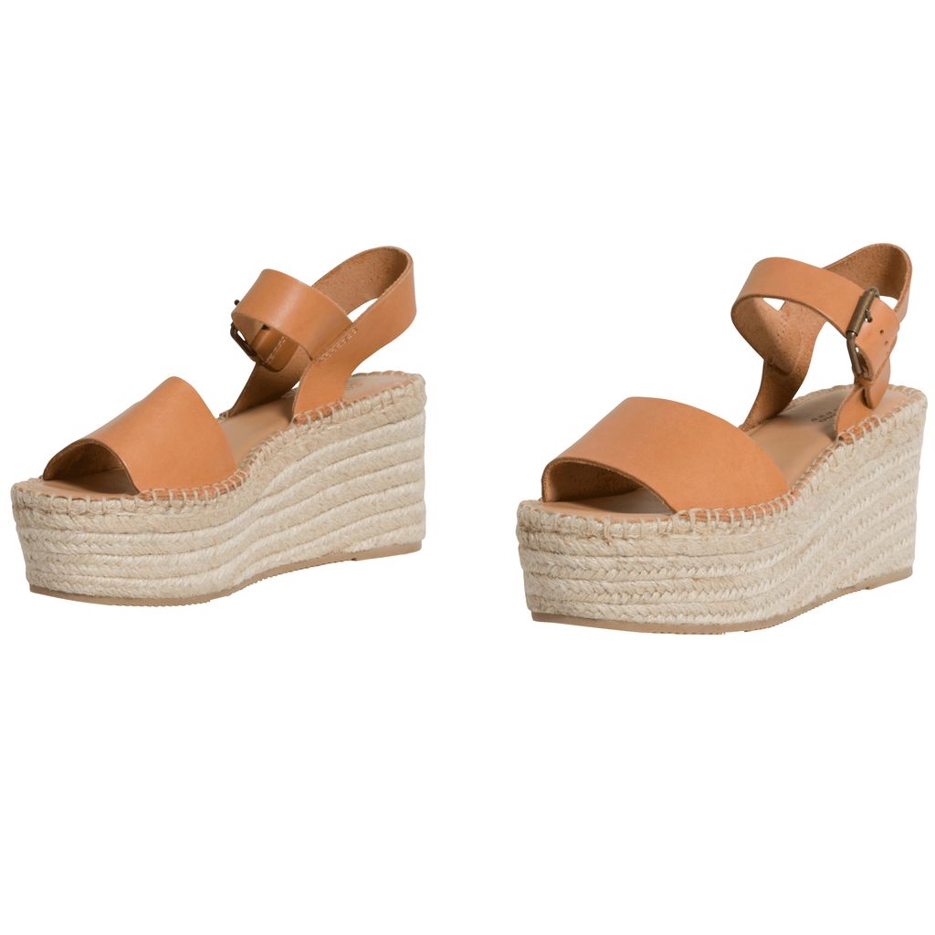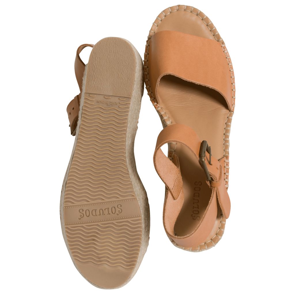 These open toe wedge sandals from Soludos feature a braided espadrilles platform, ankle strap buckle closure and rubber sole. In very good condition.