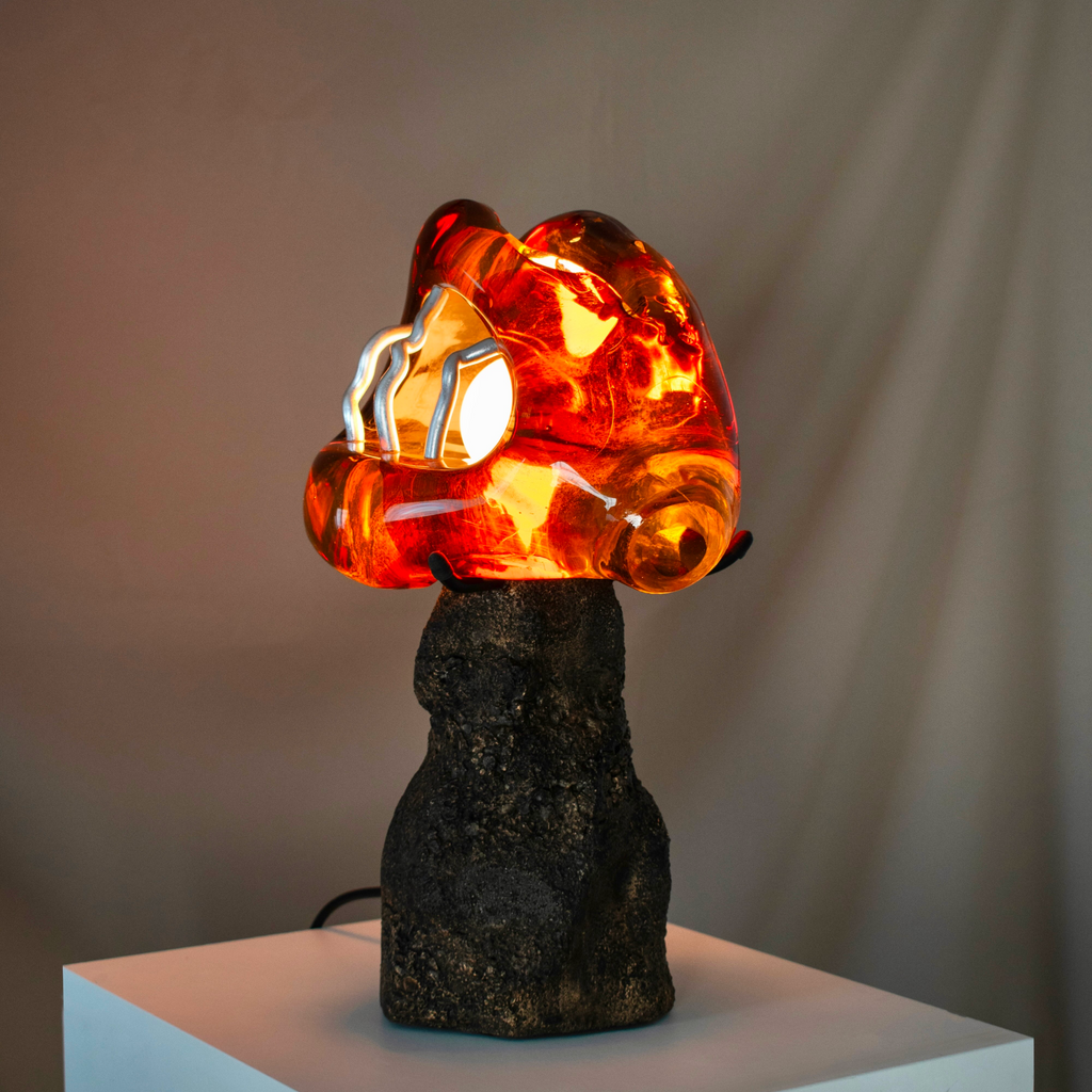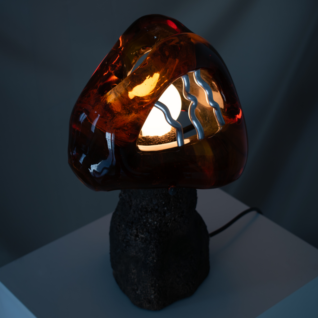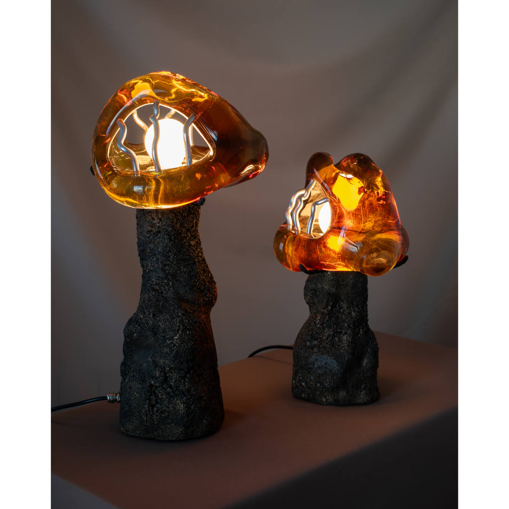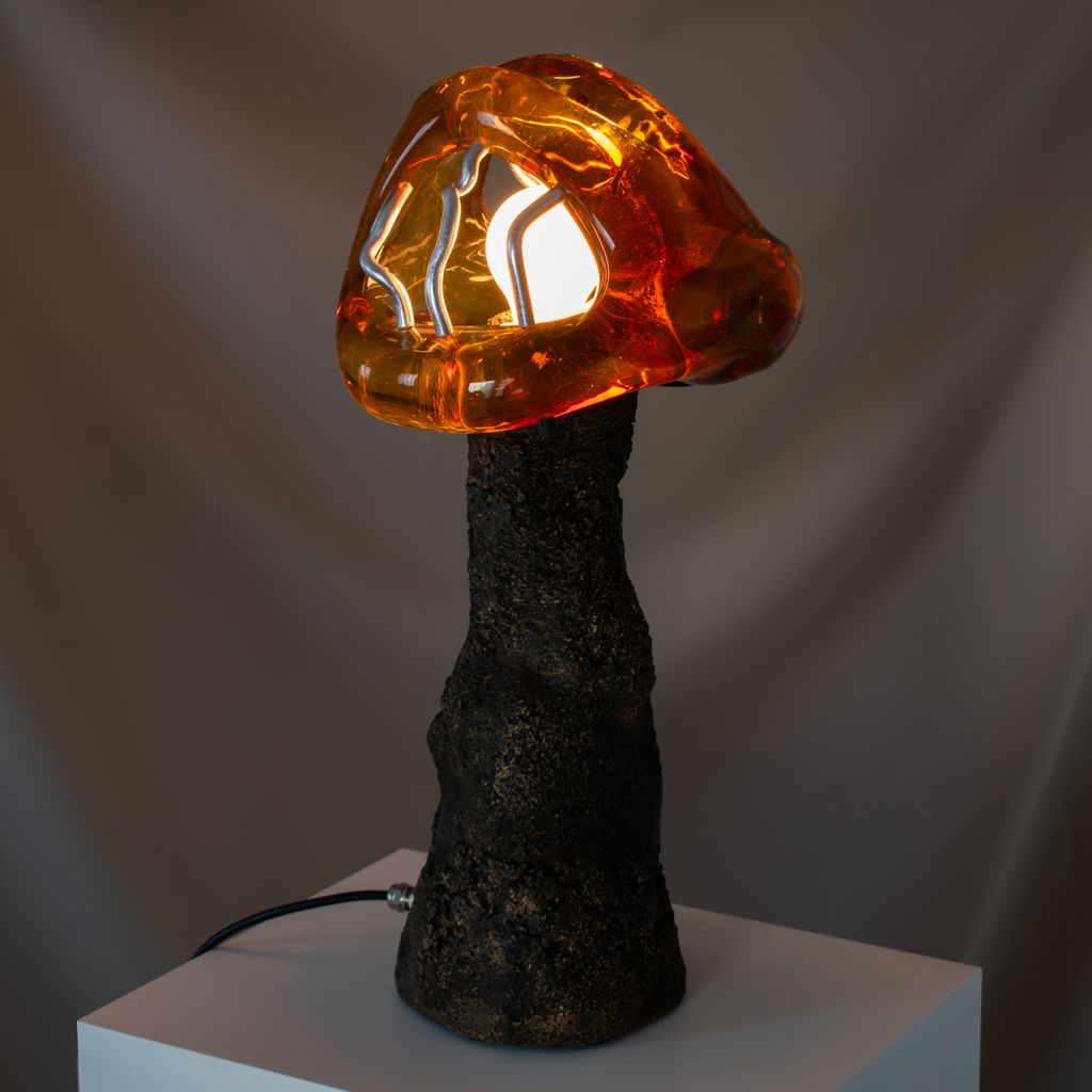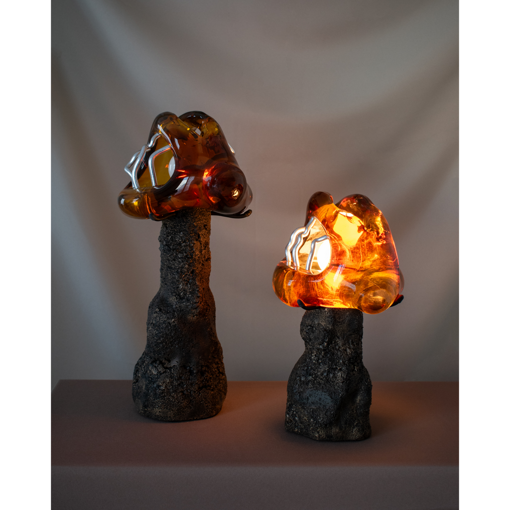 Somehow Honey Dreams Of Fire consists of two handcrafted table lamps. The solid glass lampshades are crafted by French glassmakers. True to the studio’s philosophy, the lamps feature organic characteristics and are designed as companions, pieces you grow attached to and keep over time. Entirely handcrafted, these pieces combine patinated concrete, solid glass, aluminium leaves and steel.